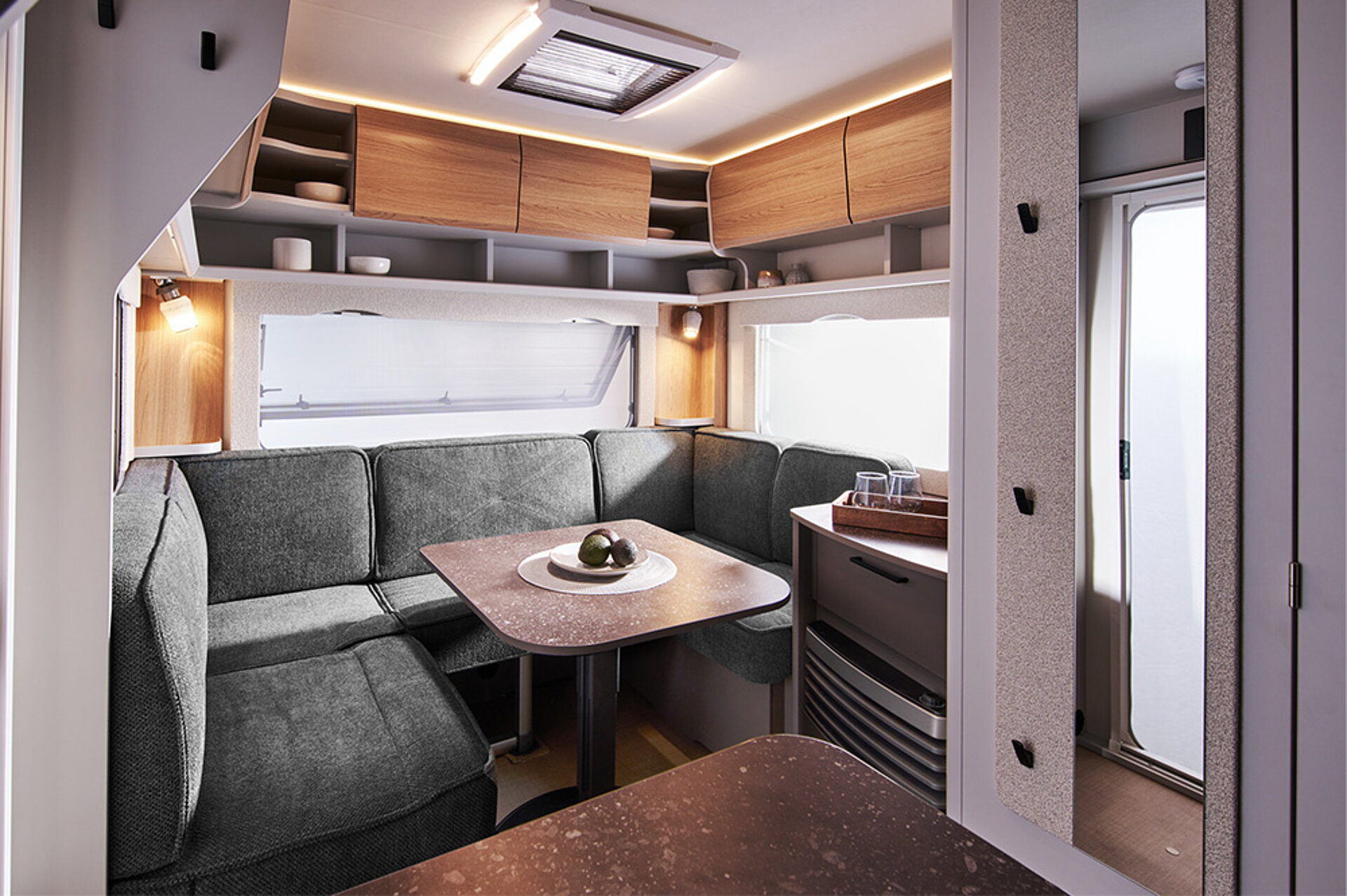 Der Wohnwagen ist dein Zuhause auf Rädern – mit einer gemütlichen Sitzgruppe, bequemen Betten, einer multifunktionalen Küche und einem Badezimmer mit Toilette und Dusche.