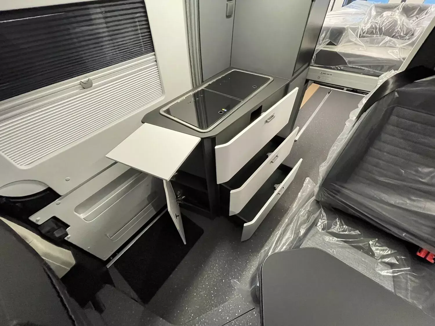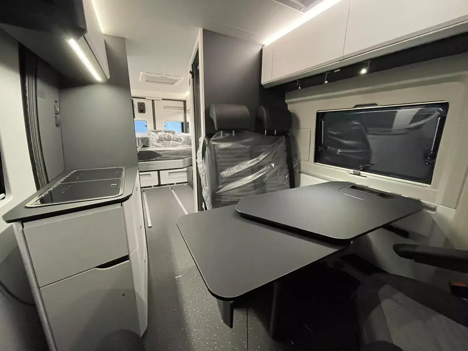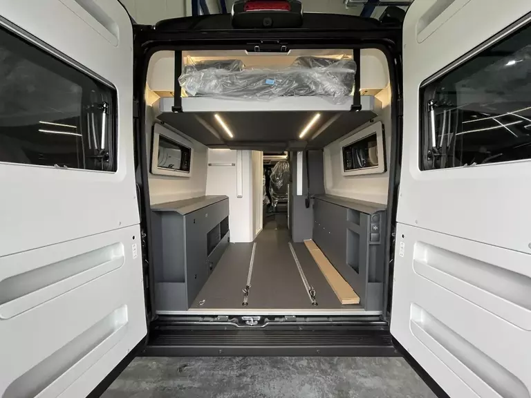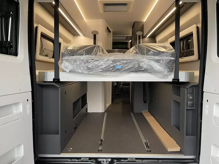 Kit DELUXE (Einparkhilfe hinten, Falt-Verdunkelung Fahrerhaus Wohnraum-Seitenfenster, Fliegenschutz an Schiebetür, Einstiegsstufe elektrisch, Einstiegsbeleuchtung, LED-Ambientebeleuchtung, Lade-Booster, Abwassertank isoliert und beheizbar, Abwasserablassventil elektrisch, Abdeckung Kocher und Spüle, Tisch mit Ausdreherweiterung und Becherhalterung), Paket SAFETY + STYLE PLUS (Regen- und Licht-Assistent, Notbrems-Assistent mit Fußgängererkennung, Spurhaltewarn-Assistent, Verkehrszeichen-Assistent (mit Tempomat-Geschwindigkeits-Anpassung), Fahrermüdigkeitserkennung, Geschwindigkeits-Assistent adaptiv mit Stop&Go; (Stau-Assistent), Klimaautomatik Fahrerhaus, Handbremse elektrisch, Lenkrad in Lederoptik, 7"-Instrumentenanzeige digital, 16"-Leichtmetall-Felgen, Lackierung Stoßfänger vorne, Nebelscheinwerfer), 10"-DAB-Naviceiver, Multifunktionslenkrad mit Radiofernbedienung, Rückfahrkamera)), LED Frontscheinwerfer, Solar Anlage, Sonnenschutz-Markise, MACH PLUS App, Panoramafenster vorne zum Öffnen, Zusatzluftfederung hinten)