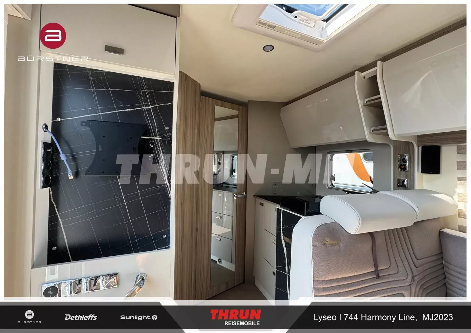 - Indirekte Beleuchtung unter den Dachoberschränken Sitzgruppe Fahrerseite, Küche und Heckbett