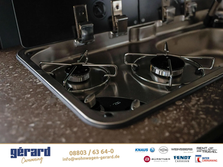 2-Flammen-Kocher mit integrierter Spüle und separater Glasabdeckung