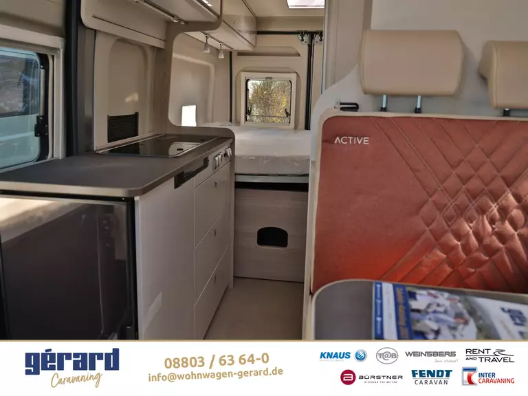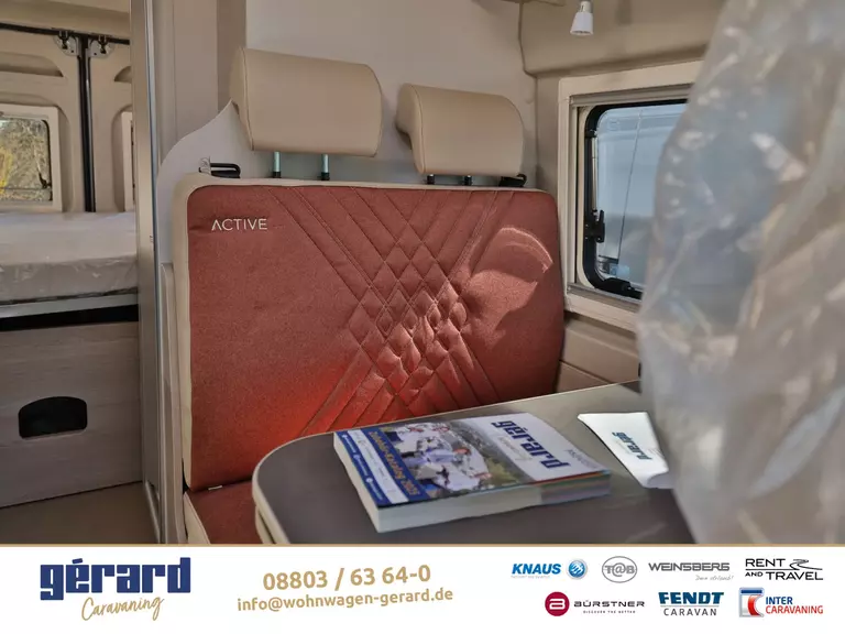 - Active Paket (nur mit Auflastung auf 3.500 kg light - nicht i.V. mit Black Forest Paket) (Alufelgen 16 Zoll für 3.500 kg Fahrgestell, Alurahmenfenster, Polster mit eigener Steppung "Active", Sonderproduktgrafik "Active")