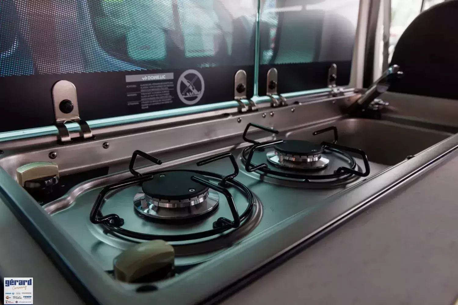 2-Flammen-Kocher mit integrierter Spüle und separater Glasabdeckung