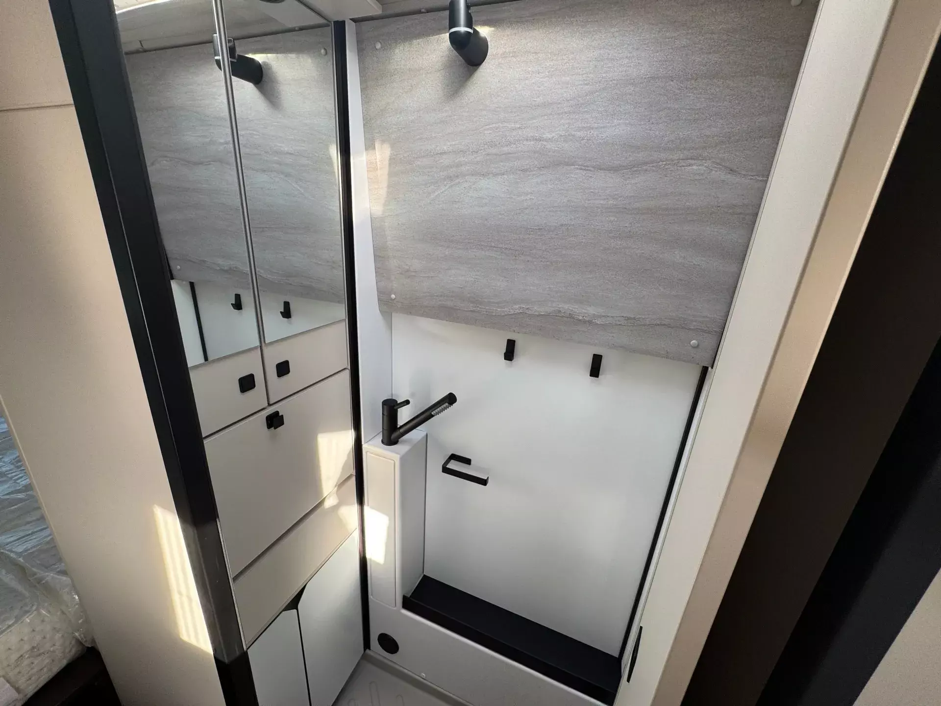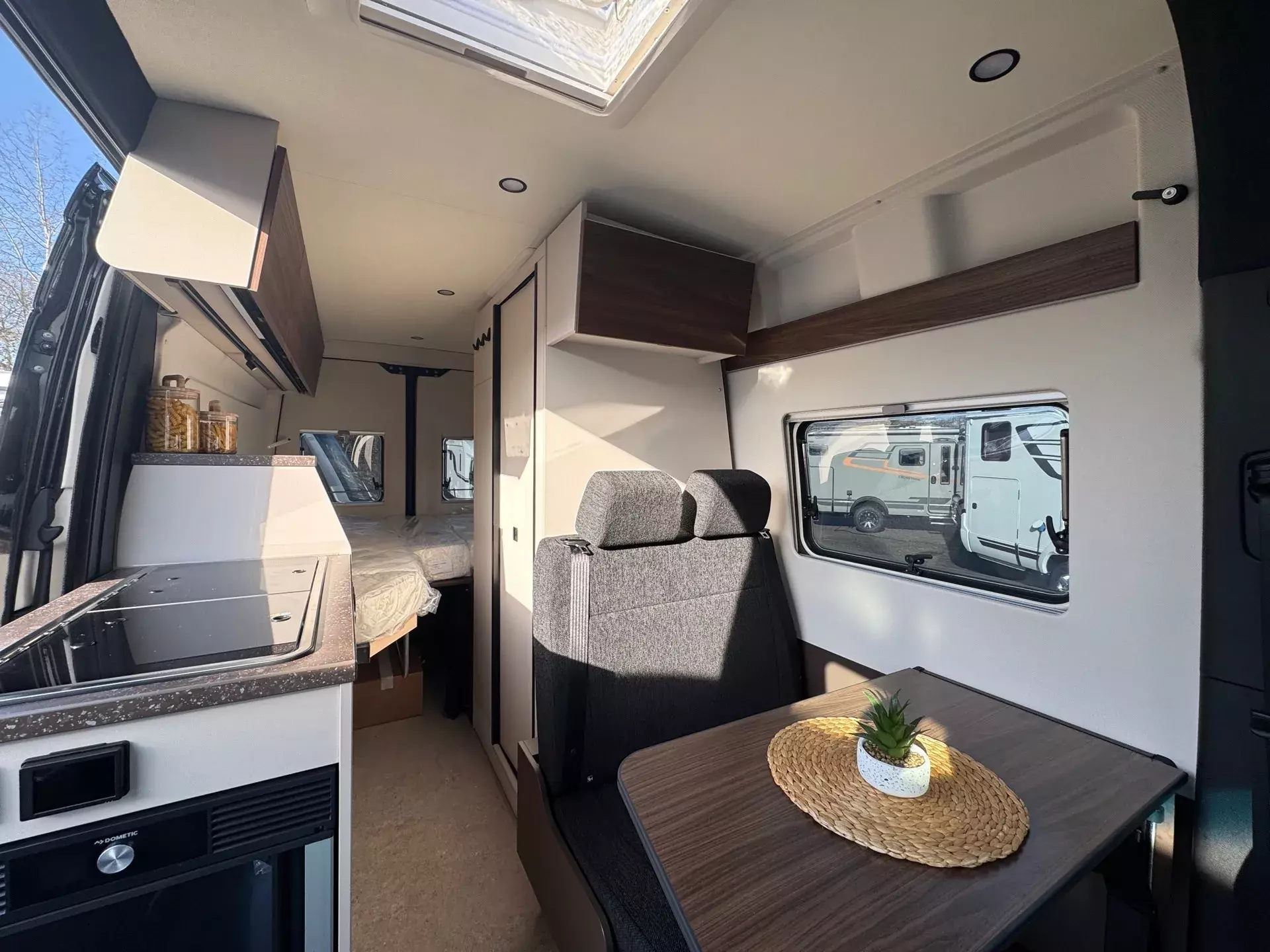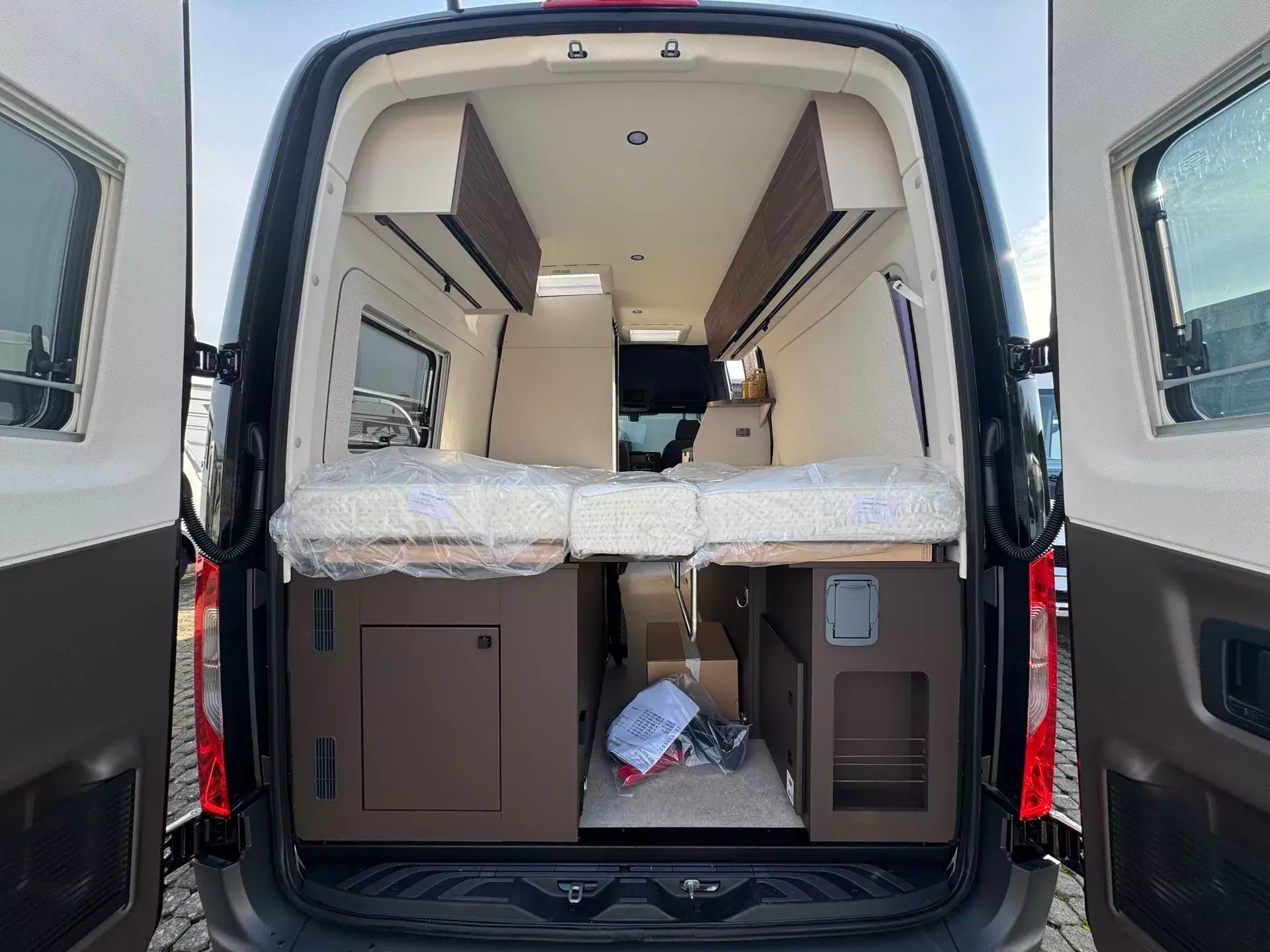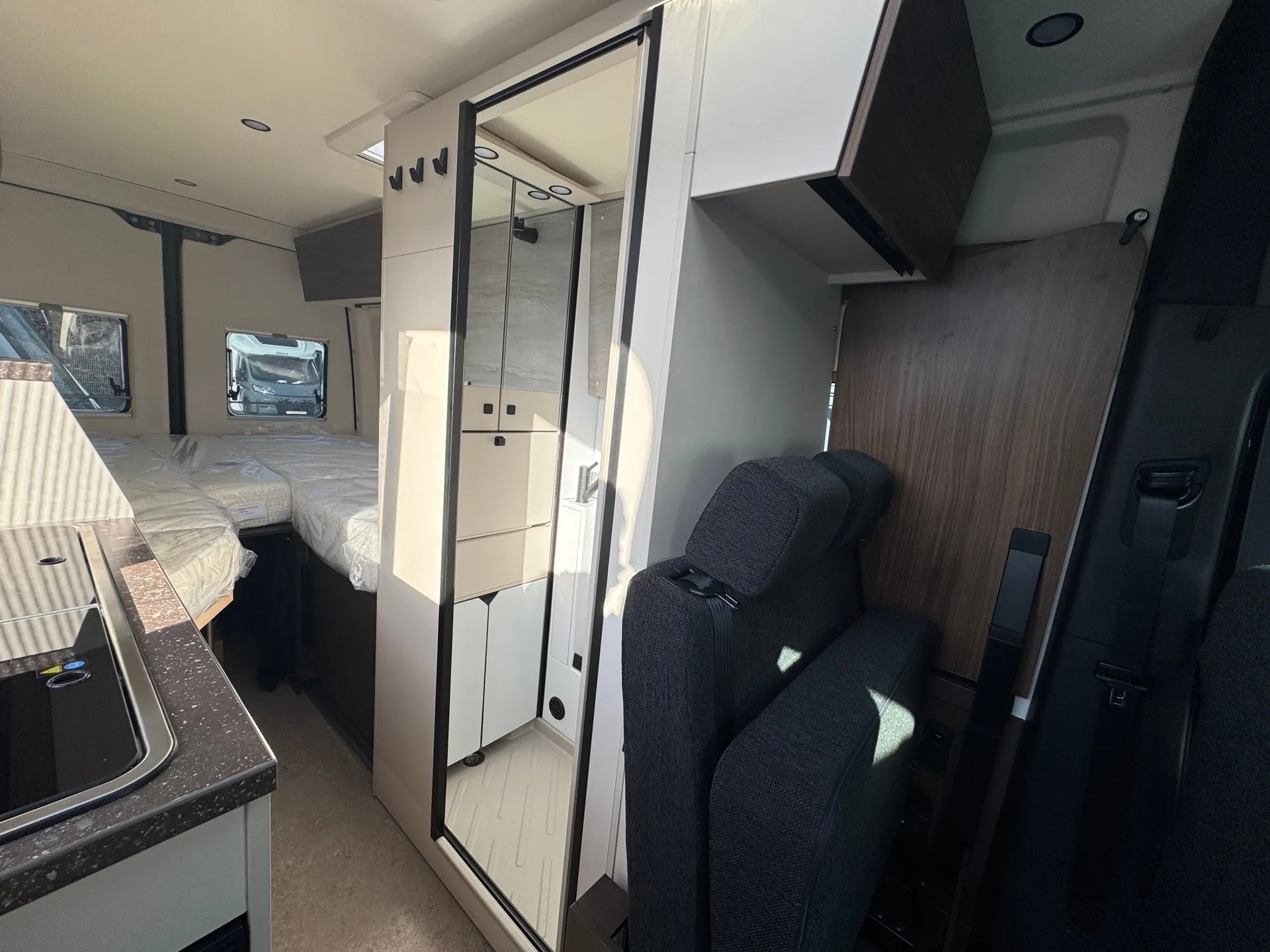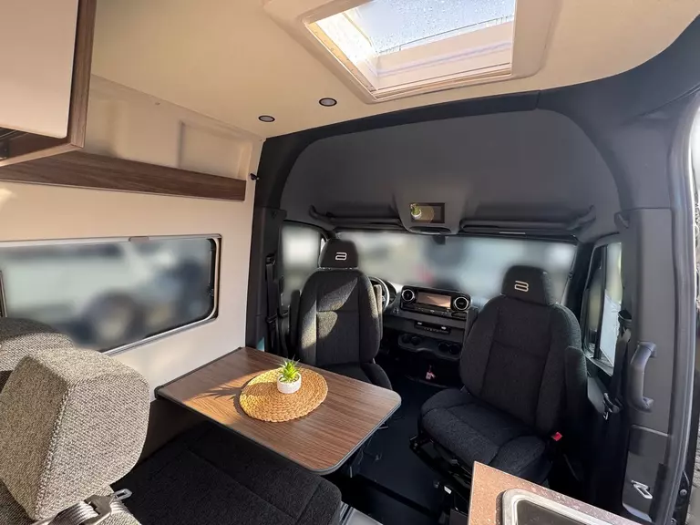 -Komfort-Pack Aufbau (Innenverkleidung stoffbezogen, Fahrerhausverdunkelung, Cassettenplissees Front- und Seitenscheiben, Fliegenschutzplissee für Schiebetür, Zusatzmatratze für Liegewiese, Küchen-Erweiterung, Rahmenfenster, Lithium - Batterie - 100 Ah, Ambiente-Beleuchtung)