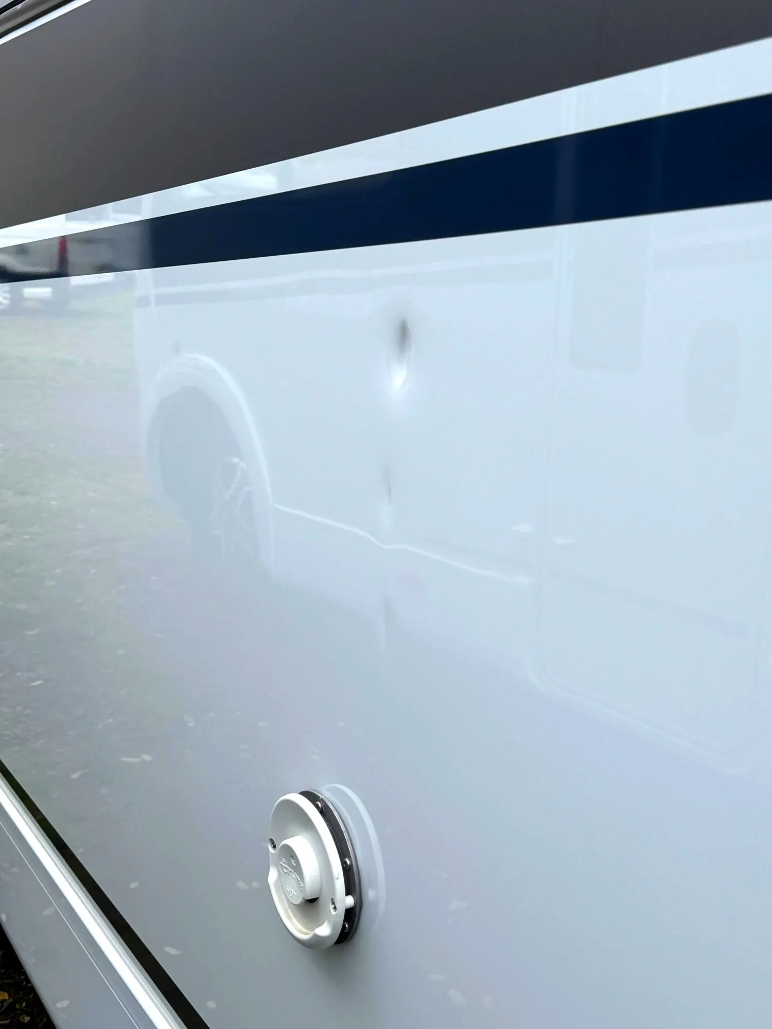 Das Reisemobil hat in Fahrtrichtung links an der Seitenwand drei Dellen, da ein Pavillon dagegen geflogen ist.