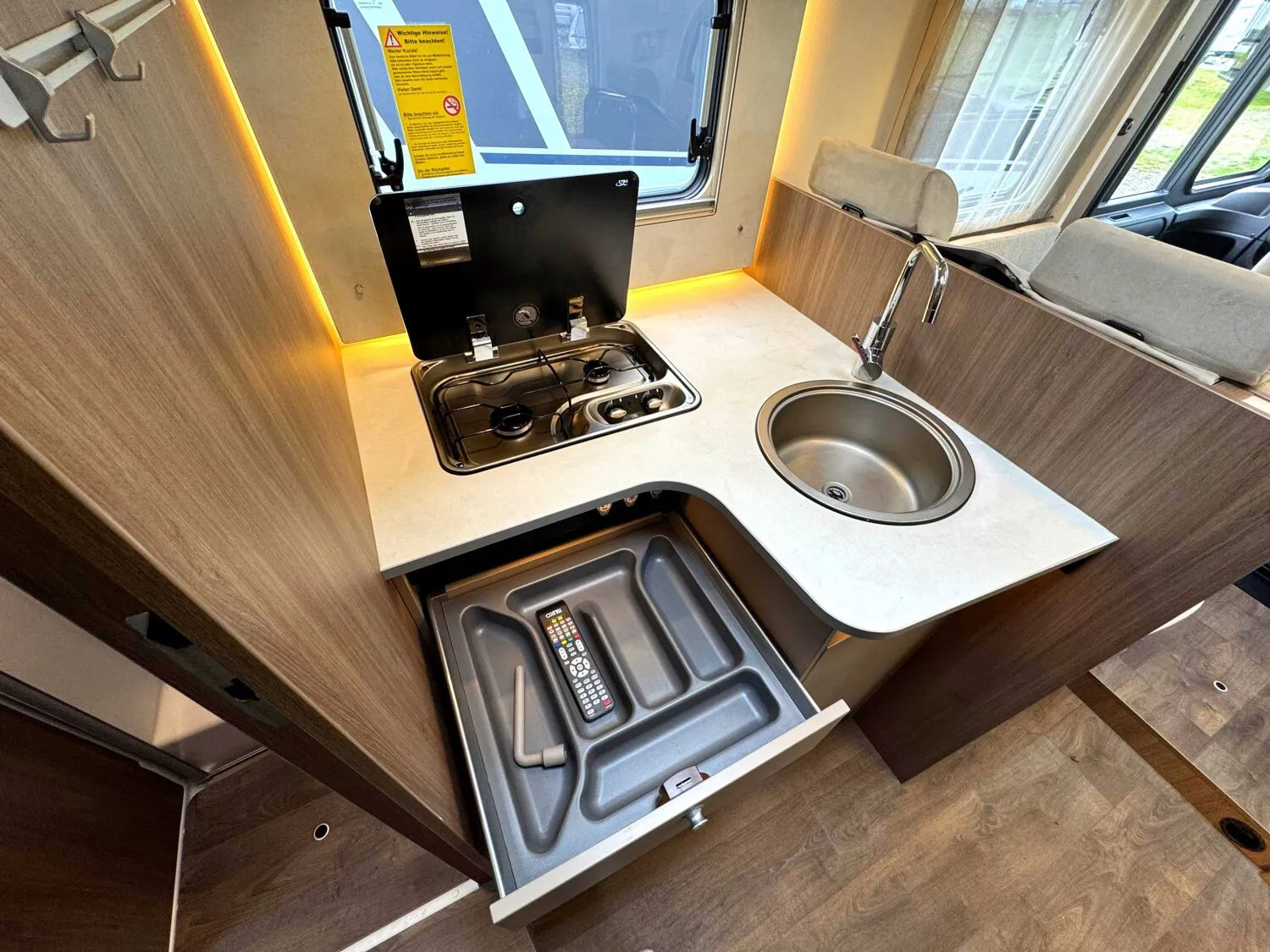 - pro+ Paket (Basic Paket, Style Paket, 16" Alufelgen, Großer Kühlschrank 156 l mit separatem Frosterfach 29 l, Abwassertank isoliert, Rahmenfenster, Markise 5 m, TV Paket (22" Flachbildschirm + Halter, Satantenne Flatsat Classic 65), Design Applikation Heck, 2. Außenstauraumklappe (Größe modellabhängig), Beklebung pro+)