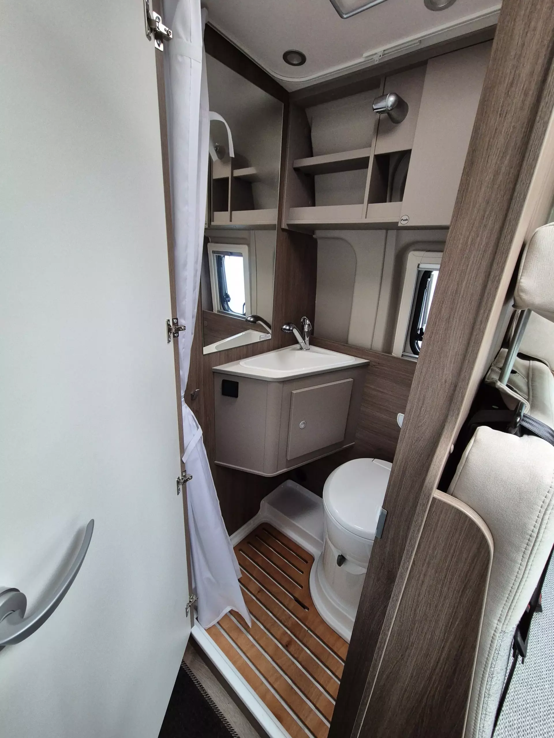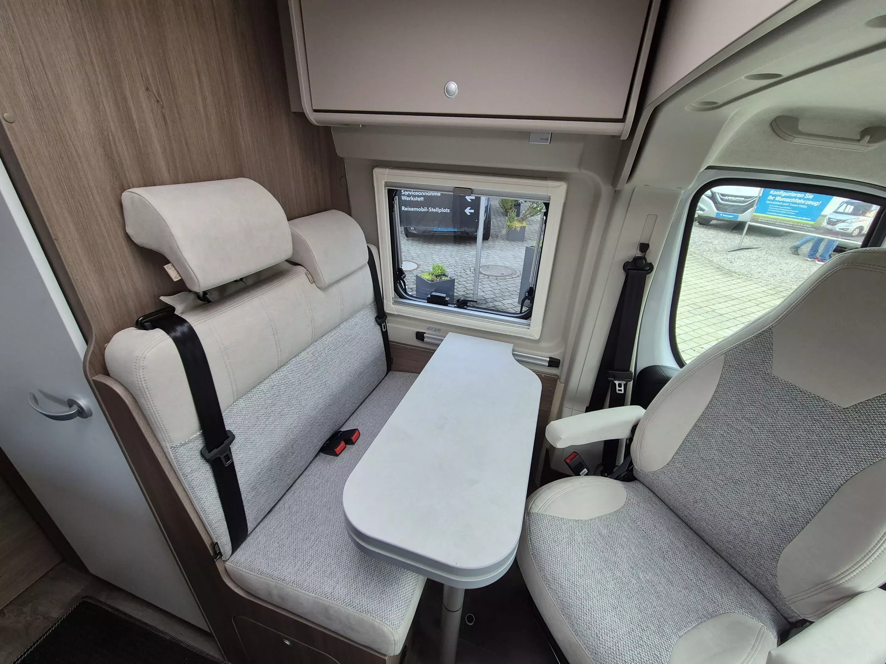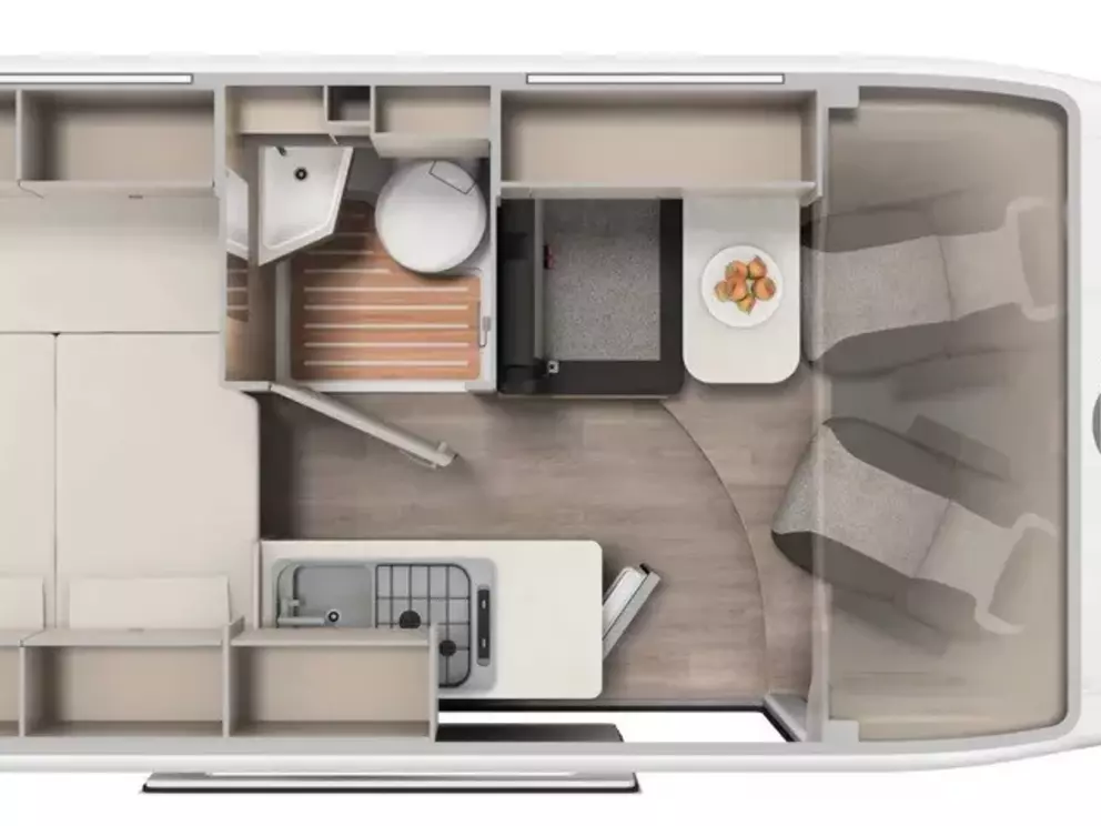- Basic Paket: Dachhaube Midi Heki 70 x 50 cm über Sitzgruppe ; Duschausstattung; Fenster im Bad ; Kleiderstange in der Nasszelle ; Breite Einstiegsstufe ; Drehplatte für Tischerweiterung an der Sitzgruppe
