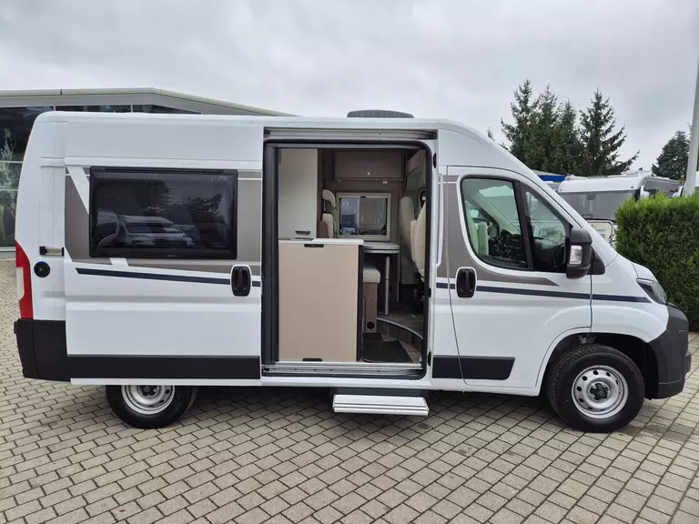 Der CV540 Entry-Van ist das ideale Fahrzeug für alle, die maximale Freiheit auf minimalem Raum suchen – kompakt, wendig und mit allem ausgestattet, was man für spontane Touren braucht. Der Peugeot Boxer 2.2 BlueHDi (140 PS, Euro 6E) mit 6-Gang-Schaltgetriebe bietet ein kraftvolles und gleichzeitig effizientes Fahrerlebnis. Das Fahrzeug überzeugt mit praktischem Querbett, durchdachtem Stauraumkonzept und modernem Interieur in der Wohnwelt Weiß. Dank Heckgarage, Seitensitzgruppe, Klimaanlage und Gasheizung bist du in jeder Jahreszeit komfortabel unterwegs. Das Basic-Paket bringt sinnvolle Extras wie Dachhaube Midi-Heki, Duschausstattung, Fenster im Bad, Kleiderstange in der Nasszelle, breite Einstiegsstufe und drehbare Tischerweiterung. Zusätzlich ist das Fahrzeug bereits mit USB-Steckdose, Kabelvorbereitung für Solaranlage und Rückfahrkamera ausgestattet – perfekt vorbereitet für den Alltag und lange Touren.
