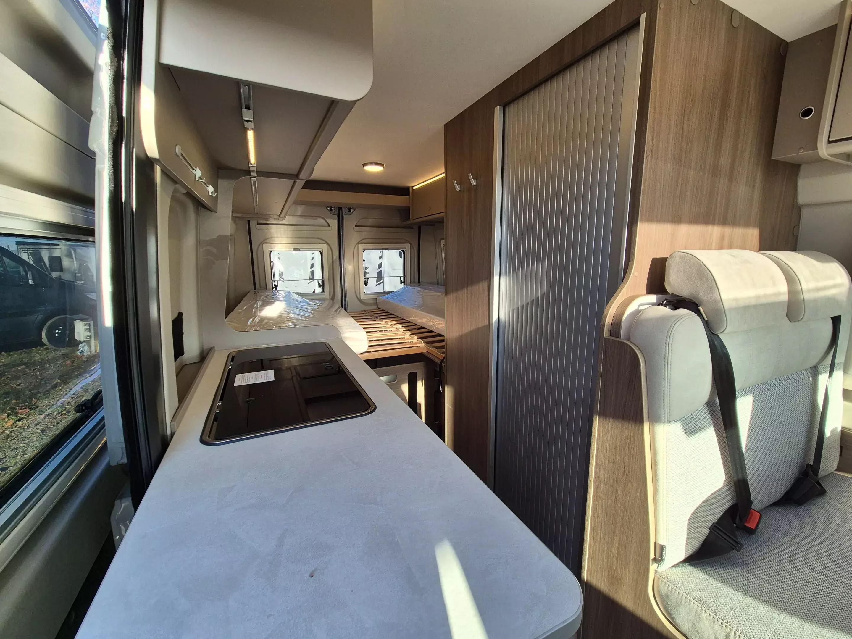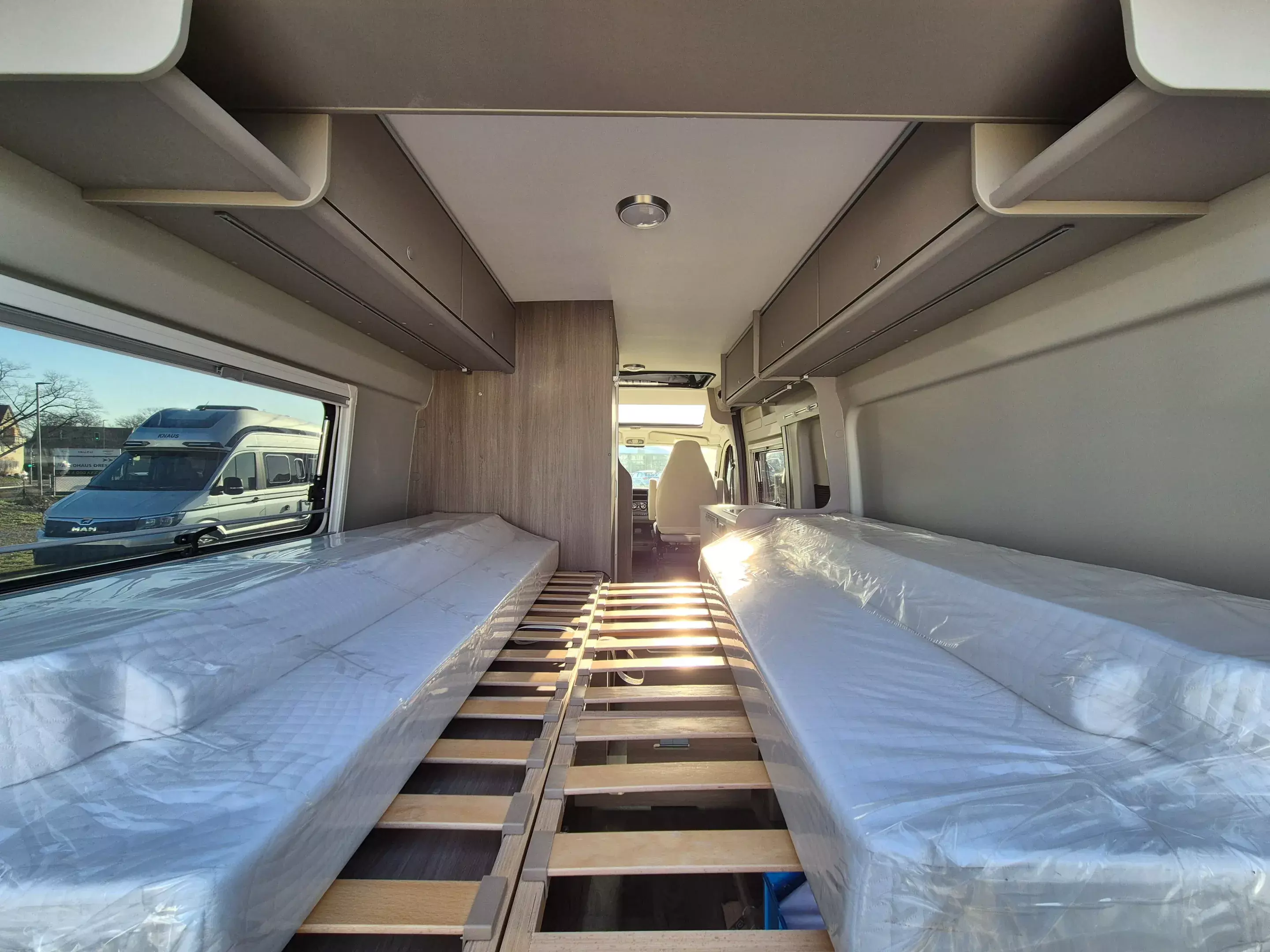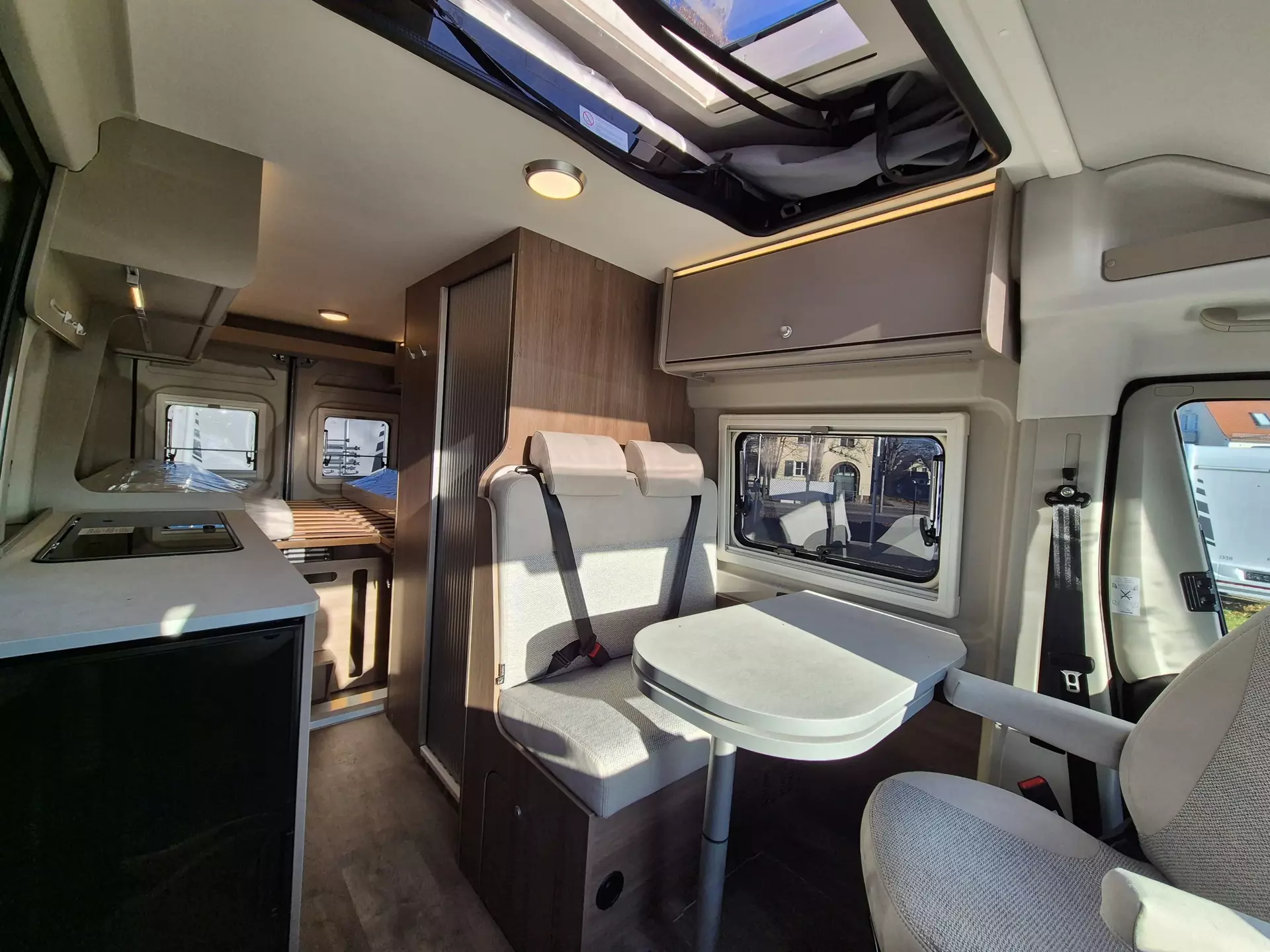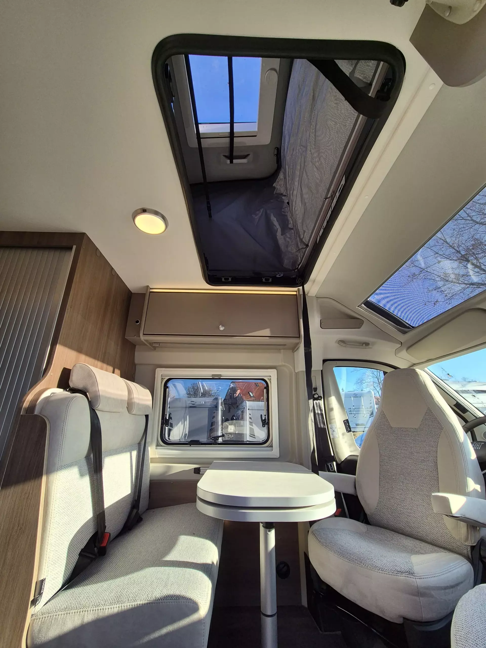 - Basic Paket (Dachhaube Midi- Heki 70 x 50 cm über Sitzgruppe, Duschausstattung (Brausekopf ausziehbar, Duschvorhang, Führungsschiene, Brausehalter), Fenster im Bad, Kleiderstange in der Nasszelle, Breite Einstiegsstufe, Drehplatte für Tischerweiterung an der Sitzgruppe)