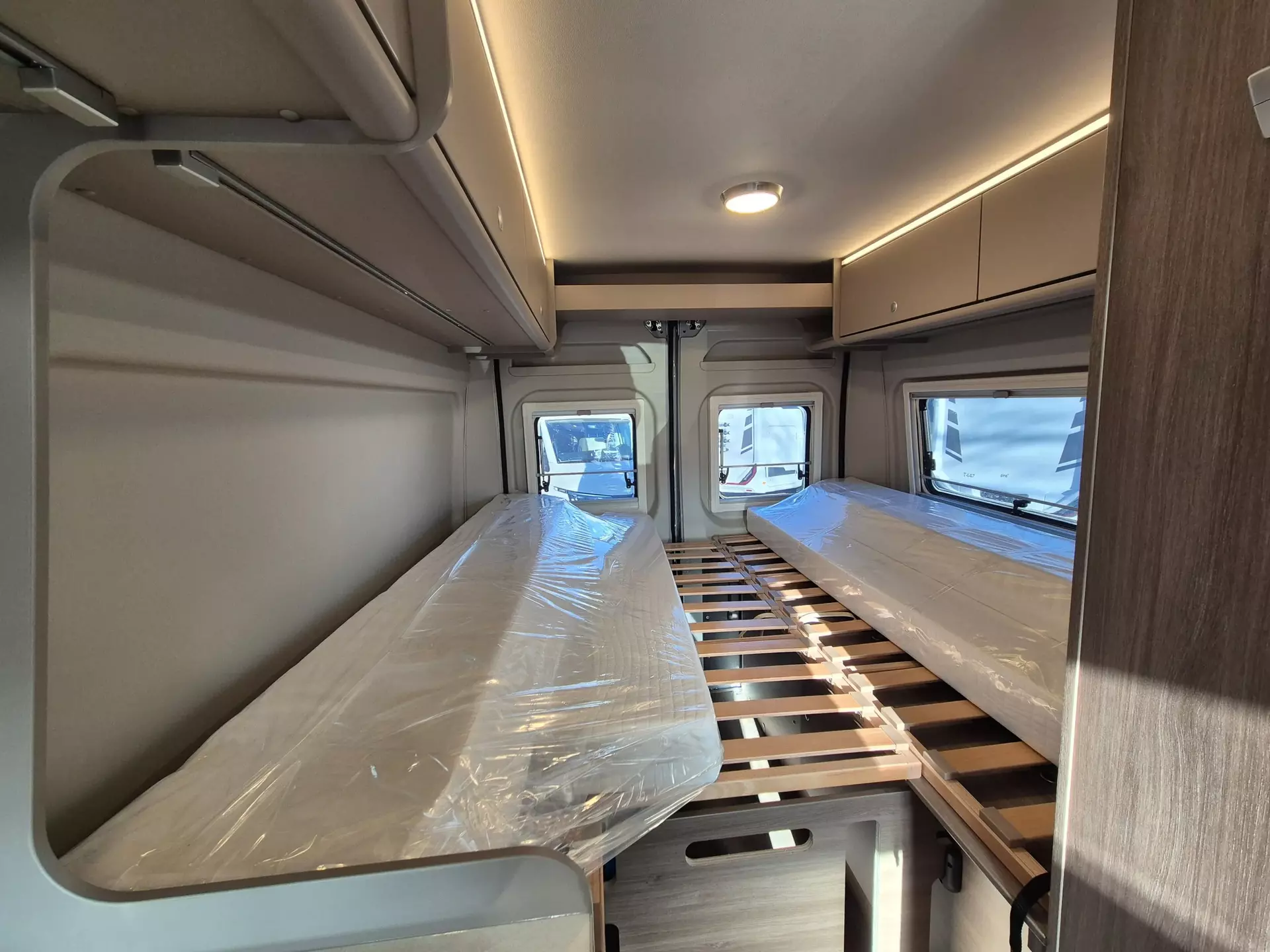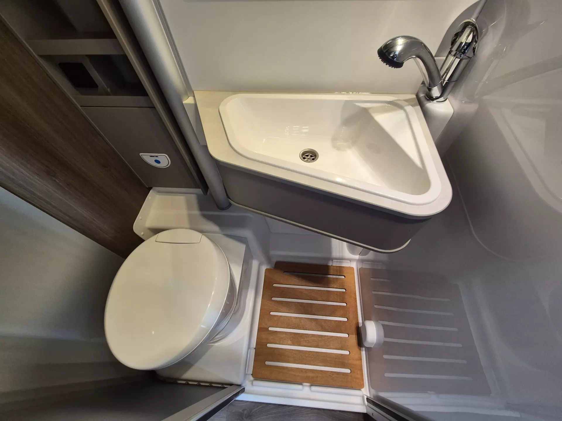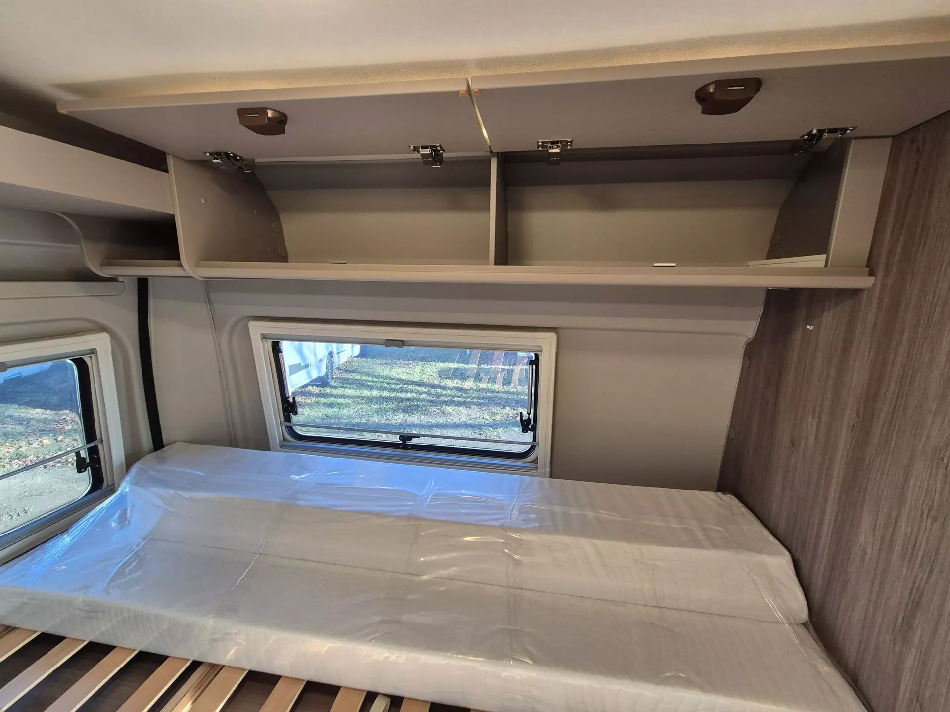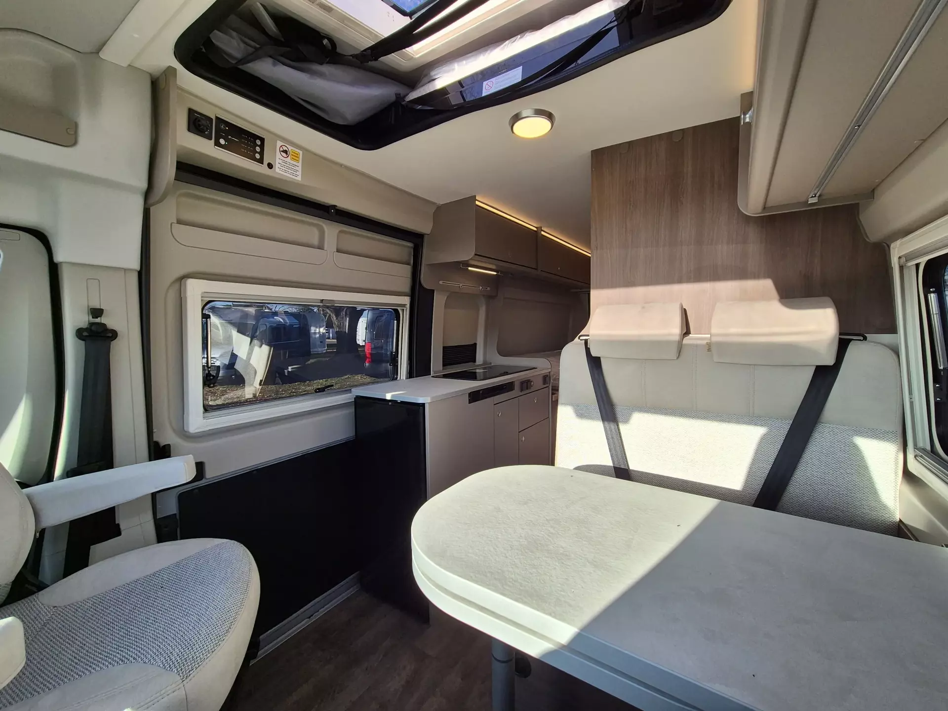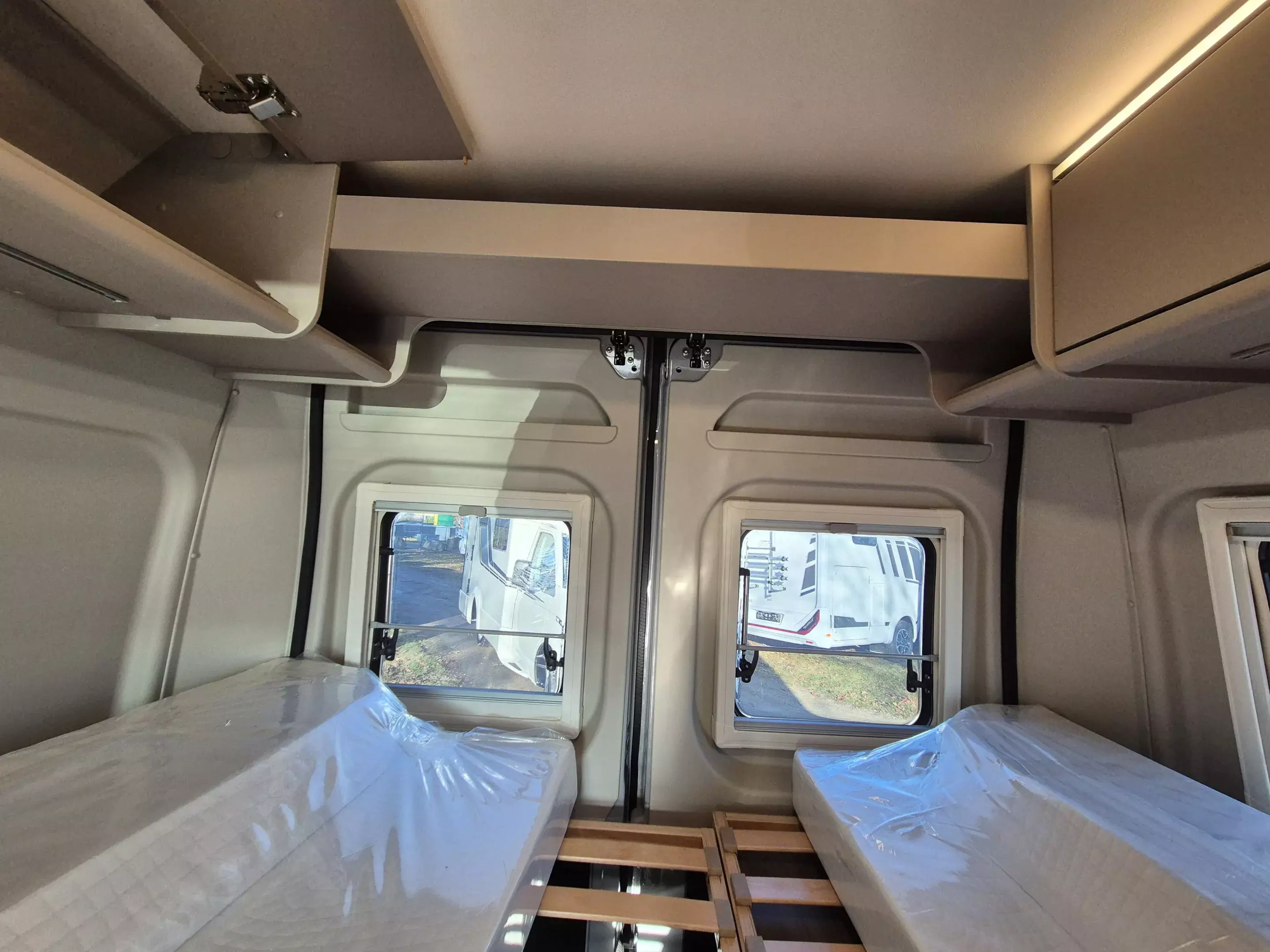 - Basic Paket (Dachhaube Midi- Heki 70 x 50 cm über Sitzgruppe, Duschausstattung (Brausekopf ausziehbar, Duschvorhang, Führungsschiene, Brausehalter), Fenster im Bad, Kleiderstange in der Nasszelle, Breite Einstiegsstufe, Drehplatte für Tischerweiterung an der Sitzgruppe)