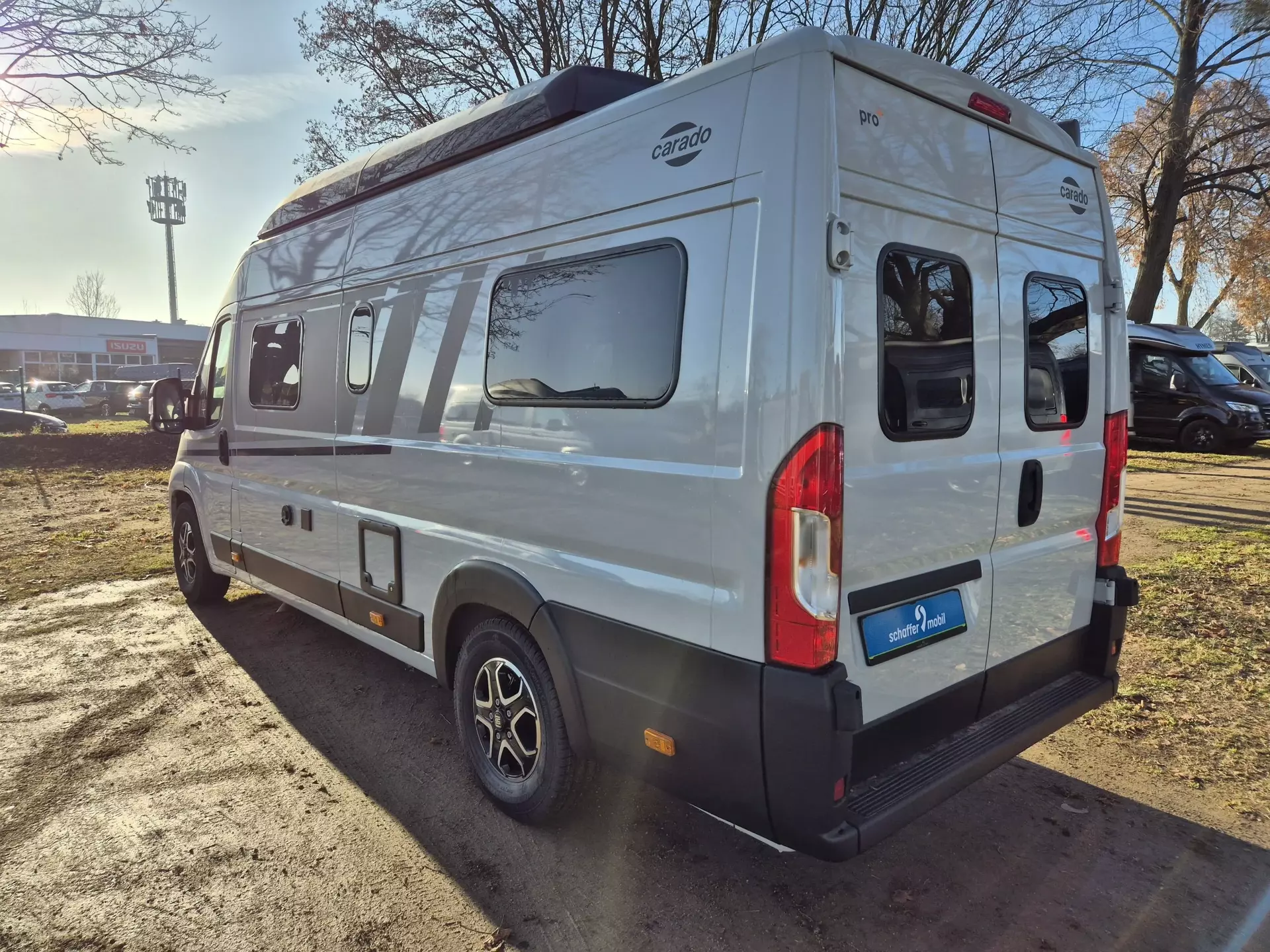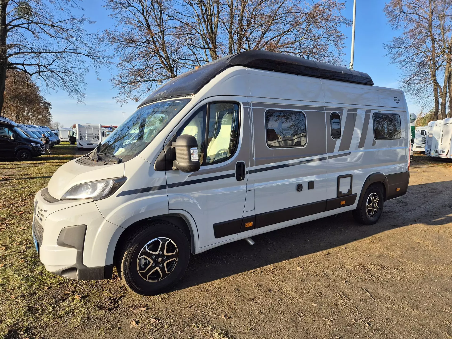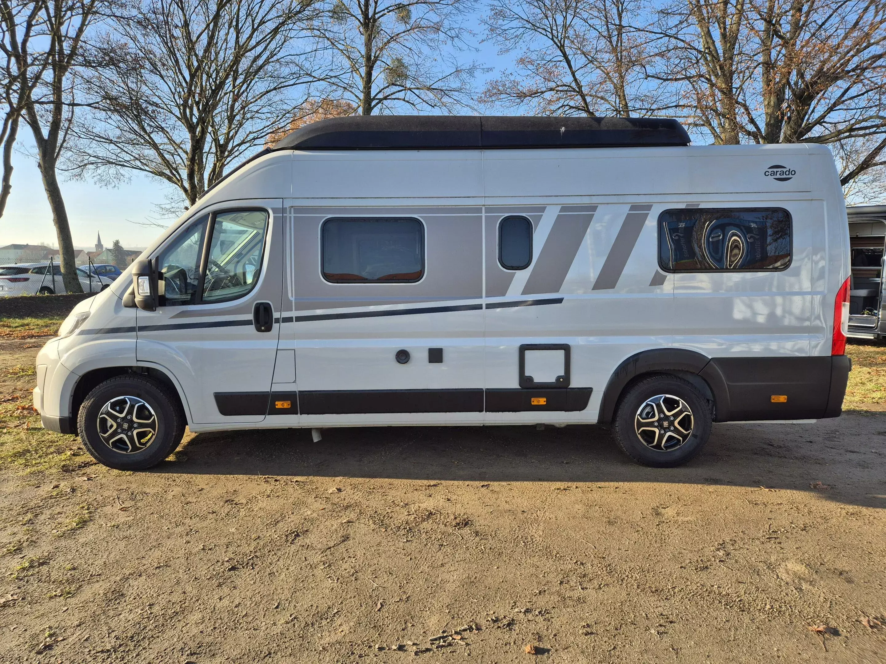 - Carado Paket pro+ (Dieseltank 90 l, Faltverdunkelung Fahrerhaus, Rahmenfenster, Markise 4 m (schwarz), Beklebung pro+, LED-Beleuchtung integriert über den Dachschränken, Panoramafenster über Fahrer- und Beifahrersitz, Heckdachstauschrank umlaufend)
