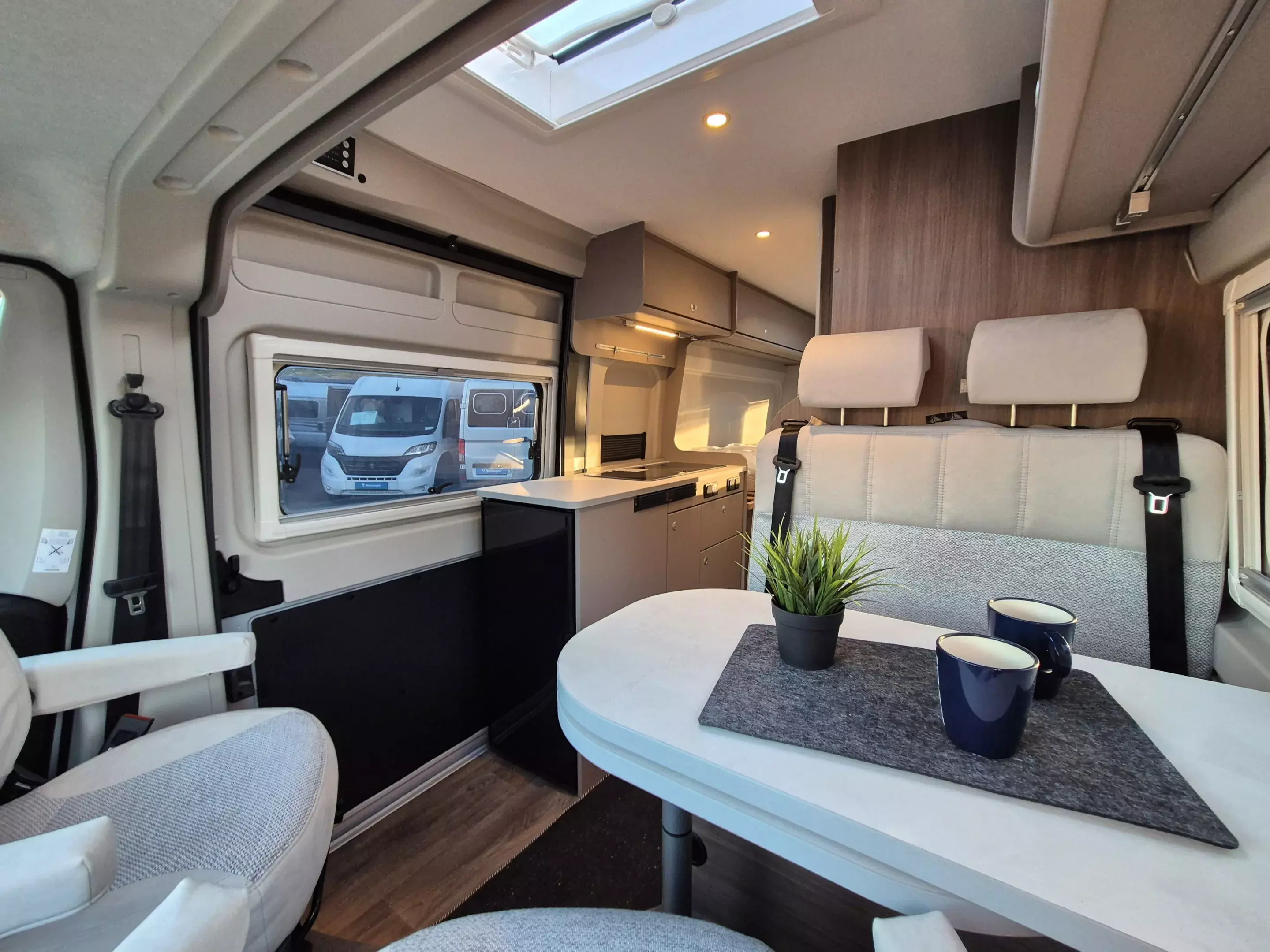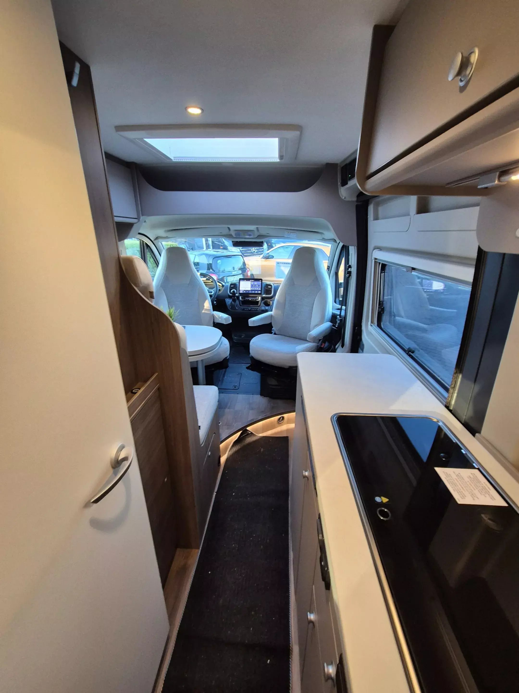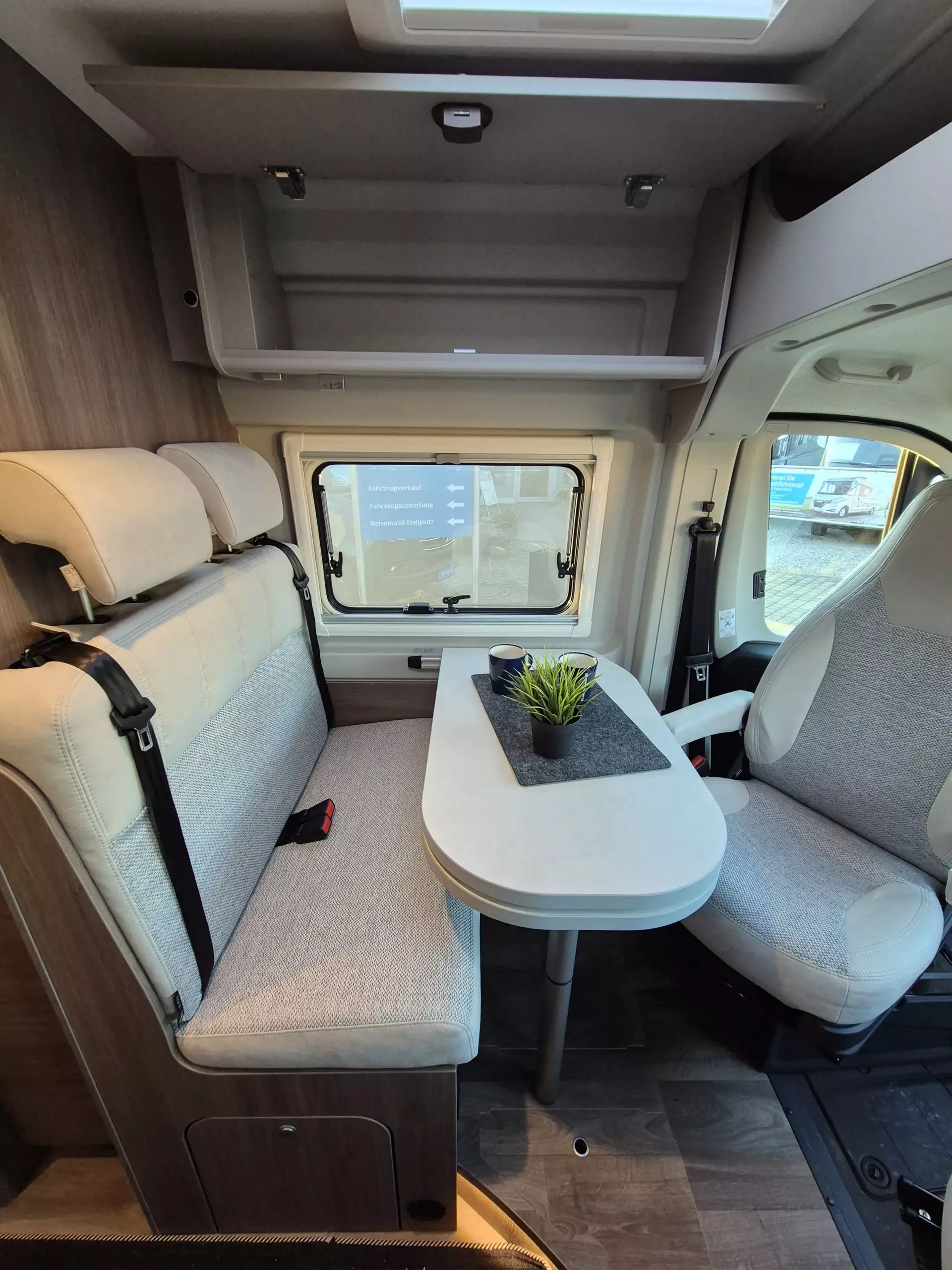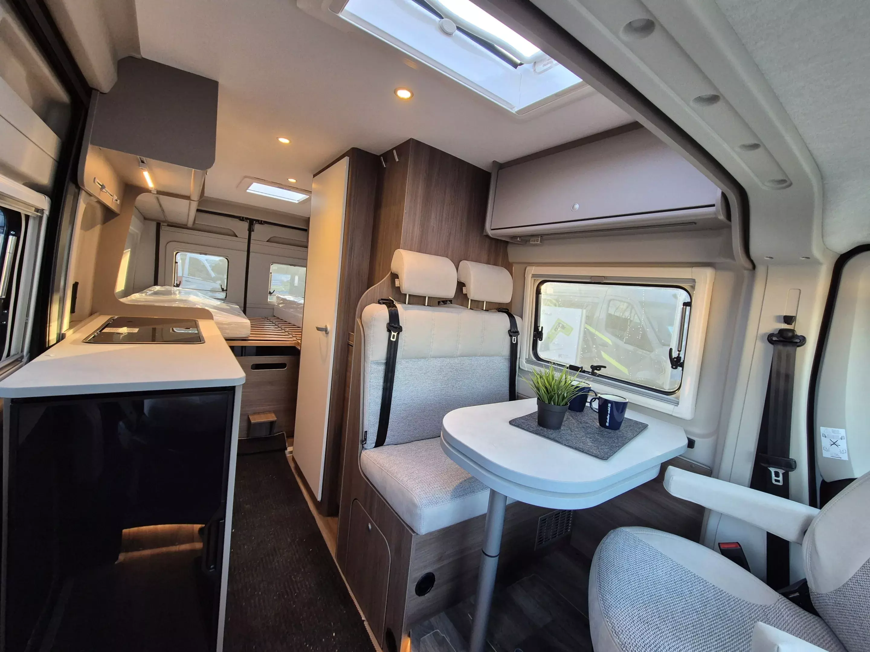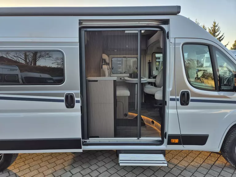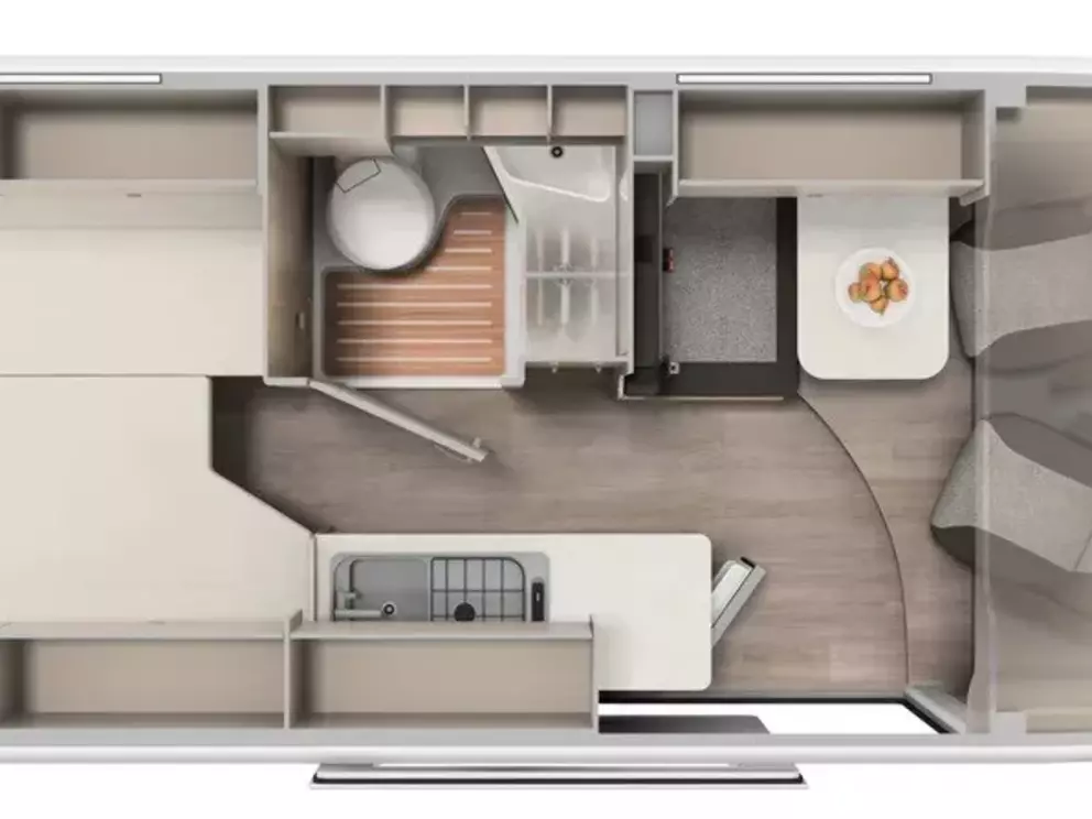 - Basic Paket: Dachhaube Midi Heki 70 x 50 cm über Sitzgruppe ; Duschausstattung; Fenster im Bad ; Kleiderstange in der Nasszelle ; Breite Einstiegsstufe ; Drehplatte für Tischerweiterung an der Sitzgruppe