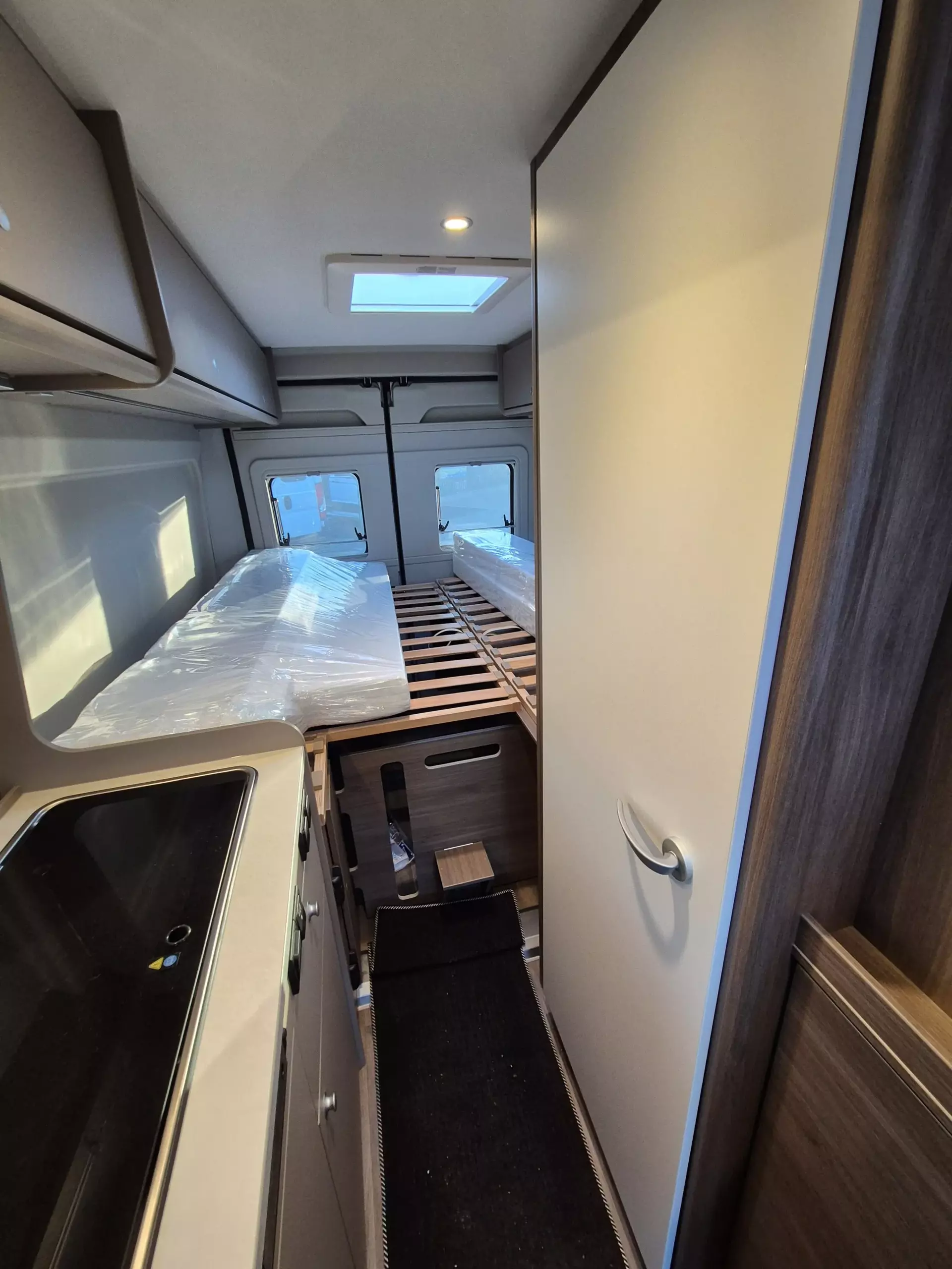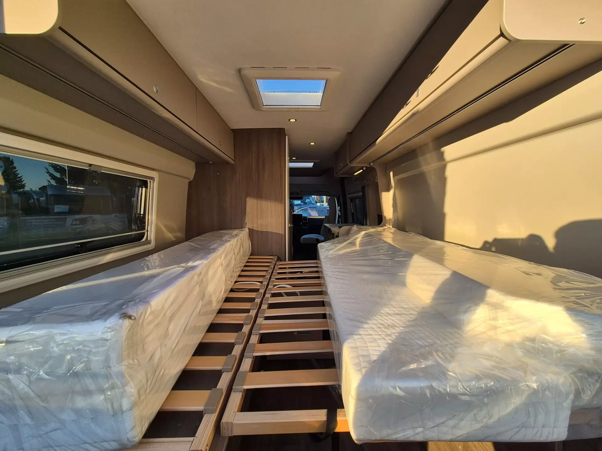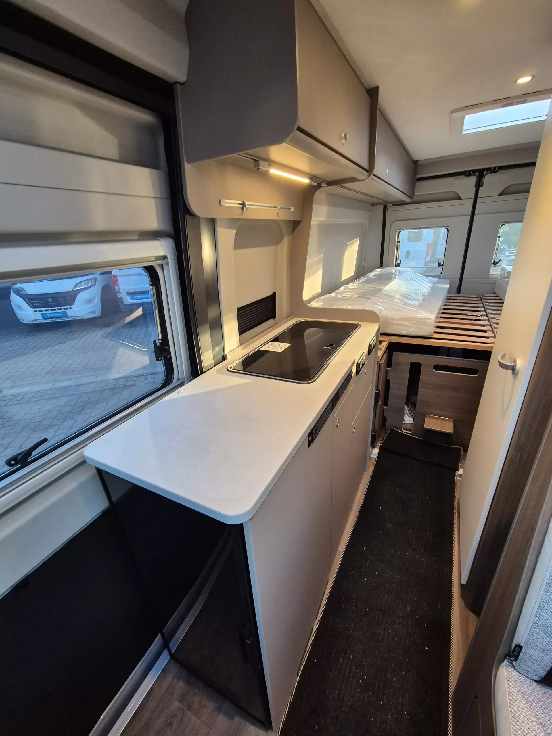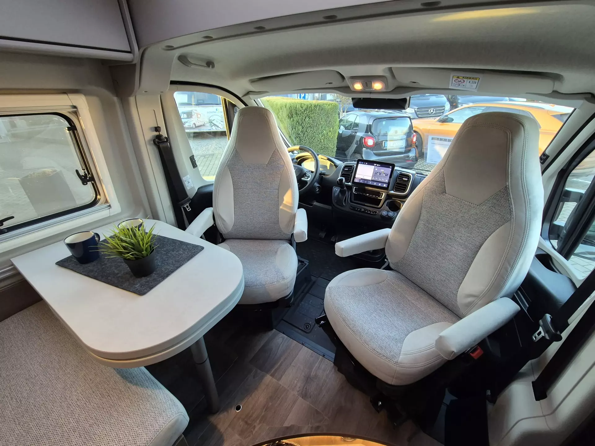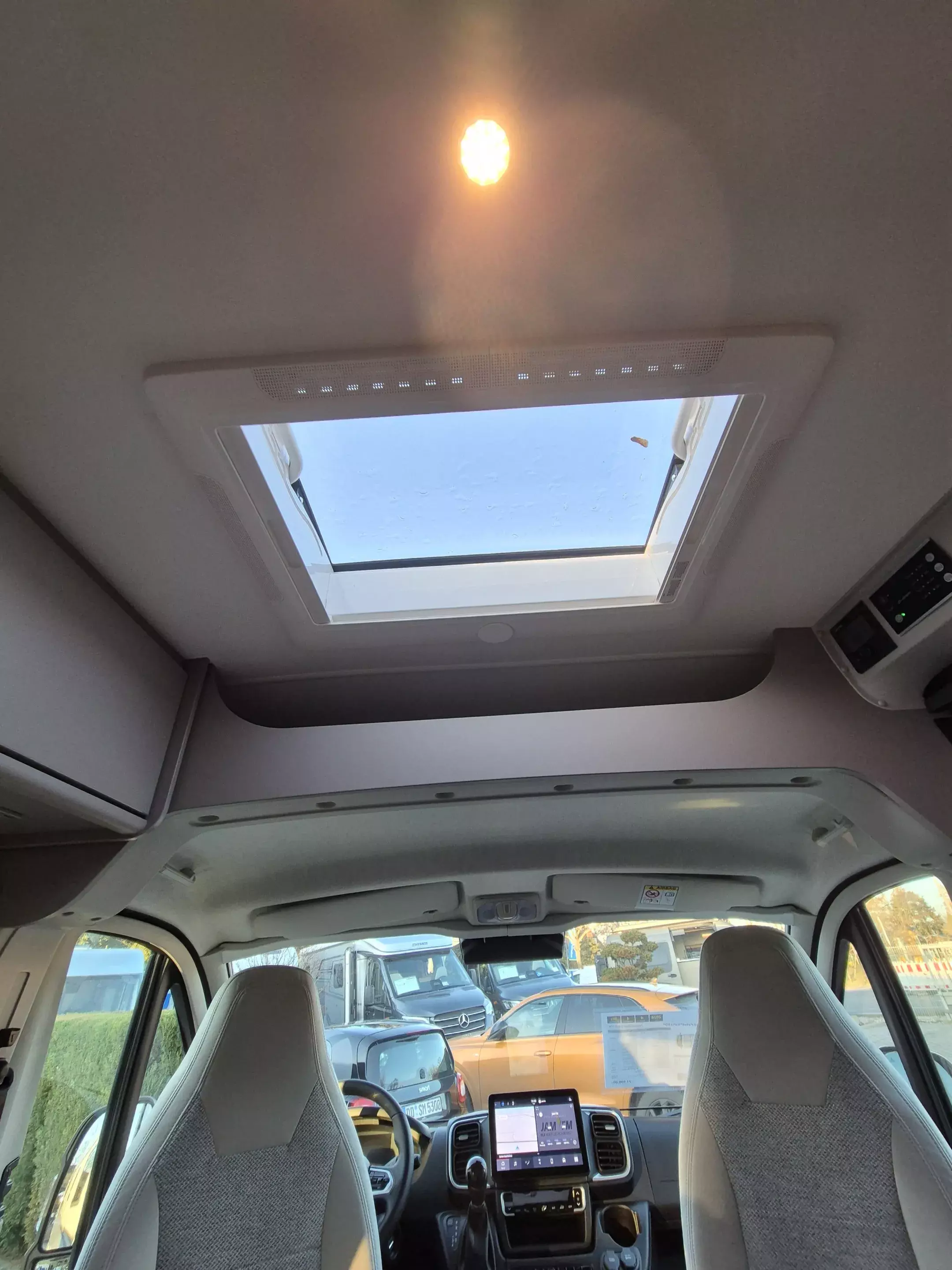 - Basic Paket: Dachhaube Midi Heki 70 x 50 cm über Sitzgruppe ; Duschausstattung; Fenster im Bad ; Kleiderstange in der Nasszelle ; Breite Einstiegsstufe ; Drehplatte für Tischerweiterung an der Sitzgruppe