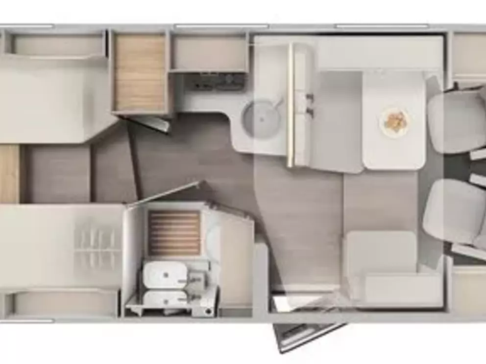 Der Wohnbereich bietet eine Seitensitzgruppe, Hubbett, Bettenumbauten sowie eine große Heckgarage mit zweiter Außenstauraumklappe. Zur Ausstattung zählen außerdem das Basic-Paket (Panoramadachhaube, Fliegengittertür, Komfort-Eingangstür, Bridge Light), Gasheizung, WC und Holzrost in der Dusche.