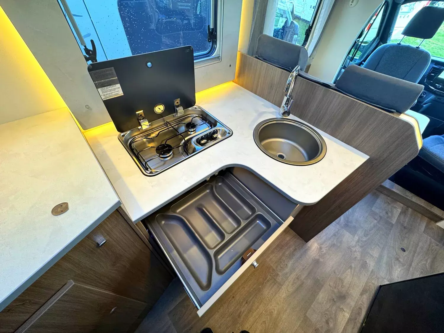 - EDITION25 Paket - (Chassisfarbe Chroma Blau, 16" Alufelgen, Faltverdunkelung Fahrerhaus, Fenster in Fronthaube, Großer Kühlschrank 156 l mit separatem Frosterfach 29 l, Abwassertank isoliert, Markise, Rahmenfenster, Design Applikation Heck, Zweite Außenstauraumklappe, Editionsabklebung, Wohnwelt Grau)
