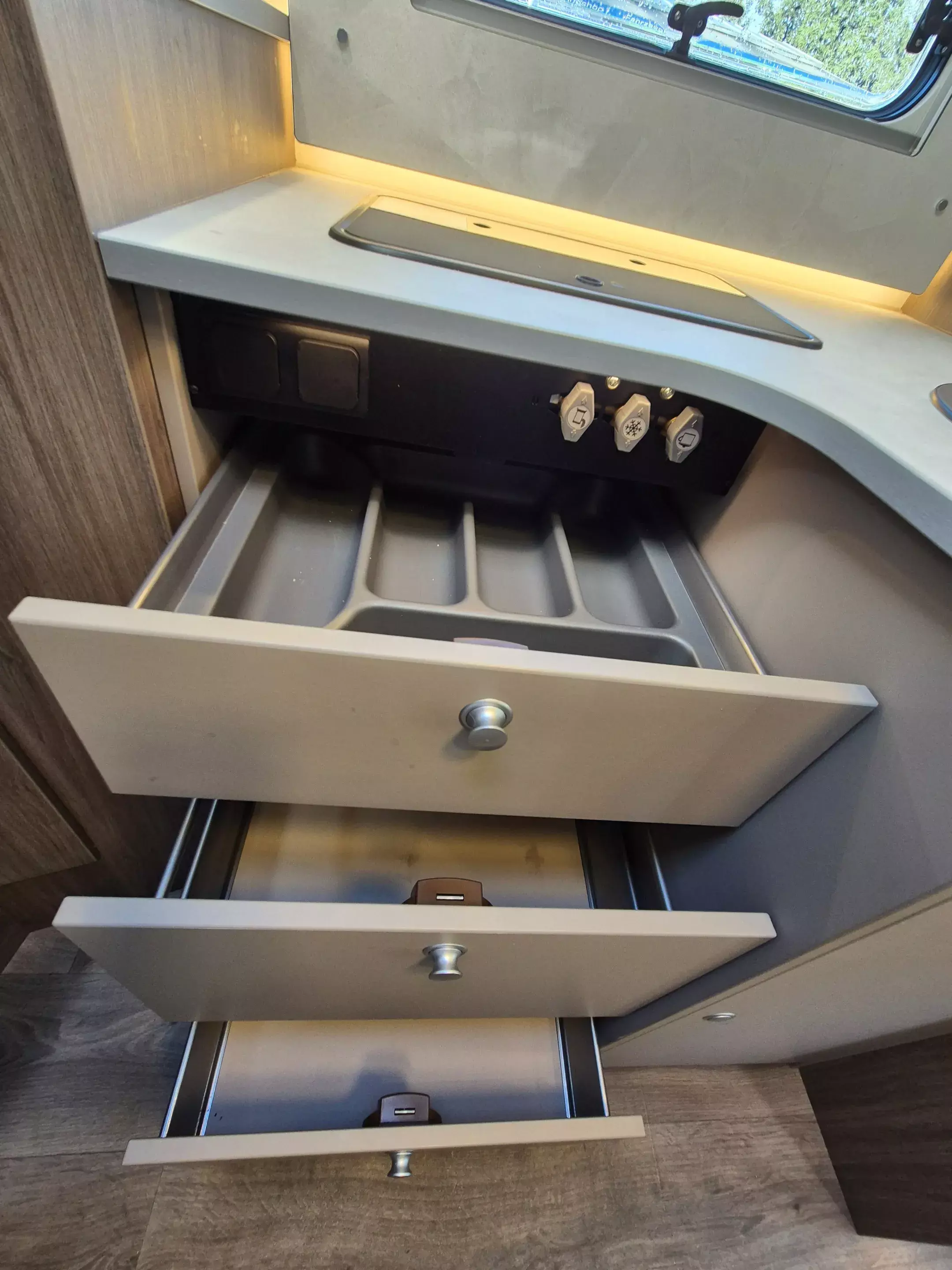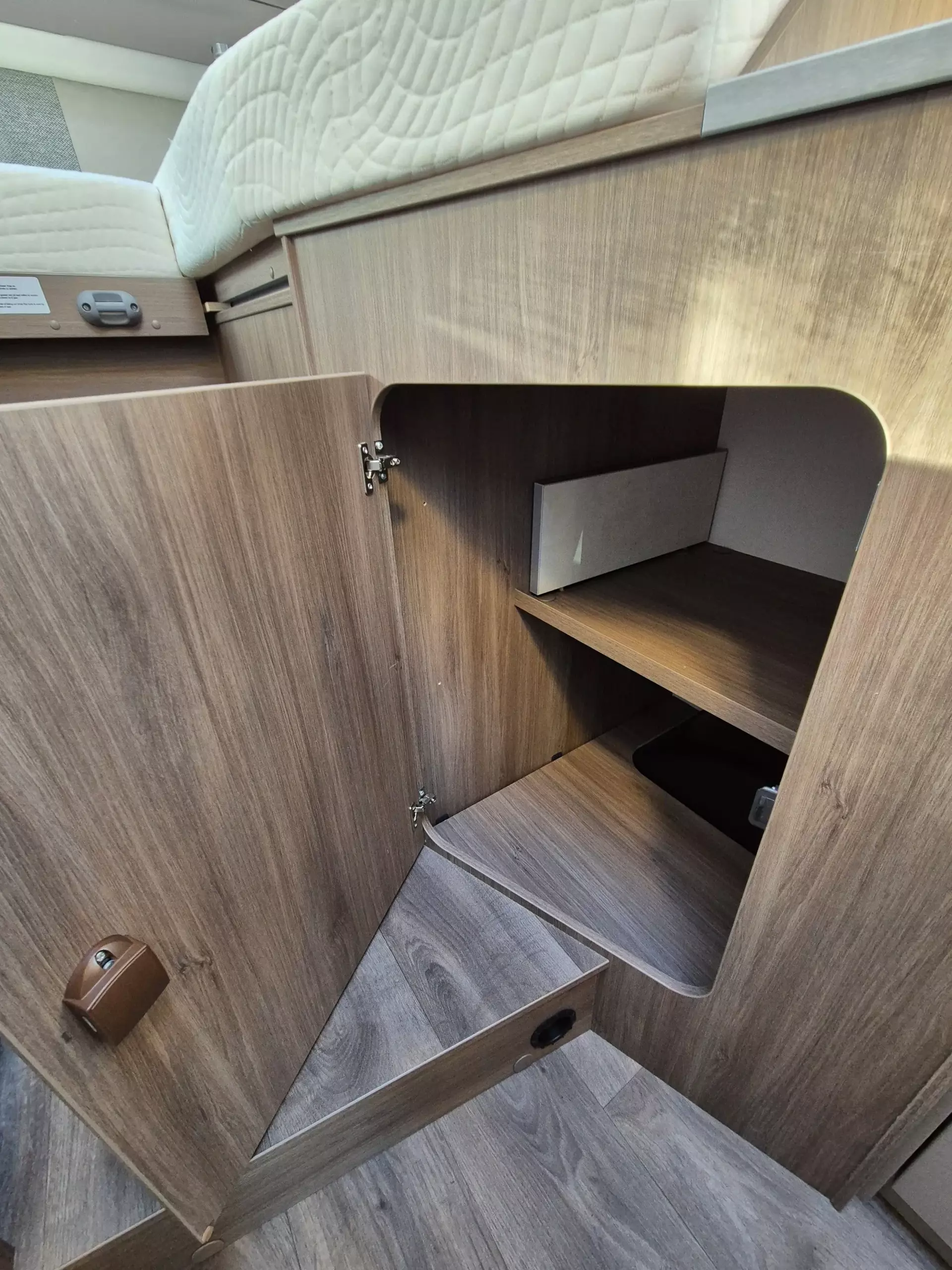 * Auf der Straße überzeugt der T338 durch seinen 140-PS Multijet und das 8-Gang-Automatikgetriebe. Er fährt sich angenehm ruhig, souverän und kraftvoll. Die Metallic-Lackierung in Artense Grau, die Bi-Color-Alufelgen und das moderne Lichtdesign geben dem Fahrzeug einen eleganten, zeitlosen Auftritt. Mit GFK-Dach, Aluminium-Glattblechwänden und guter Isolierung ist er zudem solide gebaut und ideal für jedes Wetter.