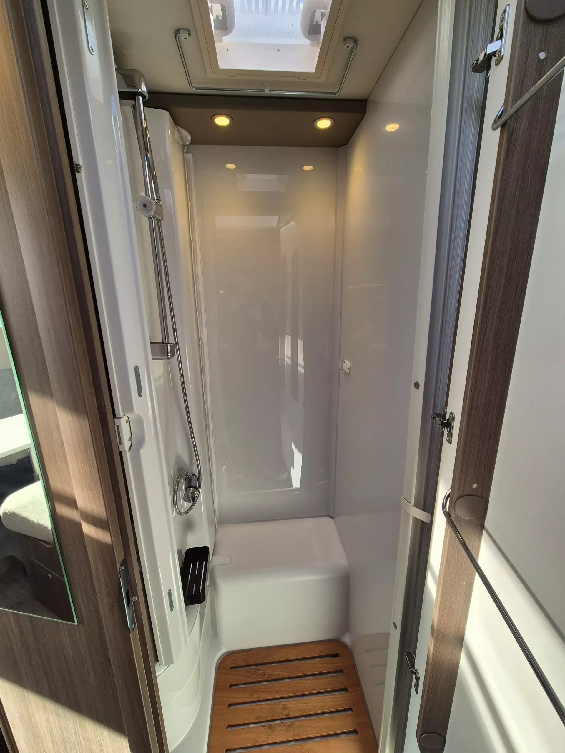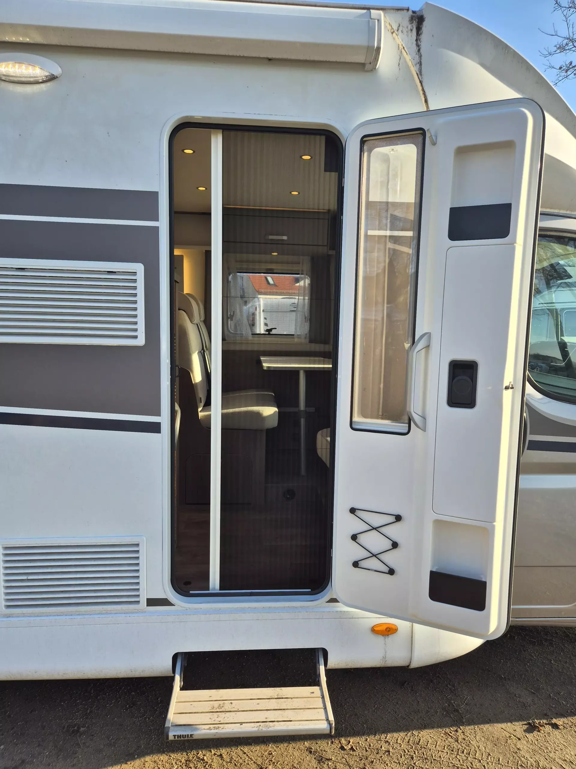 - Basic Paket (Panoramadachhaube 70 x 50 cm; Klarglasdachhaube 40 x 40 cm; Fliegengittertür (einteilig); Komfort-Eingangstür mit Fenster und Verdunkelung; Bridge Light)