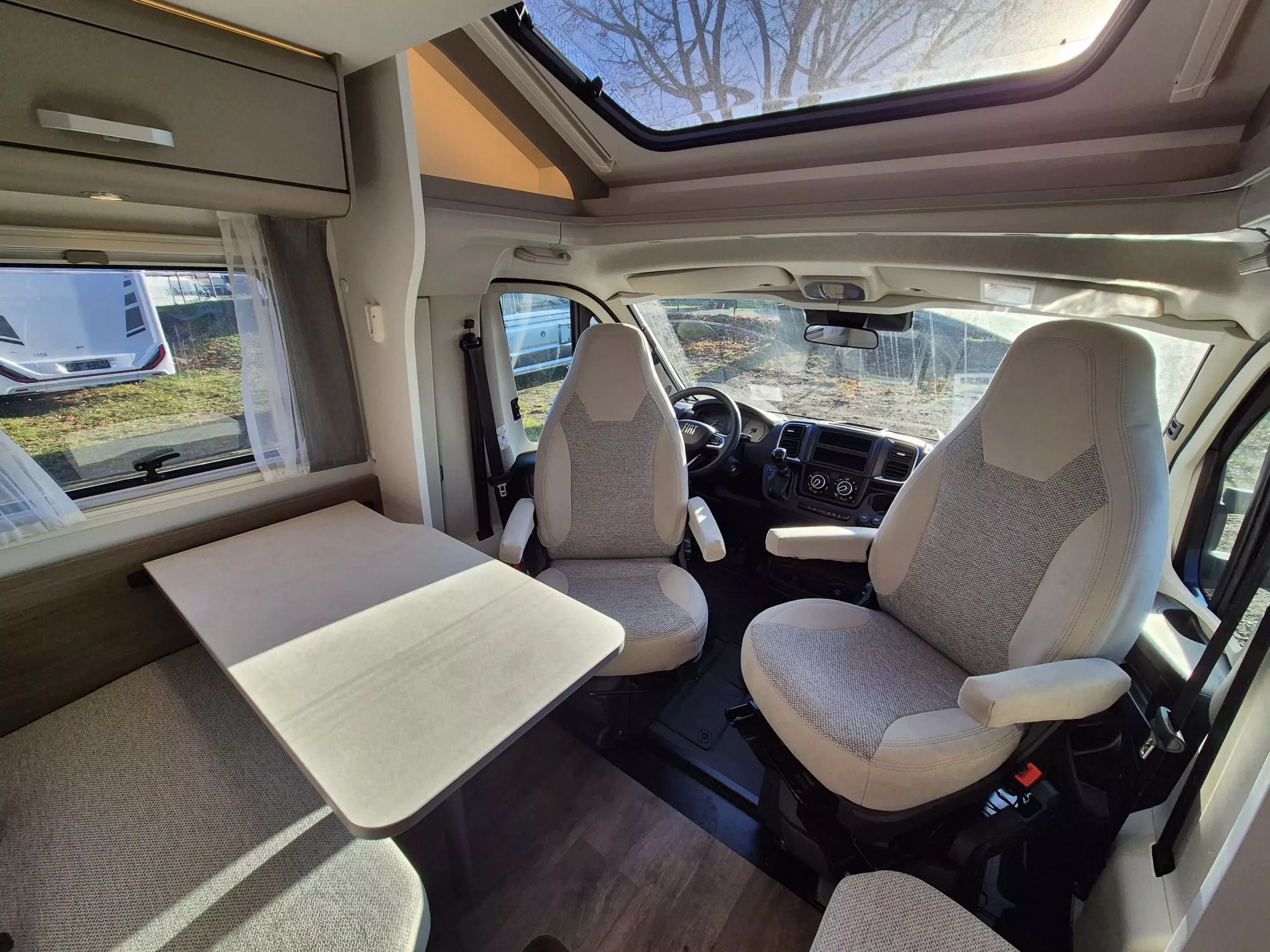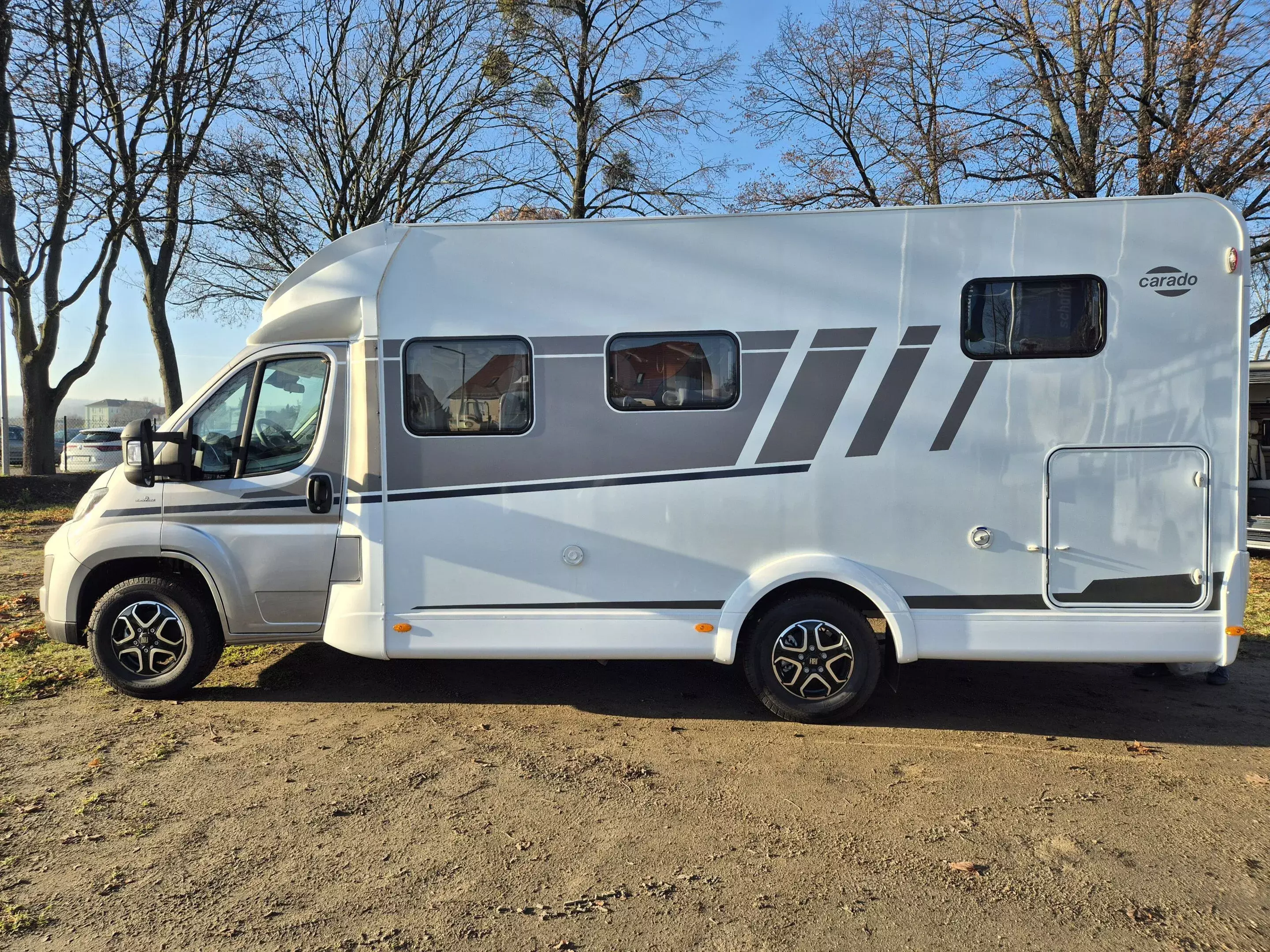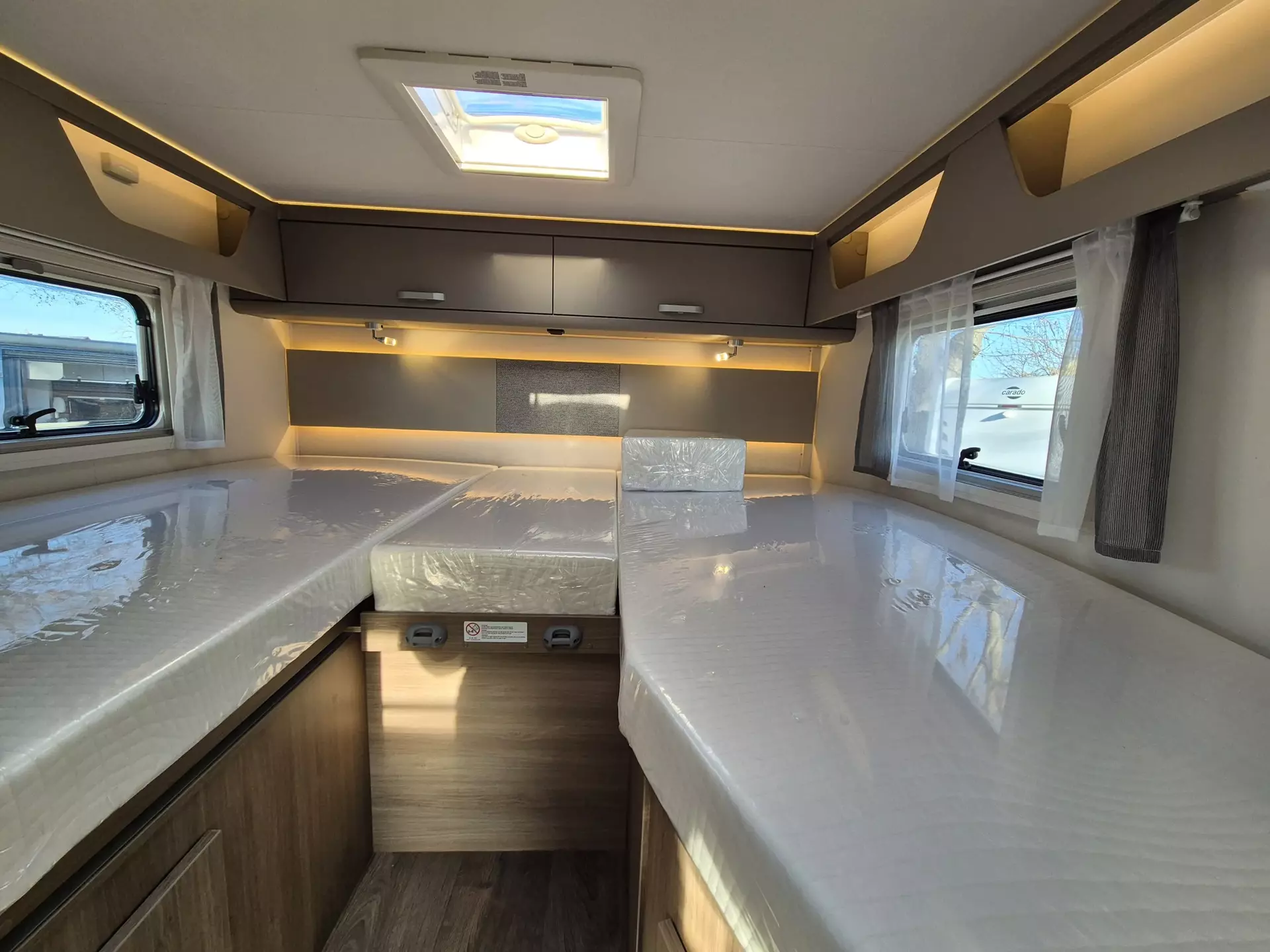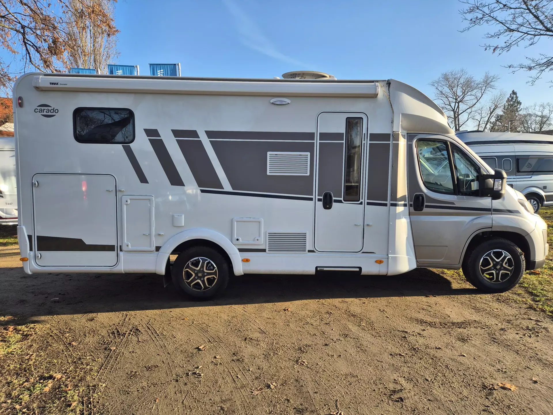 - Carado pro+ Paket (Faltverdunkelung Fahrerhaus, Fenster in Fronthaube, Großer Kühlschrank 156 l mit separatem Frosterfach 29 l, Abwassertank isoliert, Markise 4 m, Rahmenfenster, Design Applikation Heck, Zweite Außenstauraumklappe (Größe modellabhängig), Beklebung pro+)