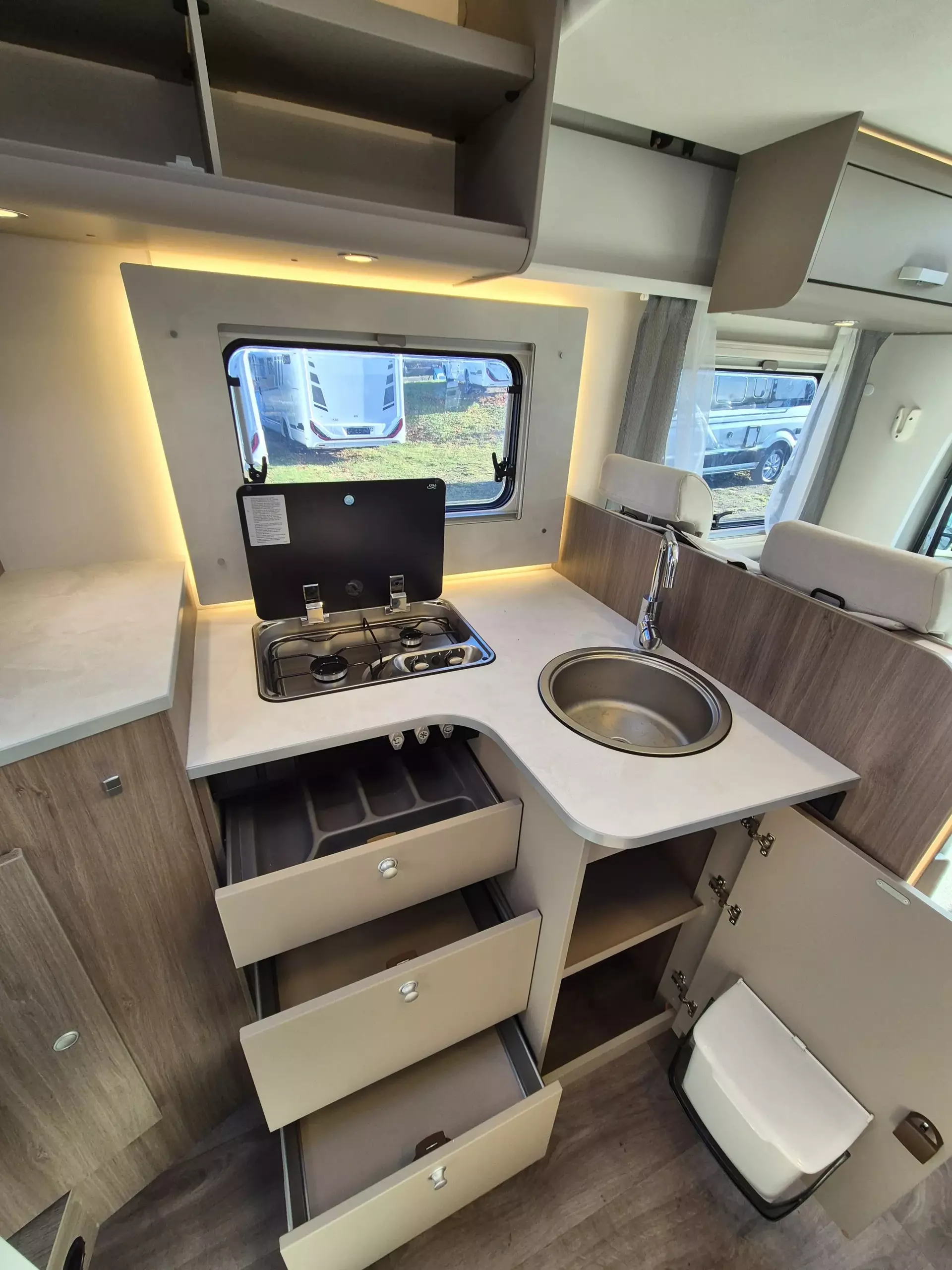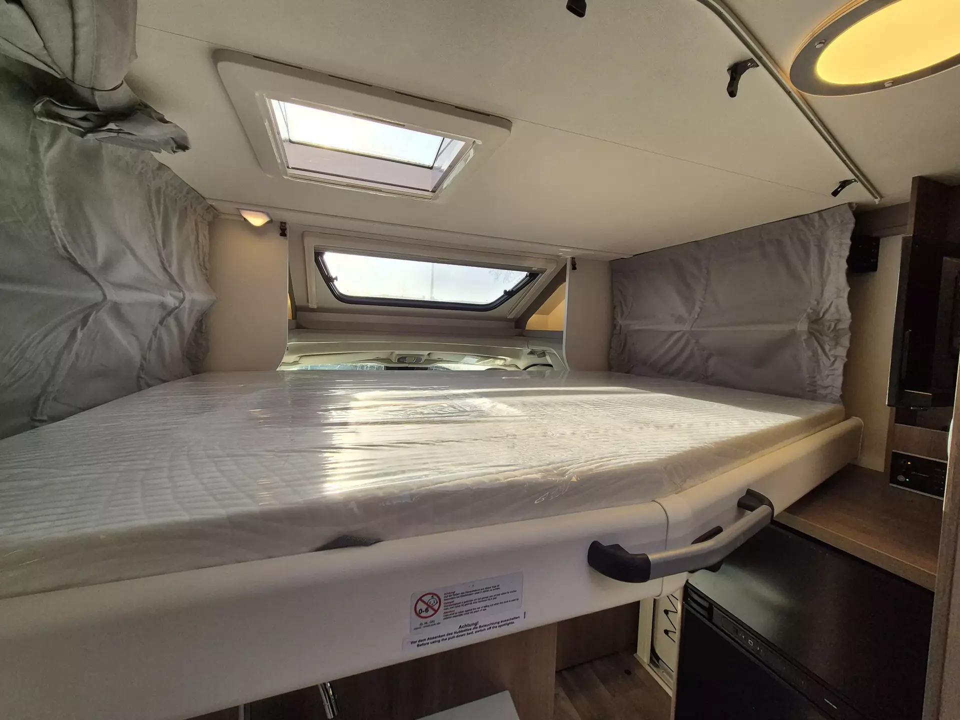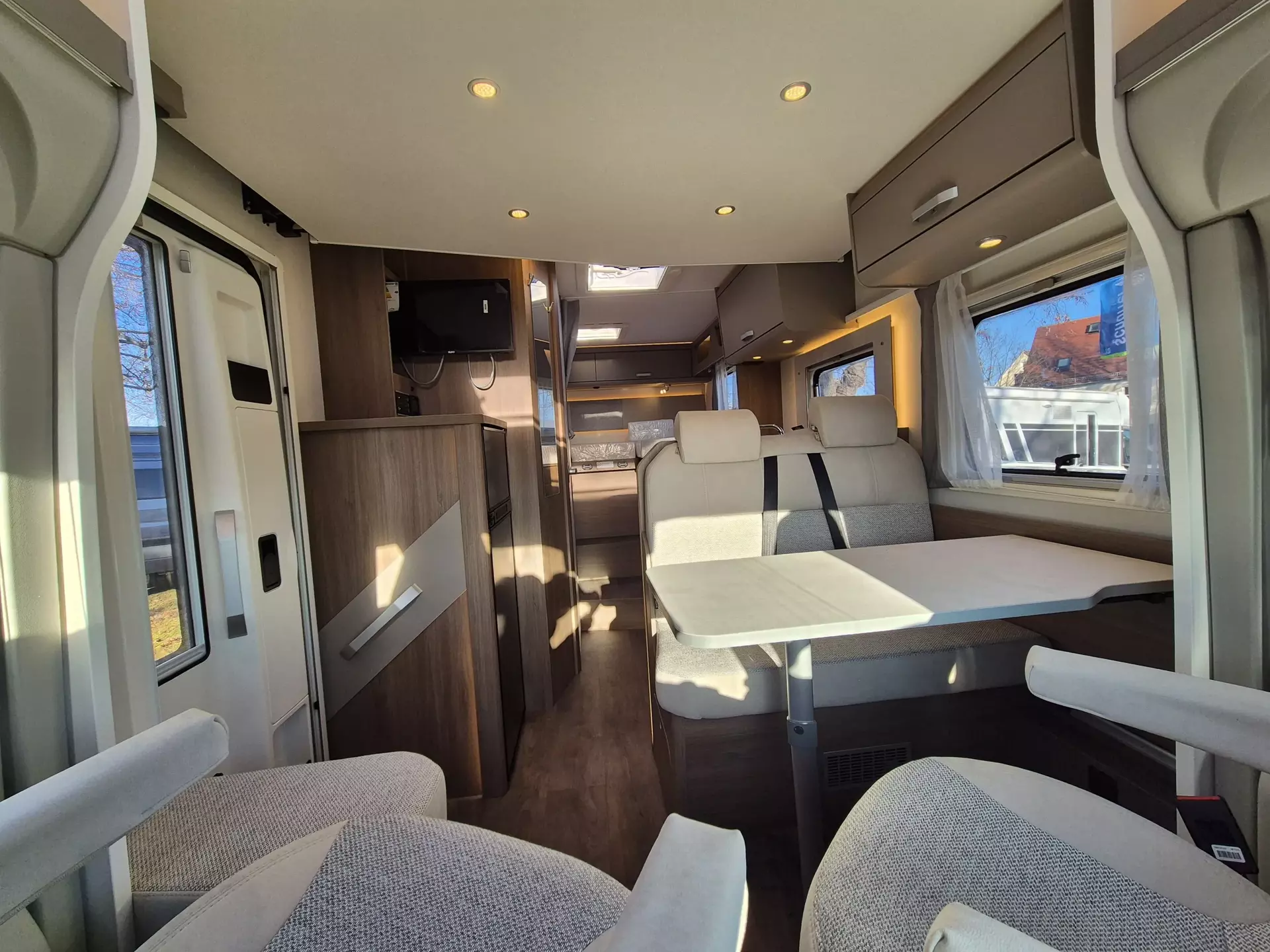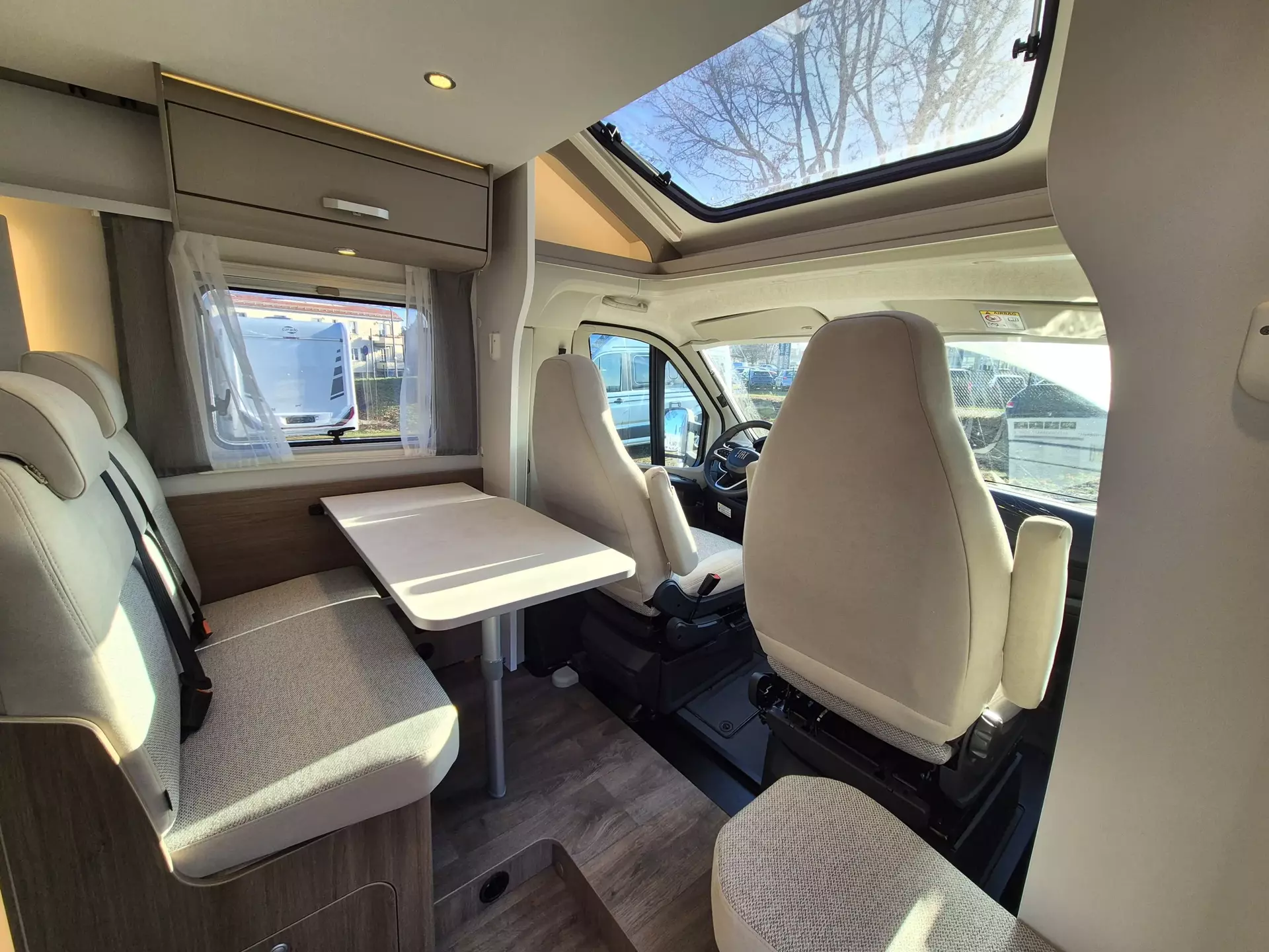 - Carado pro+ Paket (Faltverdunkelung Fahrerhaus, Fenster in Fronthaube, Großer Kühlschrank 156 l mit separatem Frosterfach 29 l, Abwassertank isoliert, Markise 4 m, Rahmenfenster, Design Applikation Heck, Zweite Außenstauraumklappe (Größe modellabhängig), Beklebung pro+)