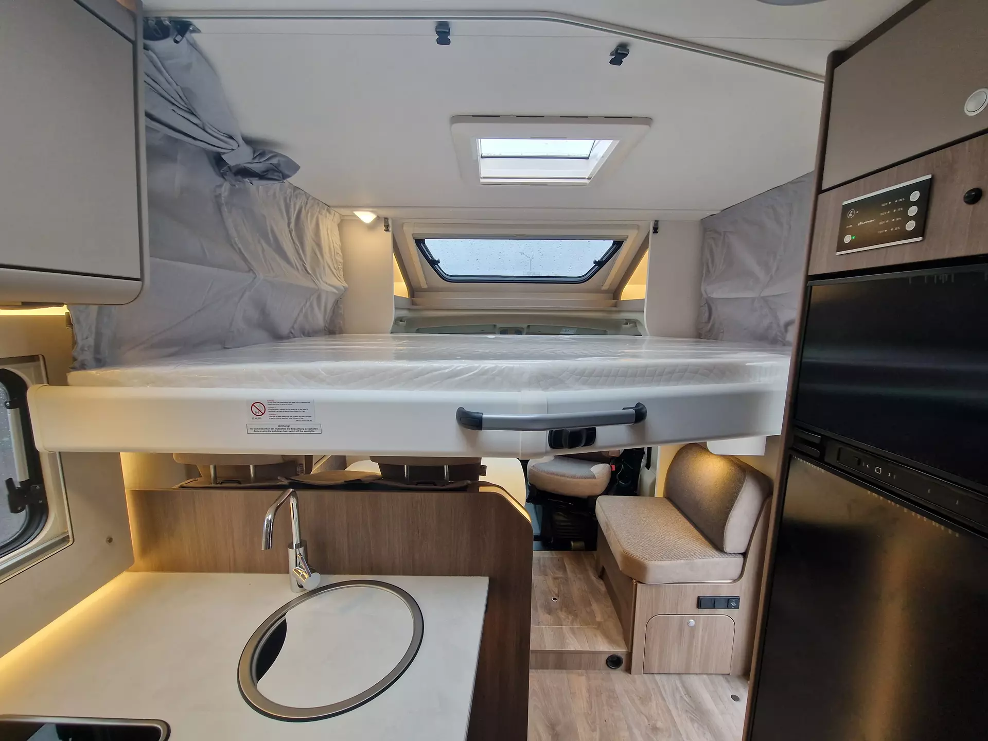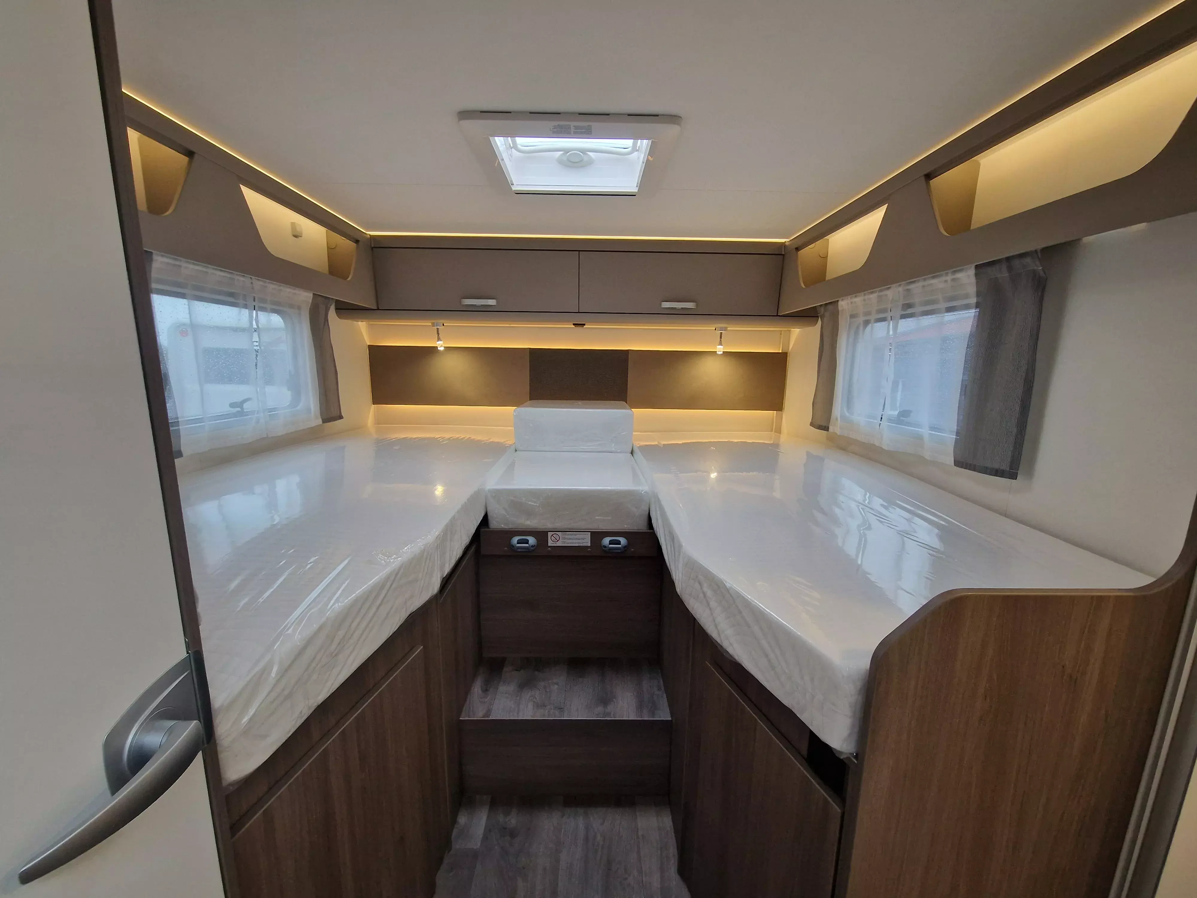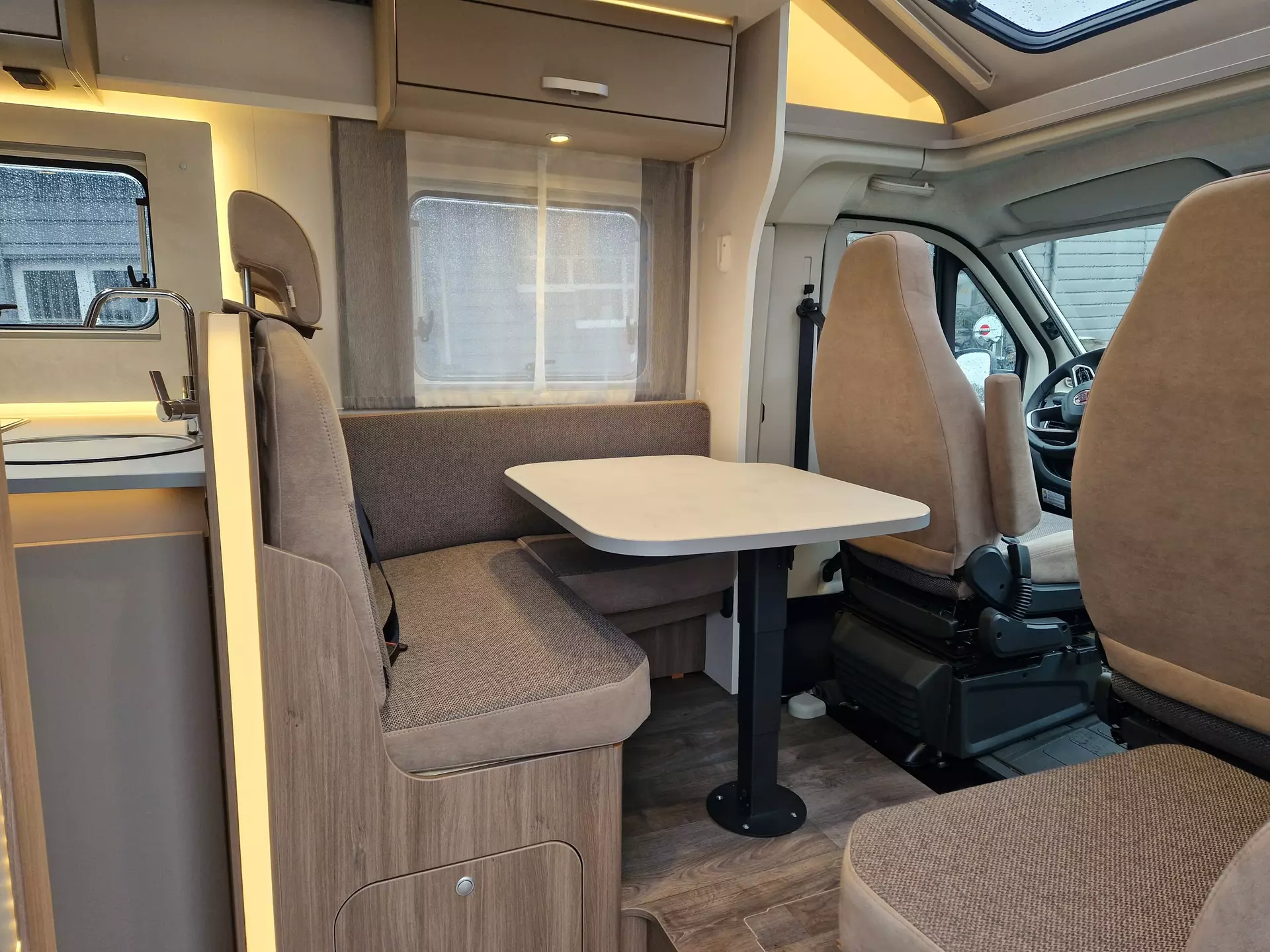 - Basic-Paket (Dachhaube Midi-Heki 700 x 500 über Sitzgruppe, Kabelvorbereitung Rückfahrkamera, Panoramadachhaube, Fliegengittertür, Aufbautür mit Fenster, Bridge Light)