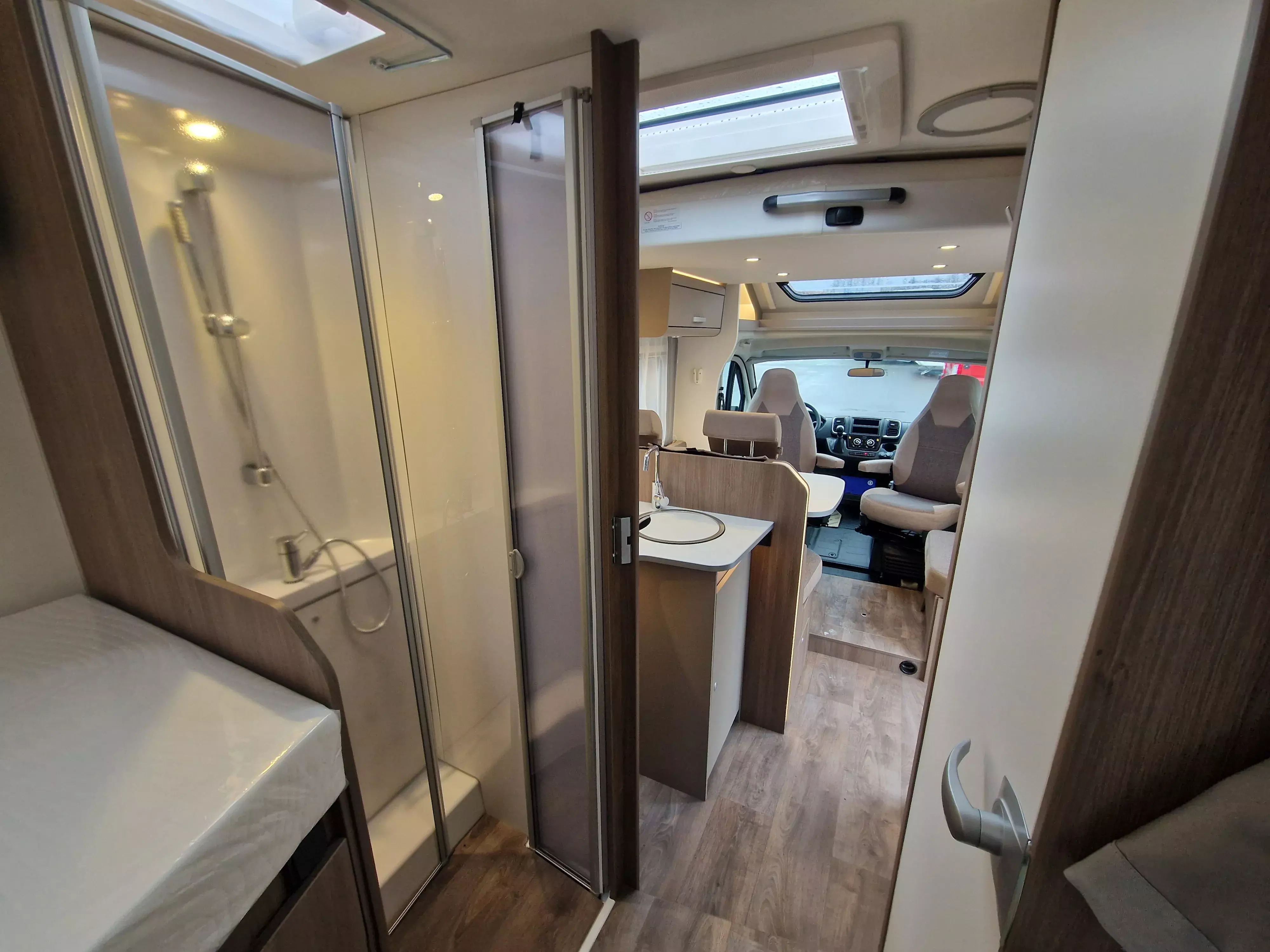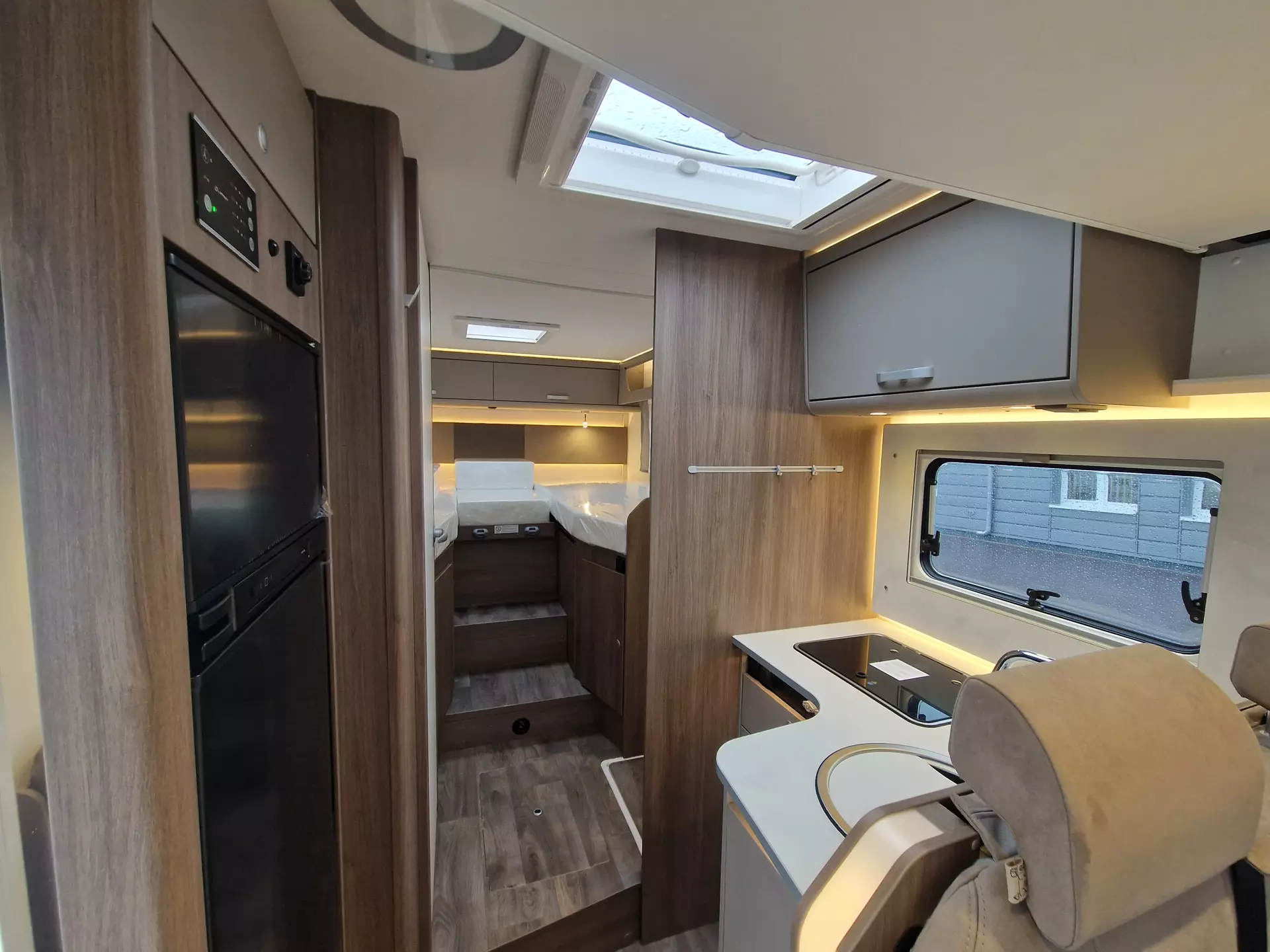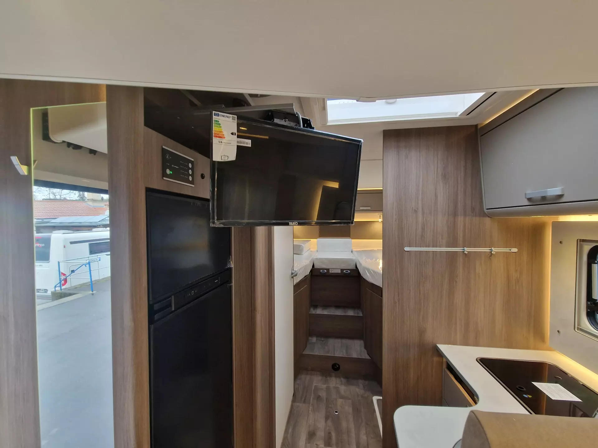 - Basic-Paket (Dachhaube Midi-Heki 700 x 500 über Sitzgruppe, Kabelvorbereitung Rückfahrkamera, Panoramadachhaube, Fliegengittertür, Aufbautür mit Fenster, Bridge Light)