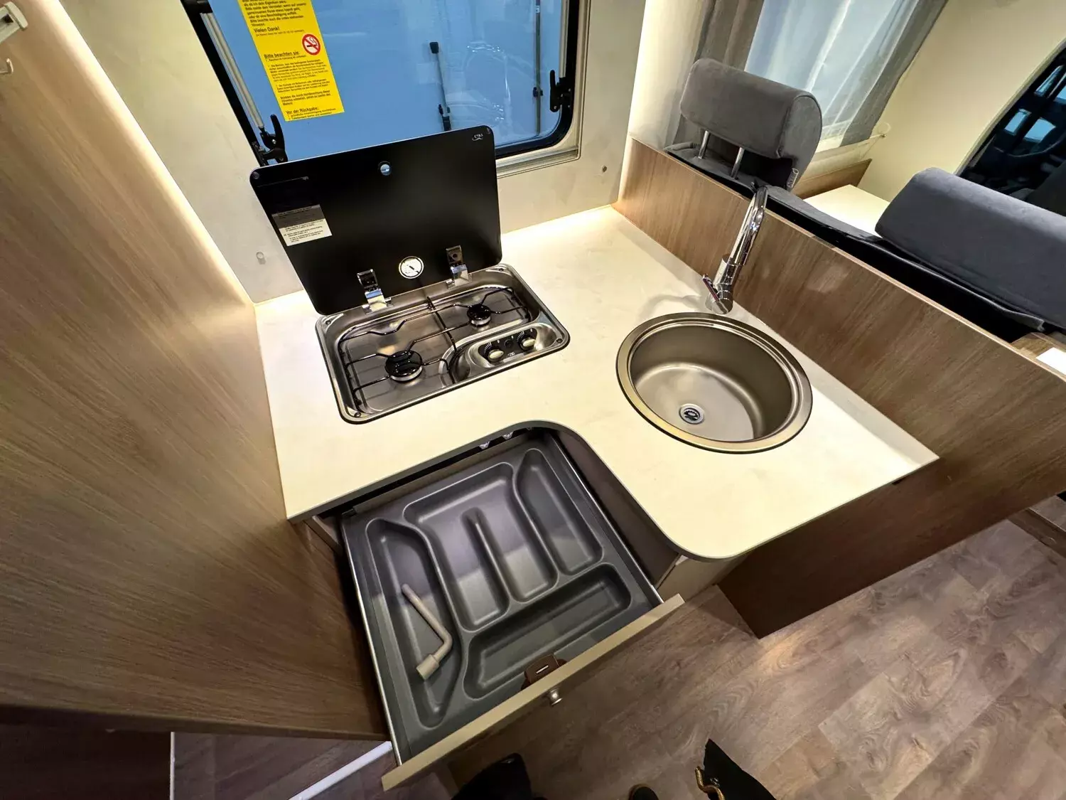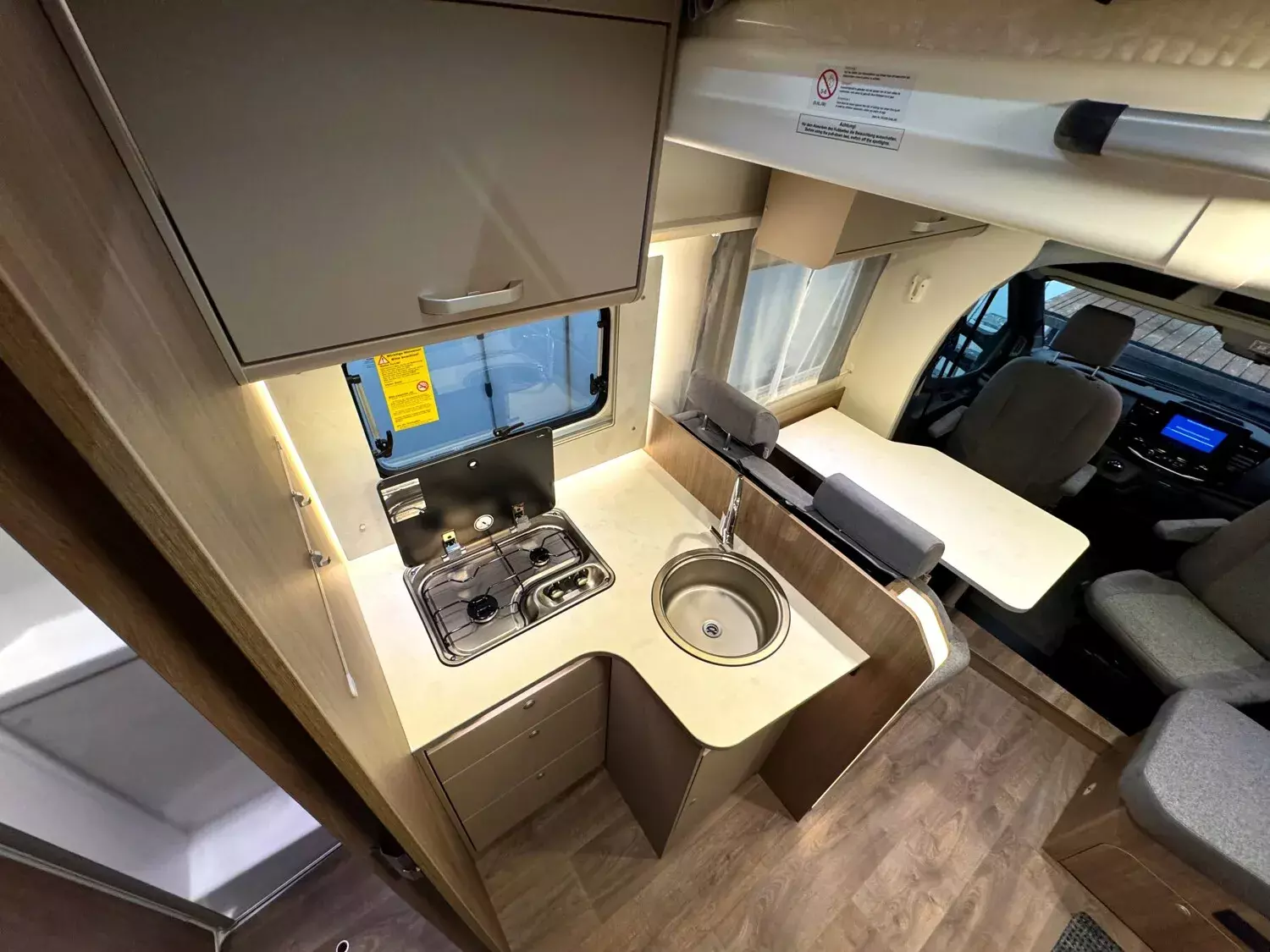- EDITION25 Paket (Chassisfarbe Chroma Blau, 16" Alufelgen, Faltverdunkelung Fahrerhaus, Fenster in Fronthaube, Großer Kühlschrank 156 l mit separatem Frosterfach 29 l, Abwassertank isoliert, Markise 4,5m, Rahmenfenster, Design Applikation Heck, Zweite Außenstauraumklappe, Editionsabklebung, Wohnwelt Grau)