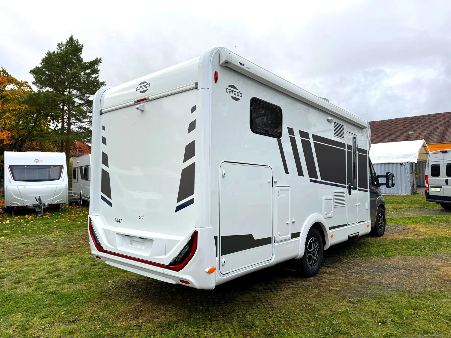 - pro+ Paket T447 - Chassisfarbe Artense Grau Metallic, Faltverdunkelung Fahrerhaus, Fenster in Fronthaube, Fenster in Fronthaube, Großer Kühlschrank 156 l mit separatem Frosterfach 29 l, Abwassertank isoliert, Markise 4,5 m, Rahmenfenster, Design Applikation Heck, Zweite Außenstauraumklappe, Beklebung pro+