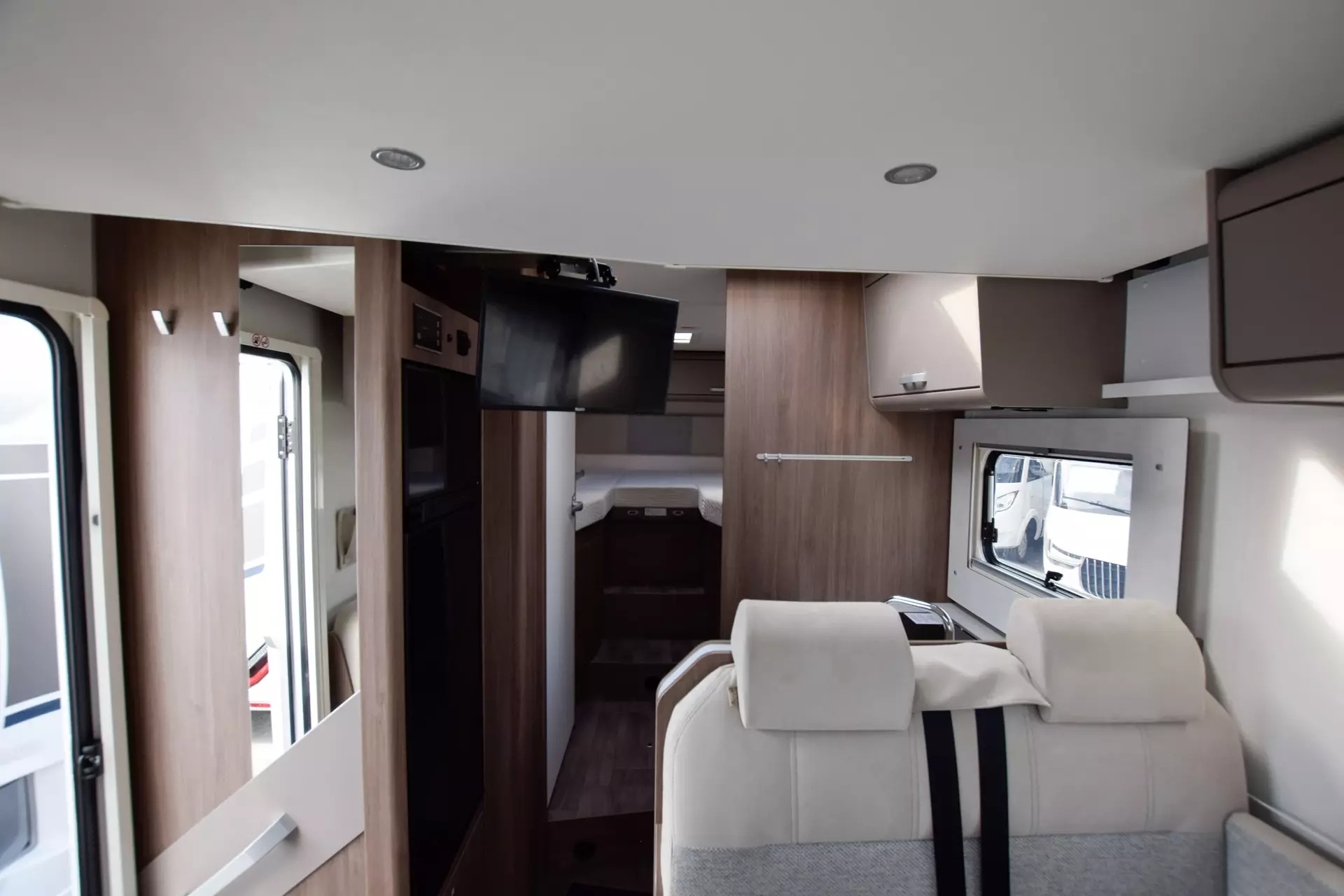 * Dank pro+ Paket und weiterer Komfortdetails bietet der T447 viele kleine Highlights, die den Alltag unterwegs spürbar leichter machen: eine große Heckgarage mit Rahmenabsenkung, breite Rahmenfenster, eine bequeme Komfort-Eingangstür, der große Kühlschrank und die stimmige Innenbeleuchtung. Die separate Dusche und die praktische Raumaufteilung machen längere Aufenthalte angenehm und unkompliziert.