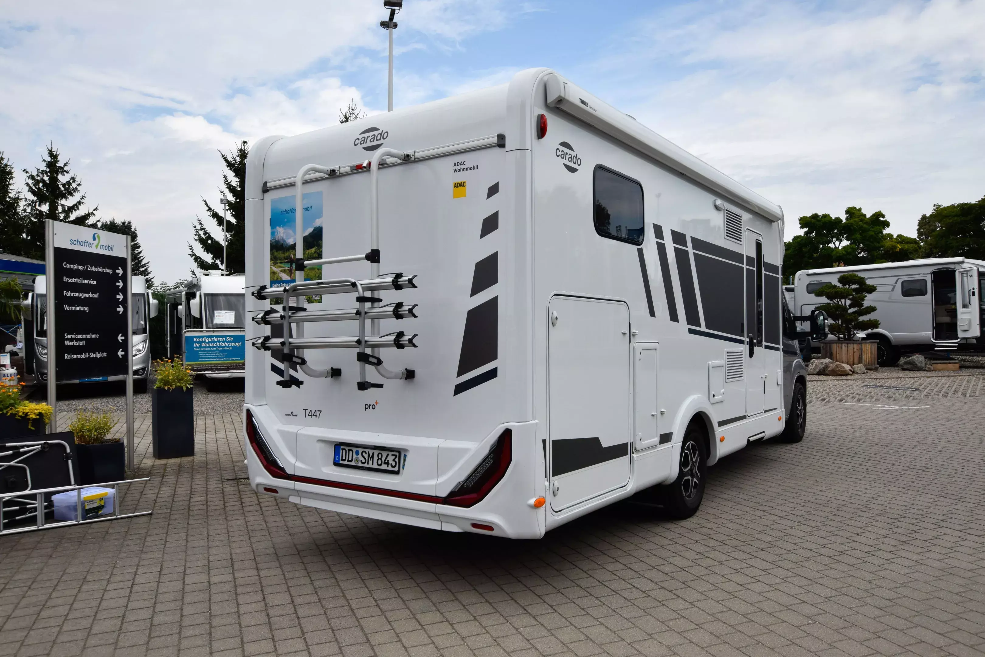 - Carado pro+ Paket (Faltverdunkelung Fahrerhaus, Fenster in Fronthaube, Großer Kühlschrank 156 l mit separatem Frosterfach 29 l, Abwassertank isoliert, Markise 4,5 m, Rahmenfenster, Design Applikation Heck, Zweite Außenstauraumklappe (Größe modellabhängig), Beklebung pro+)
