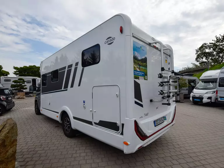 - Carado pro+ Paket (Faltverdunkelung Fahrerhaus, Fenster in Fronthaube, Großer Kühlschrank 156 l mit separatem Frosterfach 29 l , Abwassertank isoliert, Markise 4,5 m, Rahmenfenster, Design Applikation Heck, Zweite Außenstauraumklappe (Größe modellabhängig), Beklebung pro+)