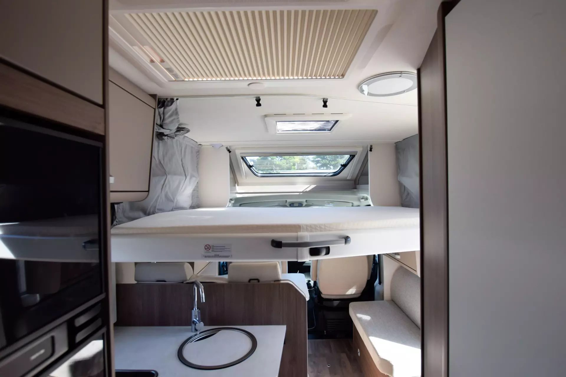 - Carado pro+ Paket (Faltverdunkelung Fahrerhaus, Fenster in Fronthaube, Großer Kühlschrank 156 l, Abwassertank isoliert, Markise 4,5 m, Rahmenfenster, Design Applikation Heck, Zweite Außenstauraumklappe, Beklebung pro+)