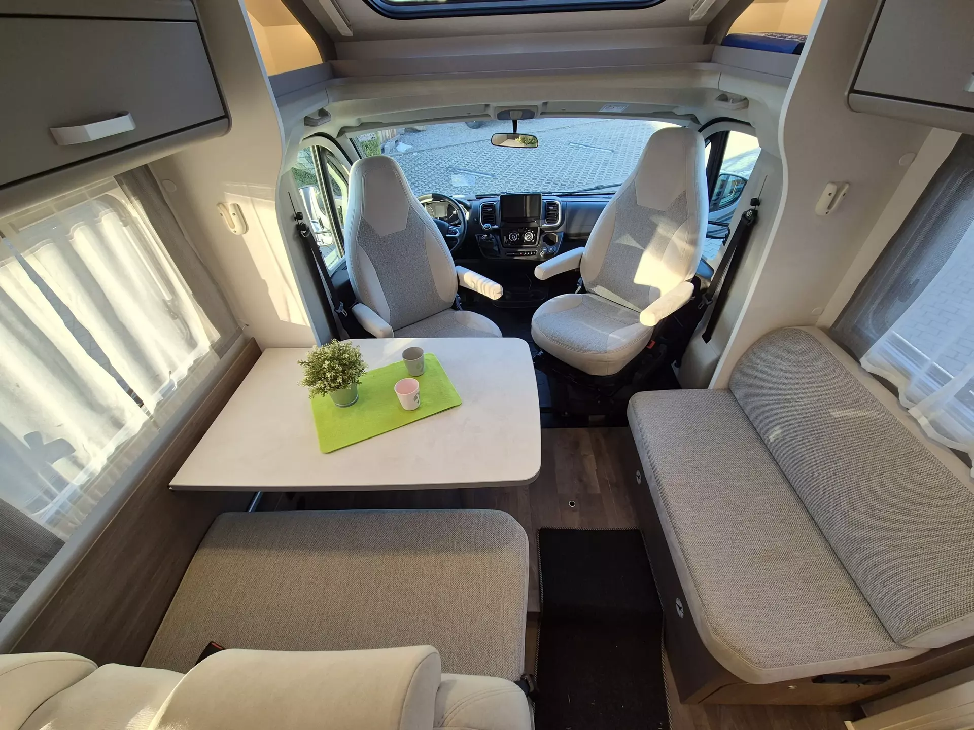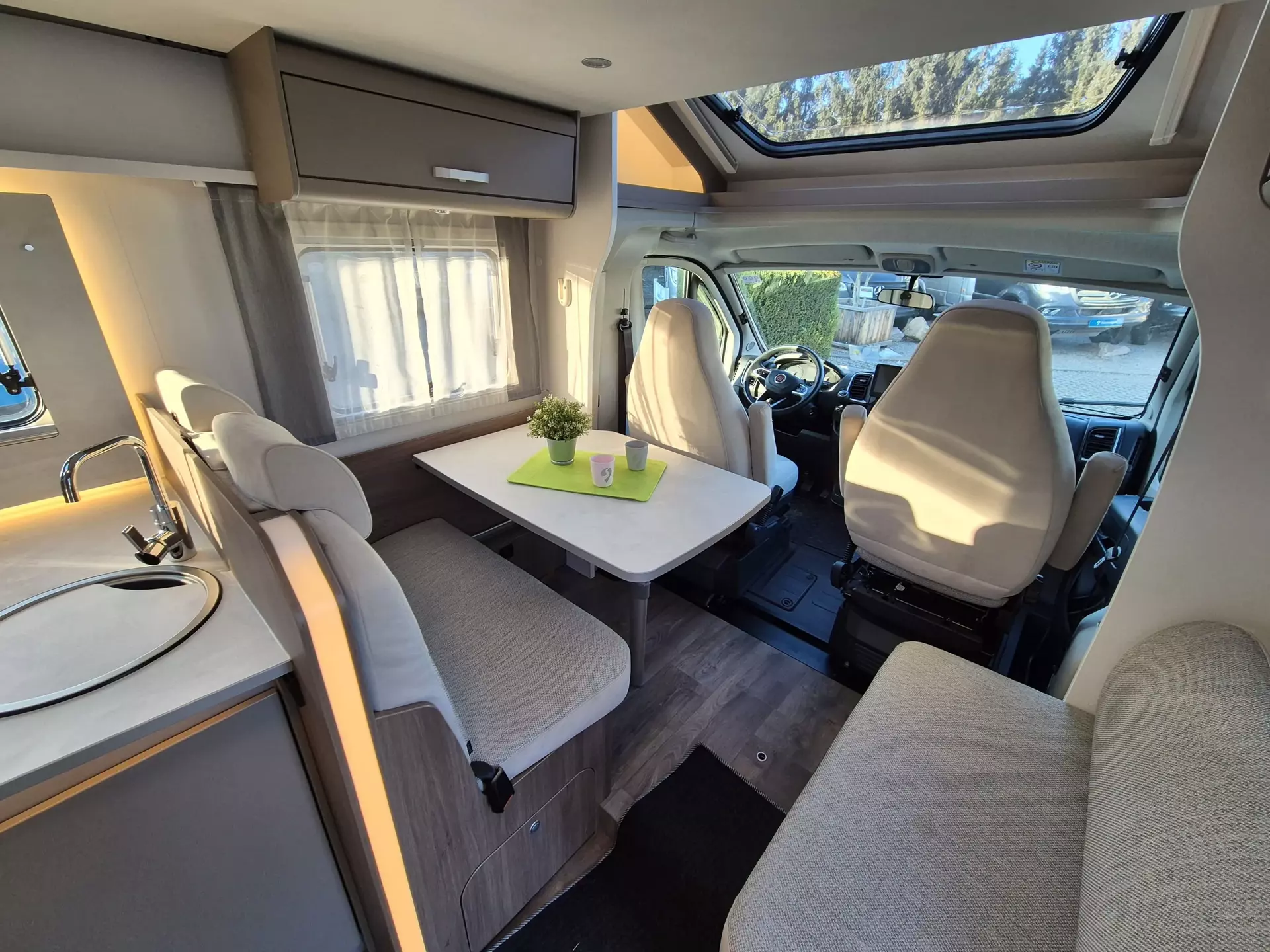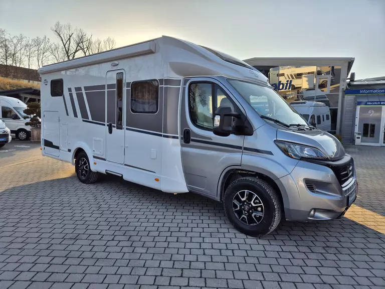 - pro+ Paket (Basic Paket, Style Paket, Chassisfarbe Artense Grau Metallic, Stoßfänger lackiert, 16" Alufelgen, Faltverdunkelung Fahrerhaus, Fenster in T-Haube, Großer Kühlschrank 156 l mit separatem Frosterfach 29 l, Abwassertank isoliert, Markise 4,5 m, TV Paket (22" Flachbildschirm + Halter, Satantenne Flatsat Classic 65), Rahmenfenster, Design Applikation Heck, 2. Außenstauraumklappe (Größe modellabhängig), Beklebung pro+)