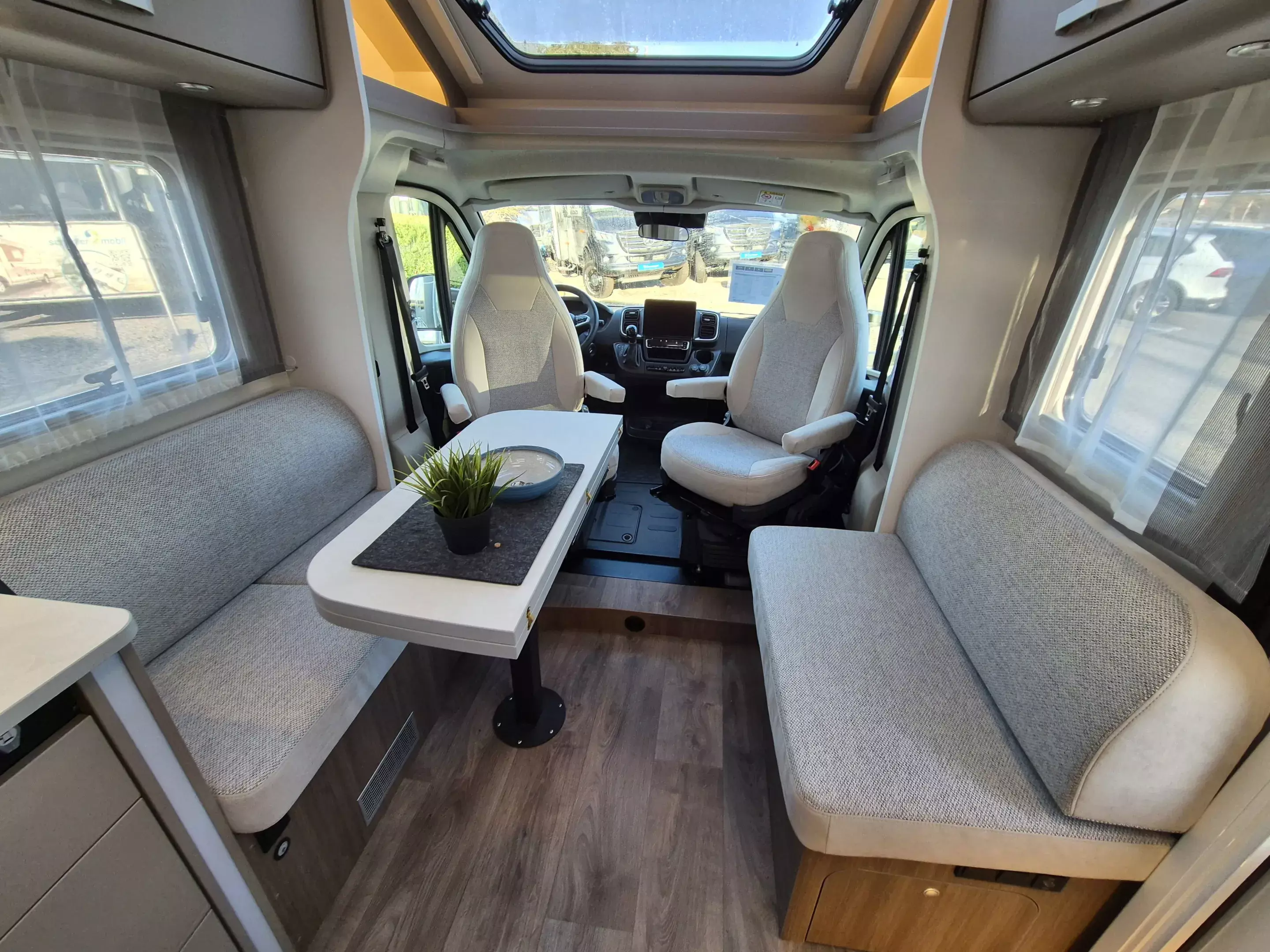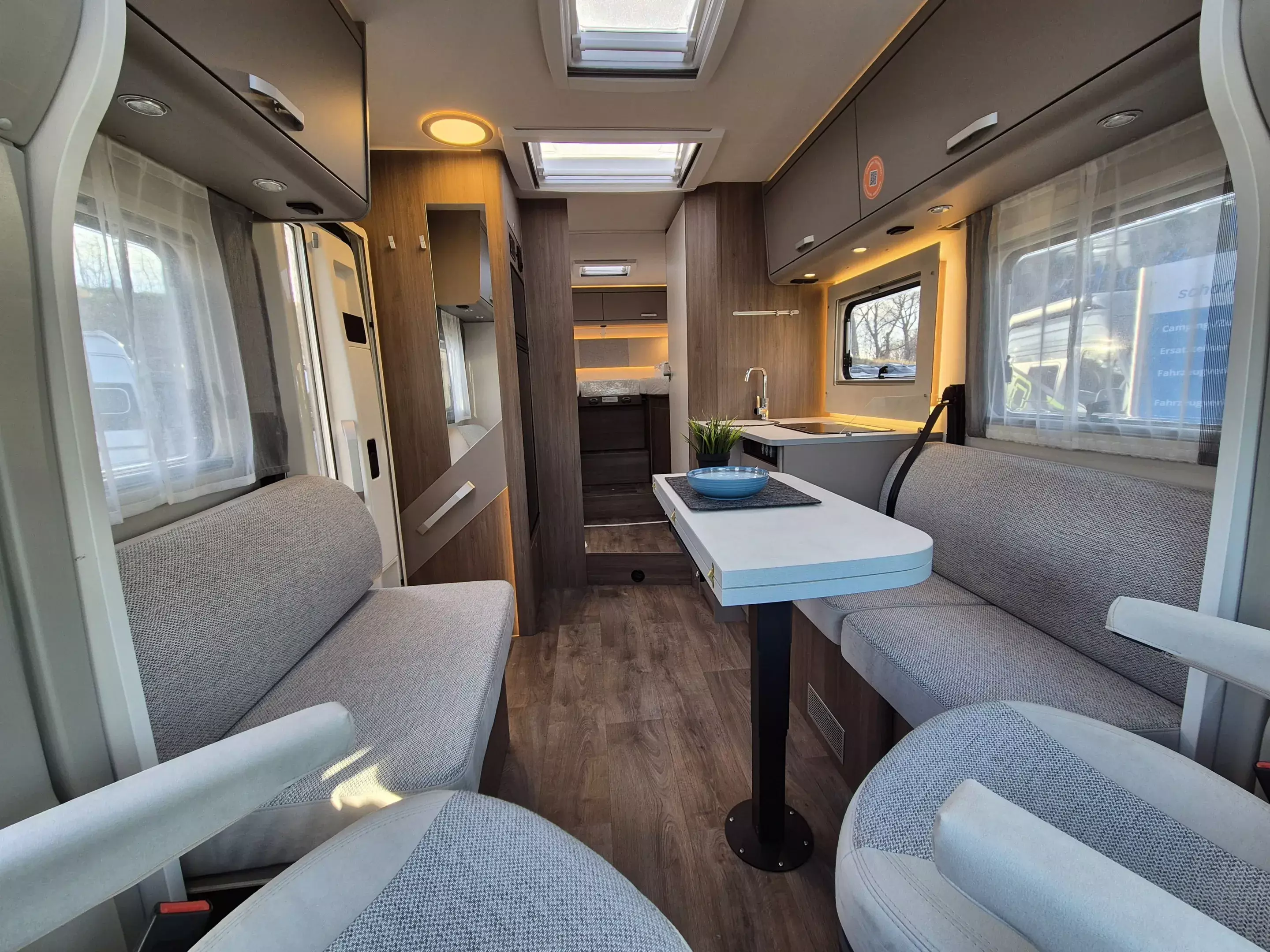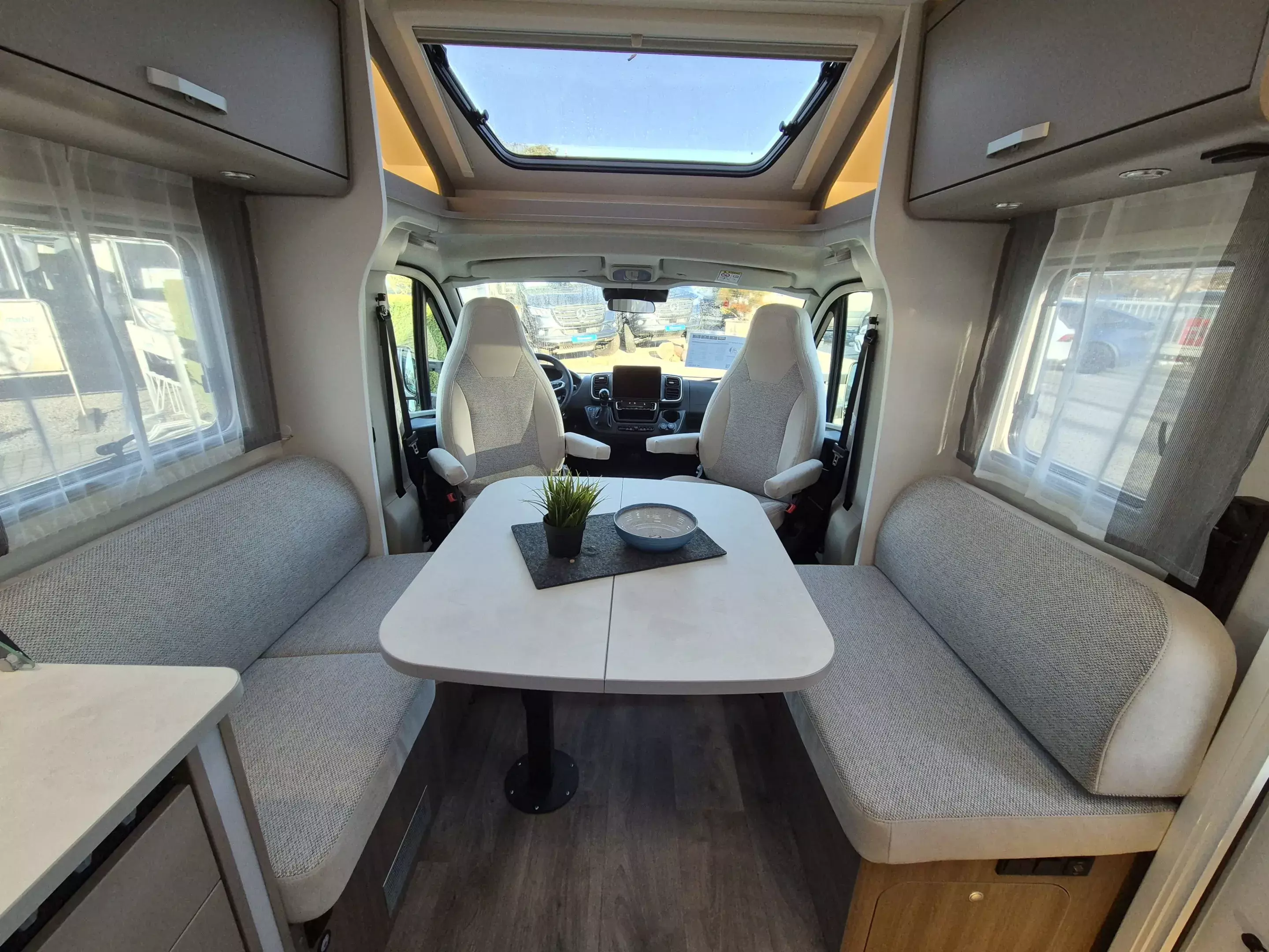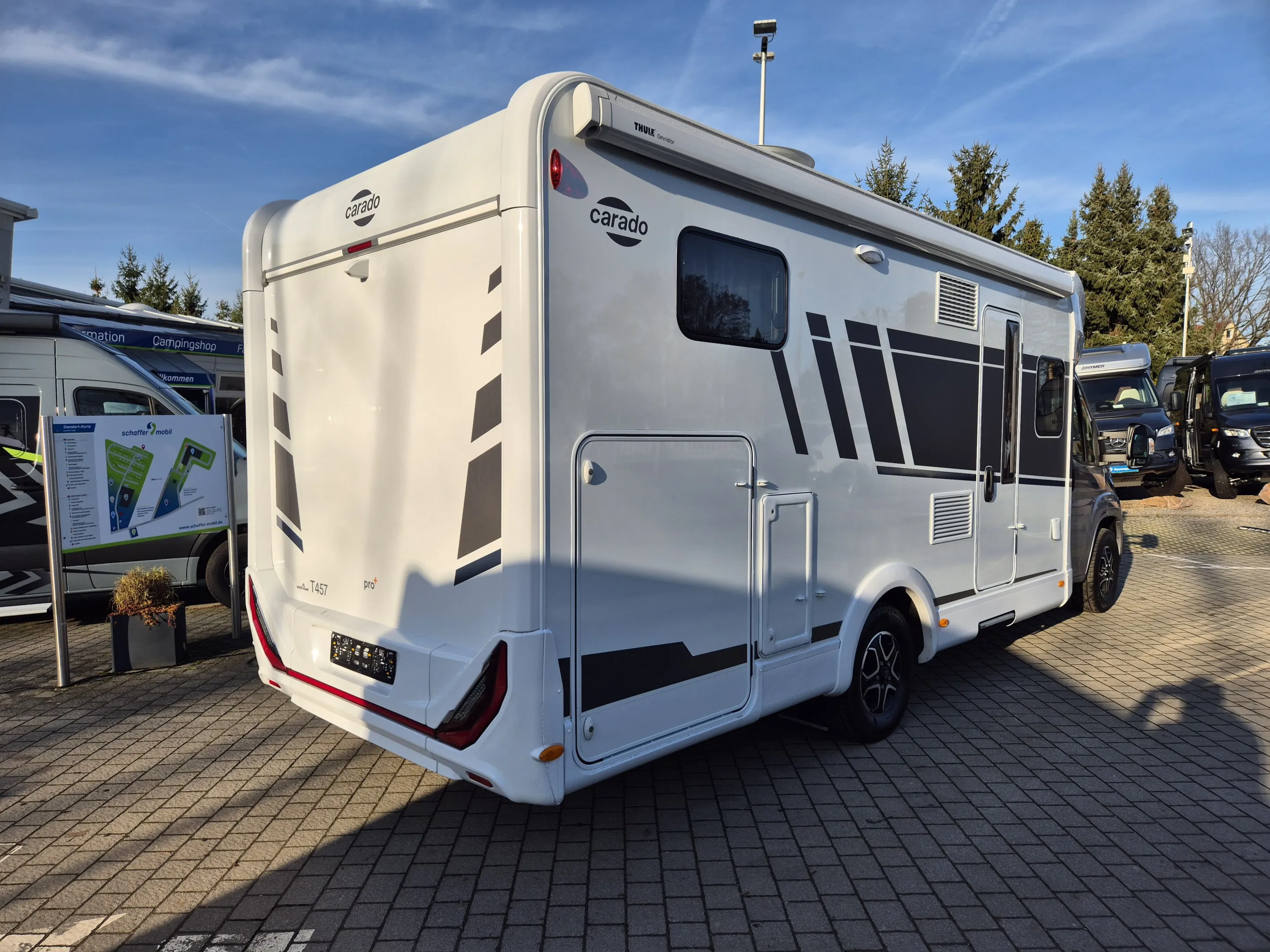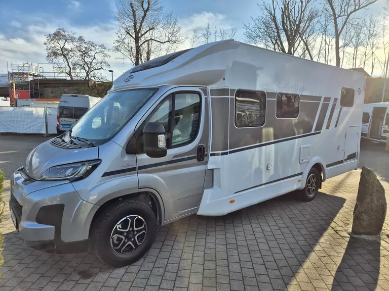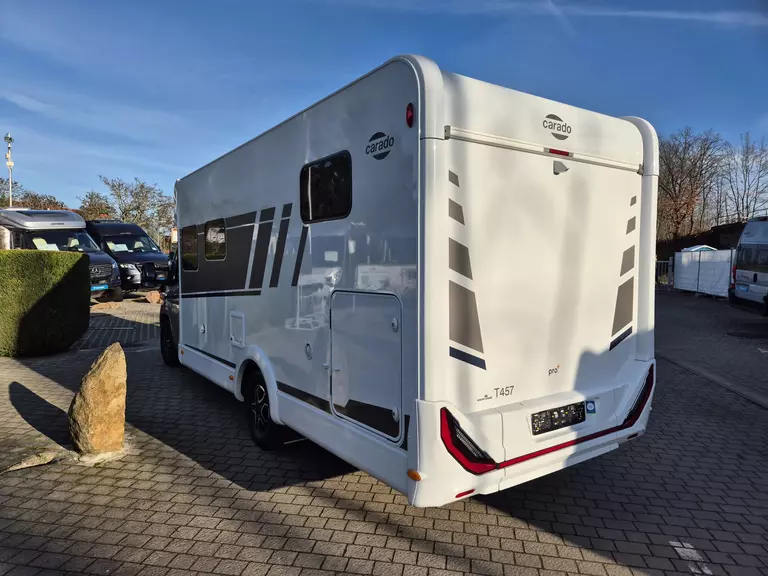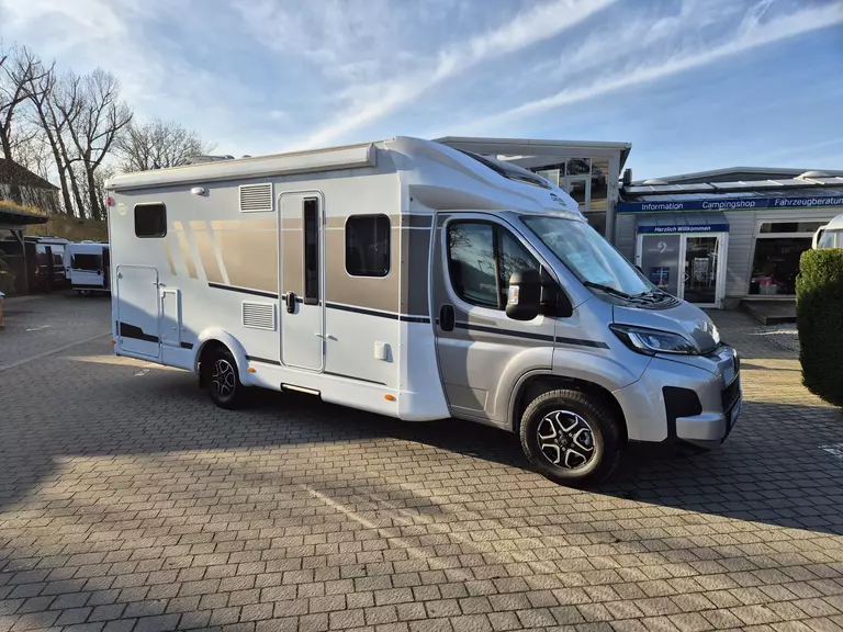 - pro+ Paket T457: Chassisfarbe Artense Grau Metallic; Faltverdunkelung Fahrerhaus; Fenster in Fronthaube; Großer Kühlschrank 156 l mit separatem Frosterfach 29 l ; Abwassertank isoliert; Markise 4,5 m; Rahmenfenster; Design Applikation Heck; Zweite Außenstauraumklappe (Größe modellabhängig) ; Beklebung pro+