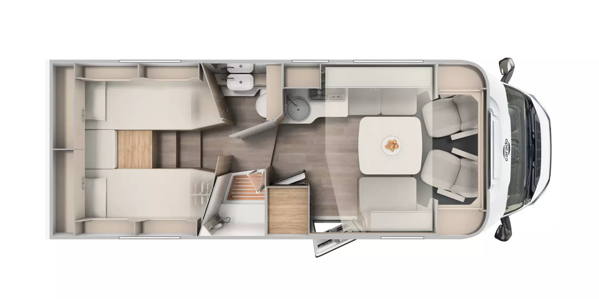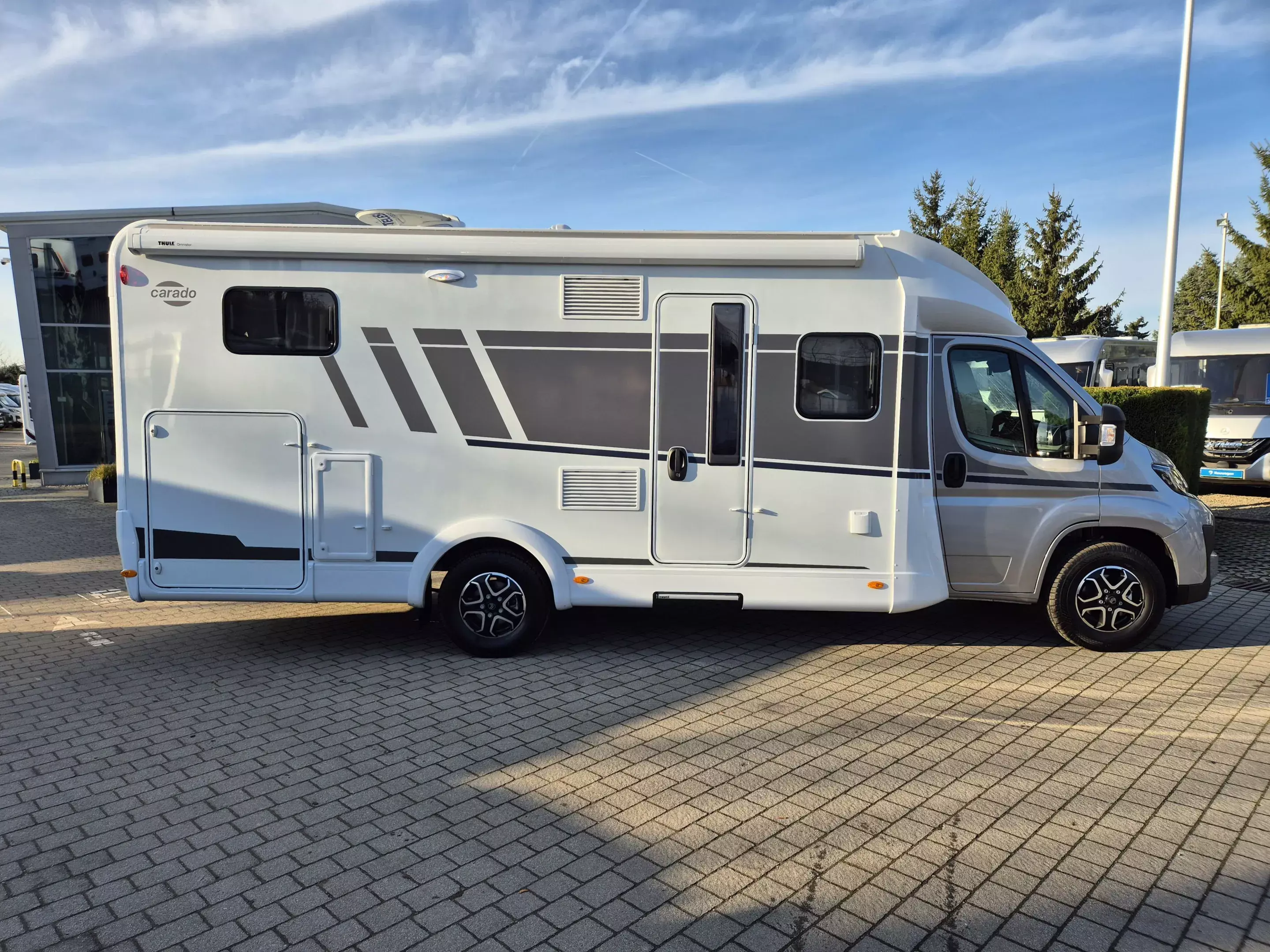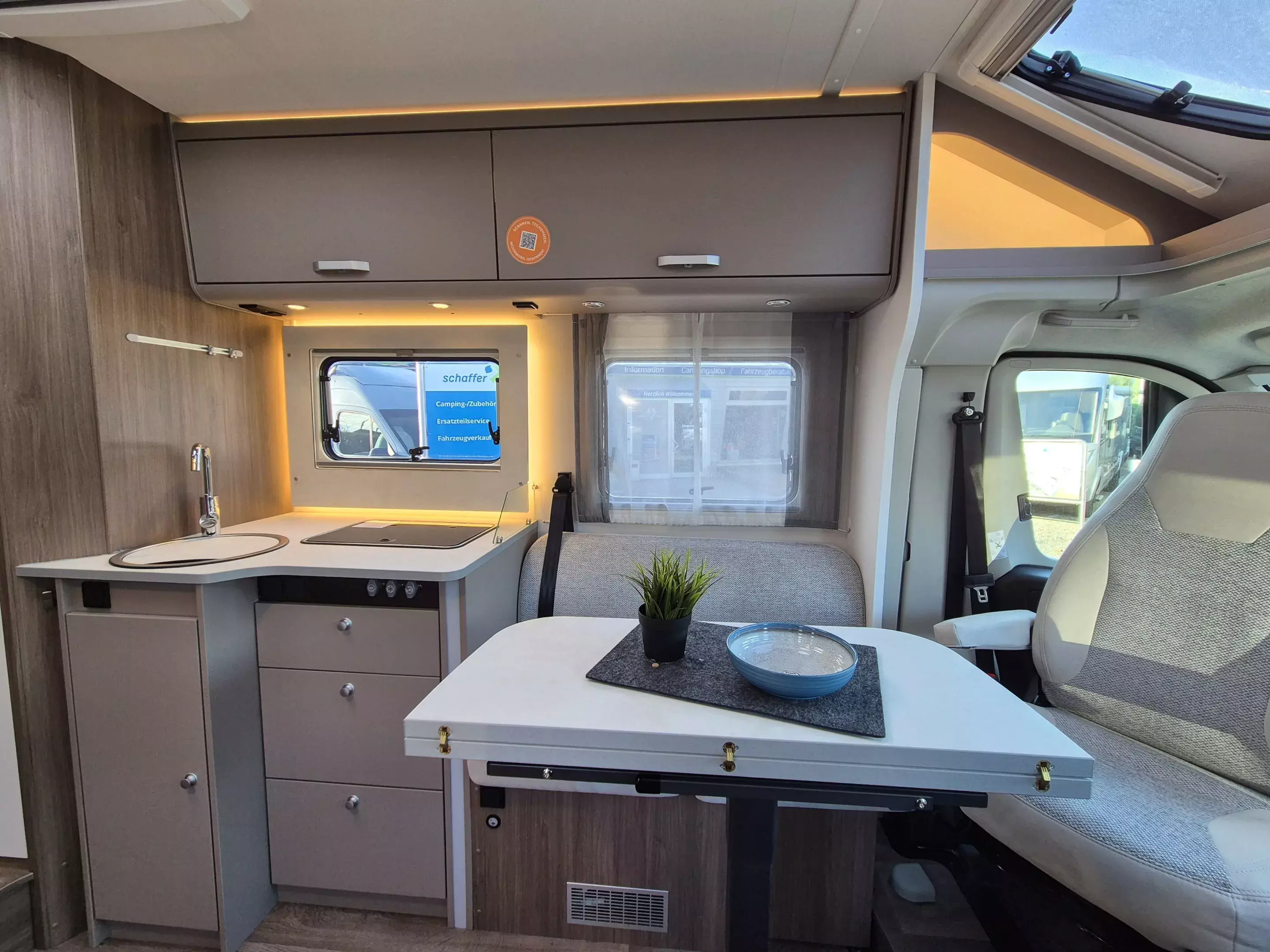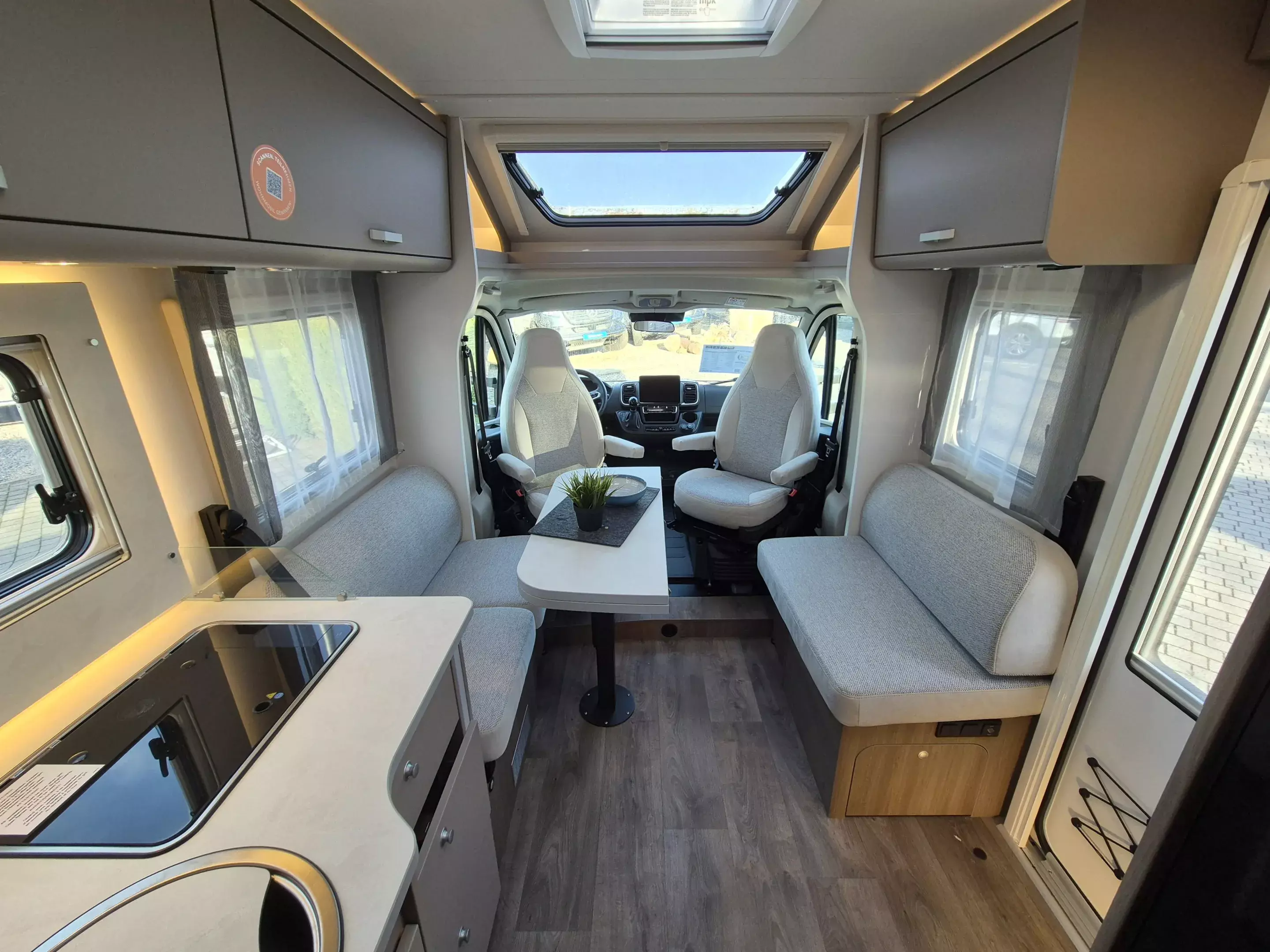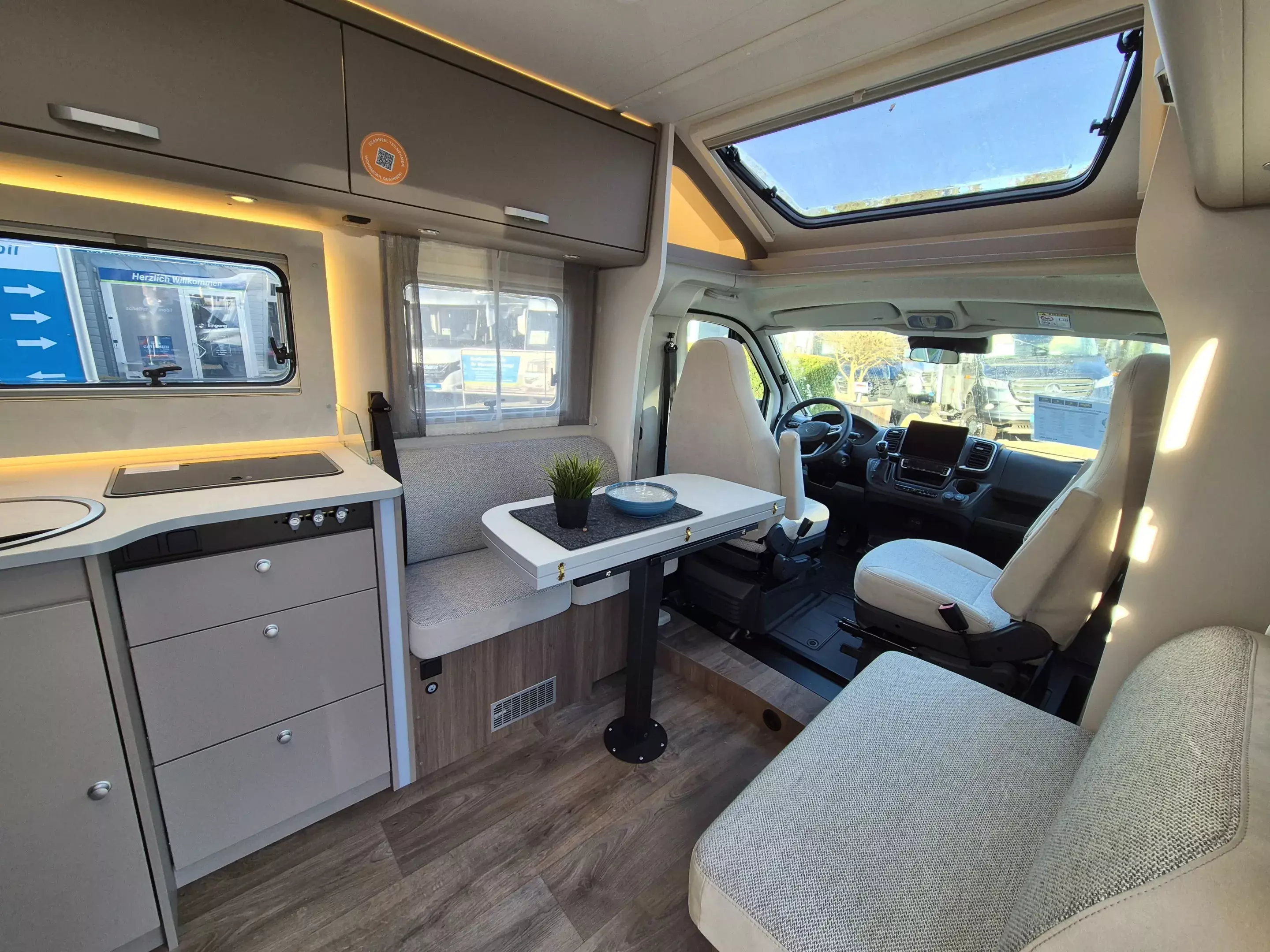 - pro+ Paket T457: Chassisfarbe Artense Grau Metallic; Faltverdunkelung Fahrerhaus; Fenster in Fronthaube; Großer Kühlschrank 156 l mit separatem Frosterfach 29 l ; Abwassertank isoliert; Markise 4,5 m; Rahmenfenster; Design Applikation Heck; Zweite Außenstauraumklappe (Größe modellabhängig) ; Beklebung pro+