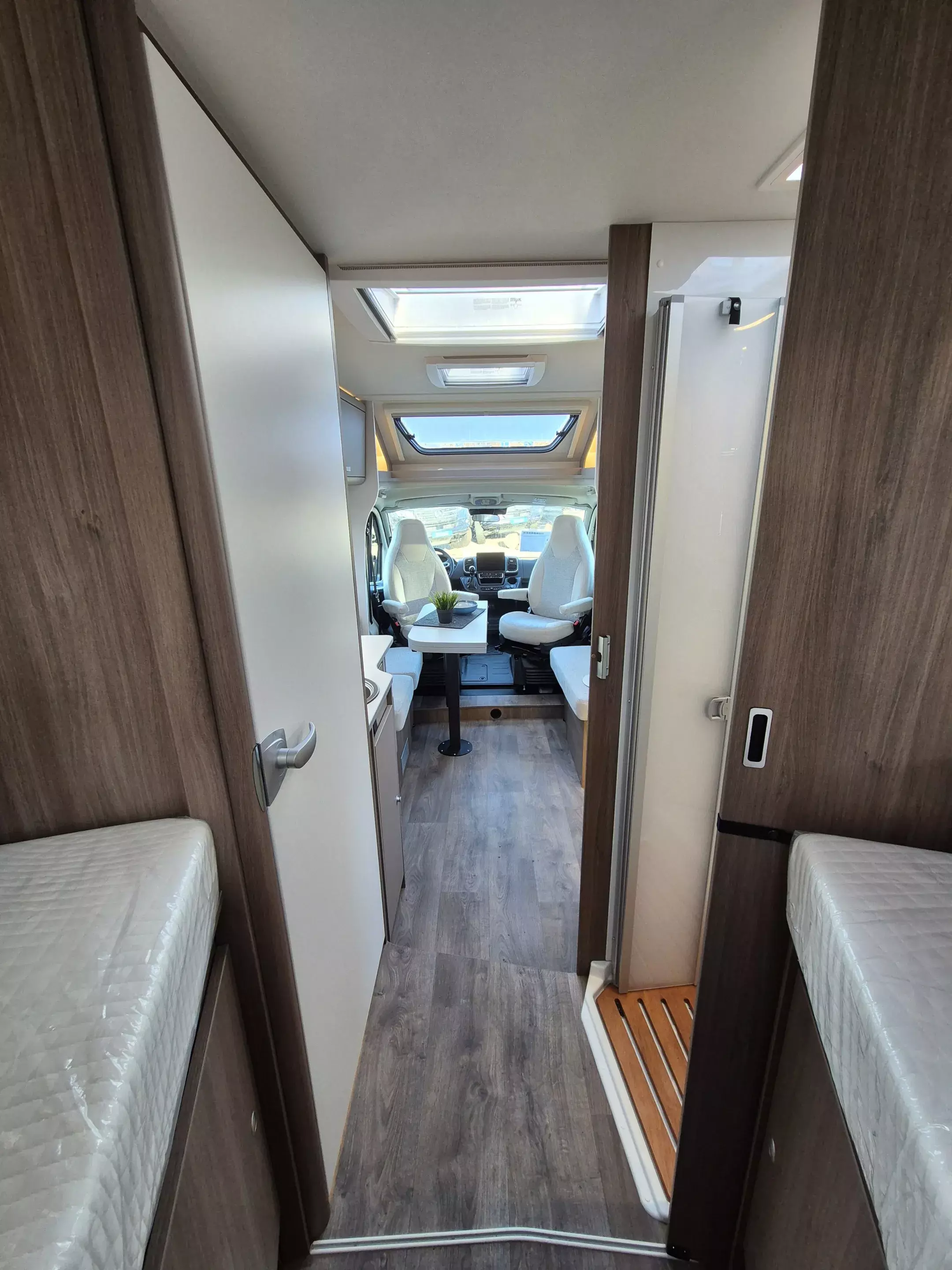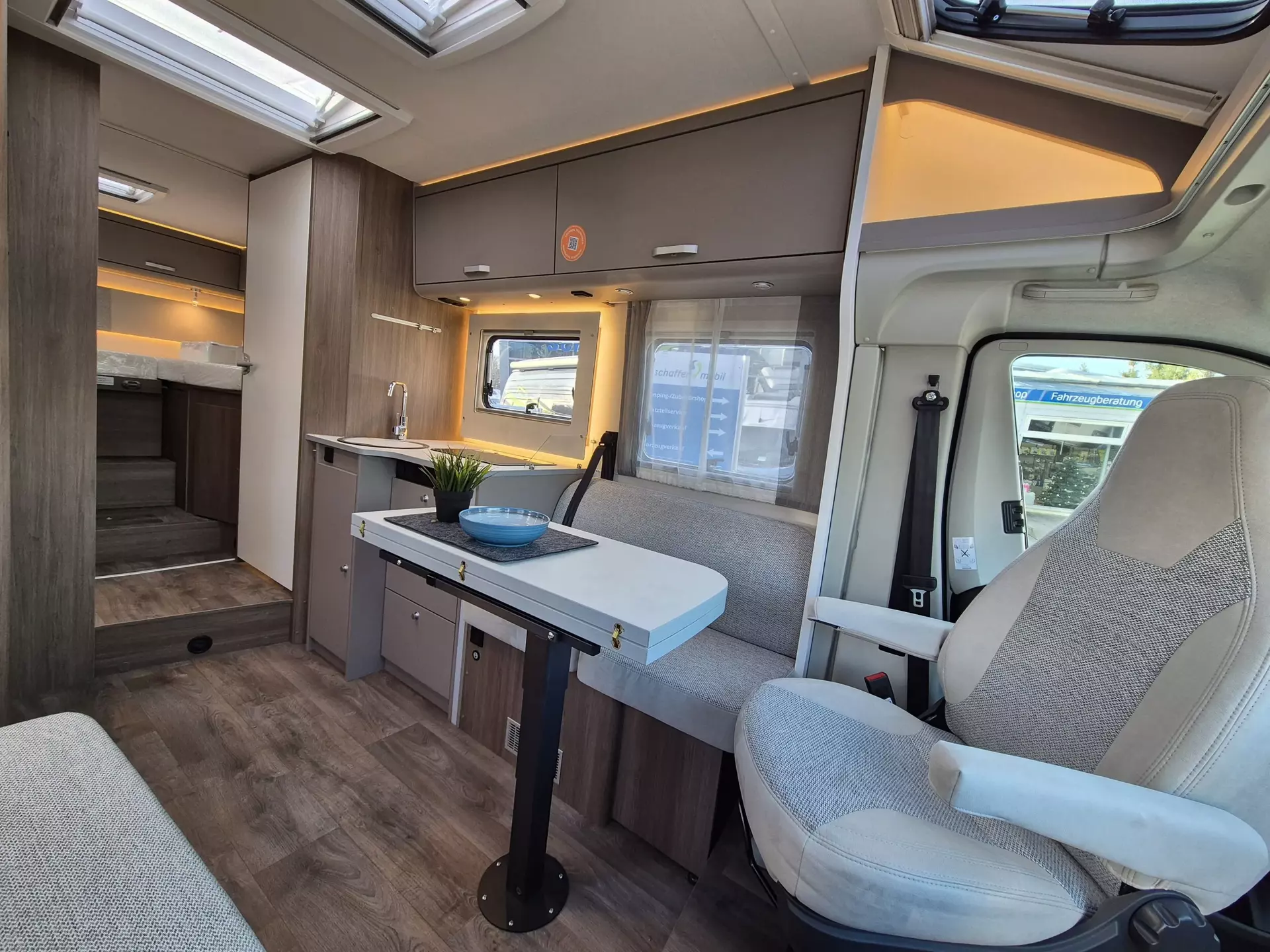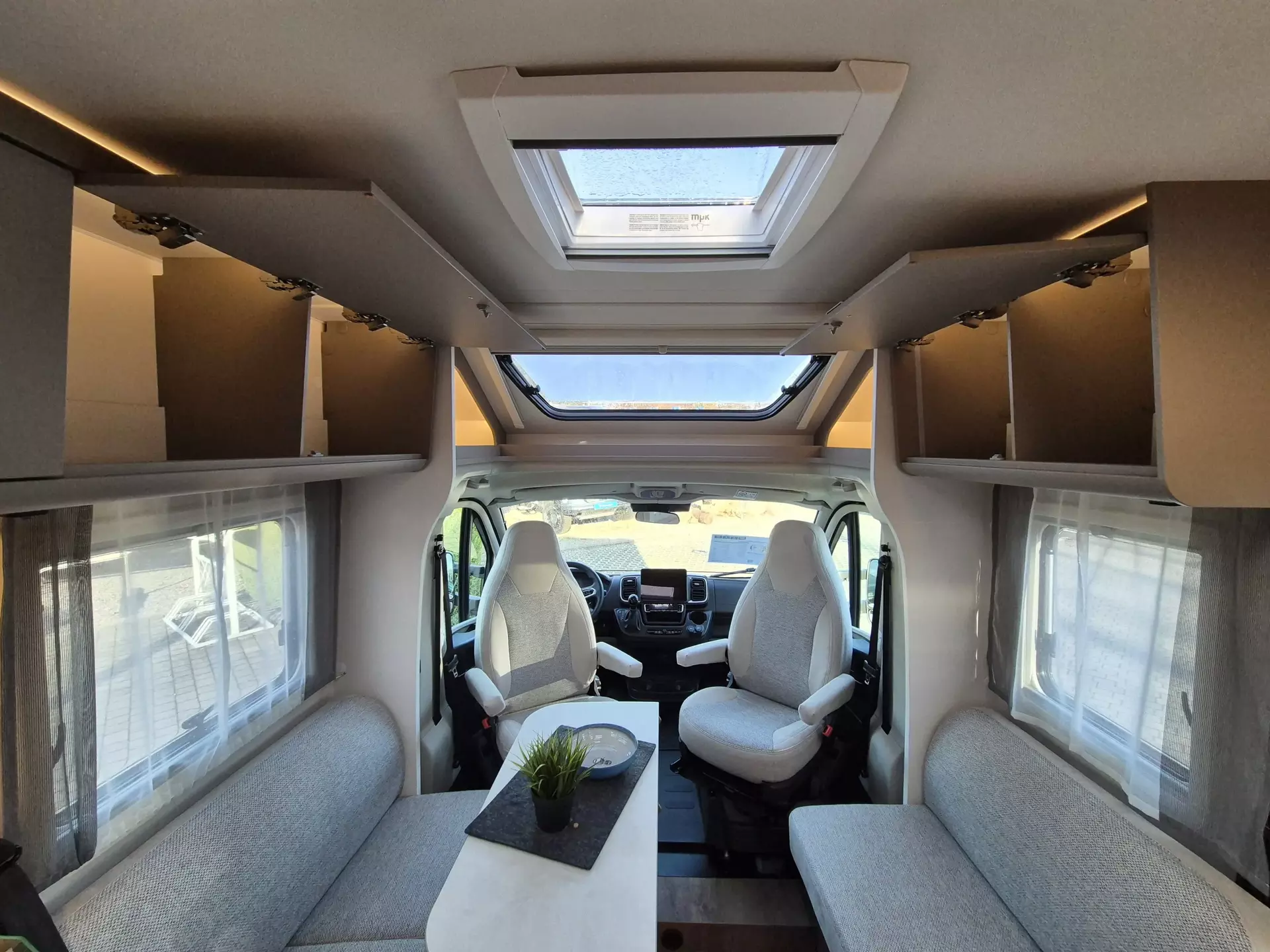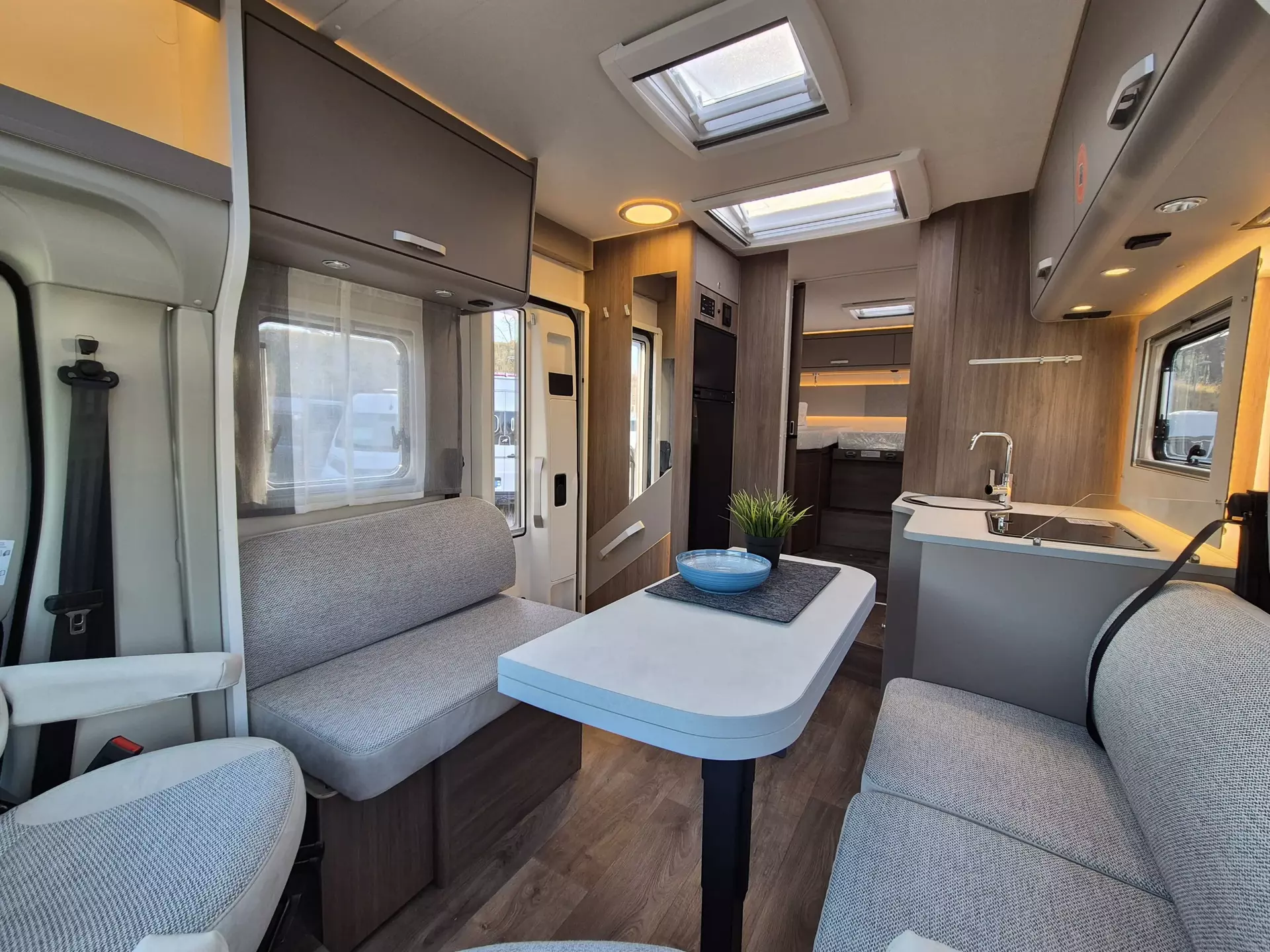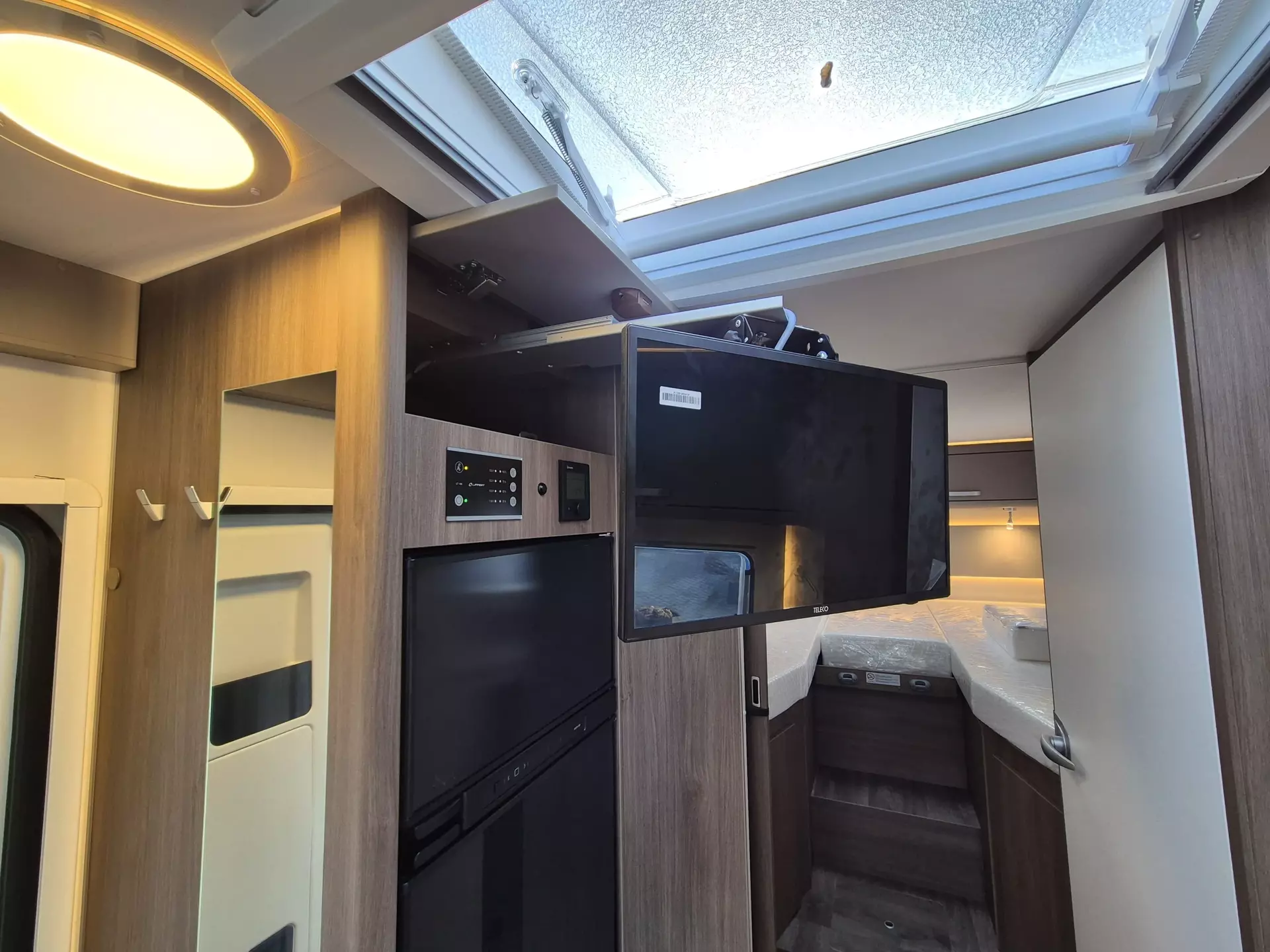 - Basic Paket: Panoramadachhaube 70 x 50 cm; Klarglasdachhaube 40 x 40 cm; Fliegengittertür (einteilig); Komfort-Eingangstür mit Fenster und Verdunkelung; Bridge Light