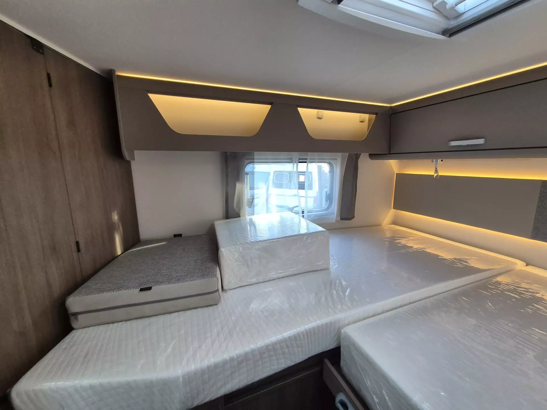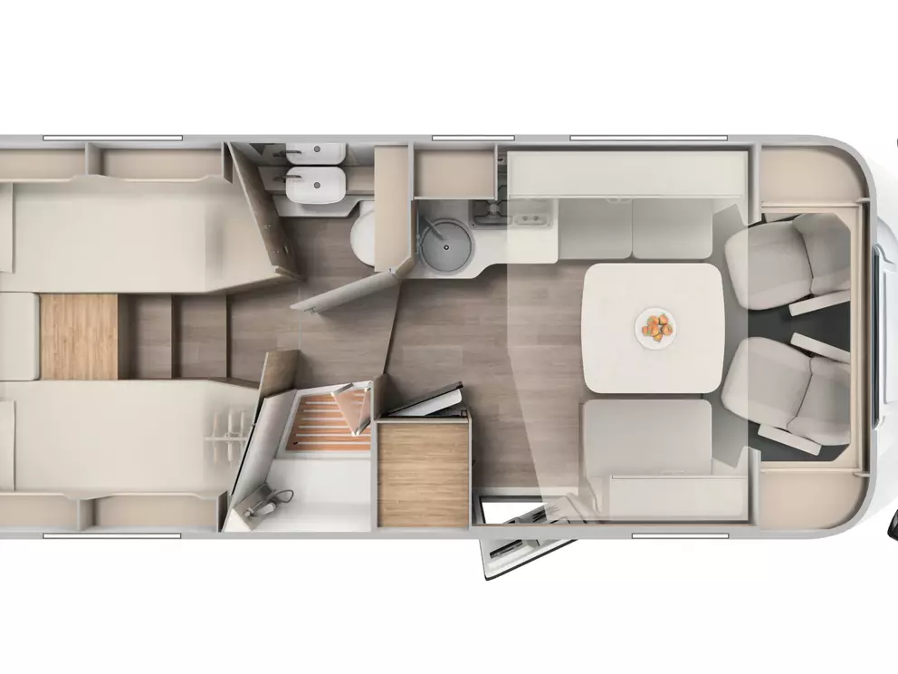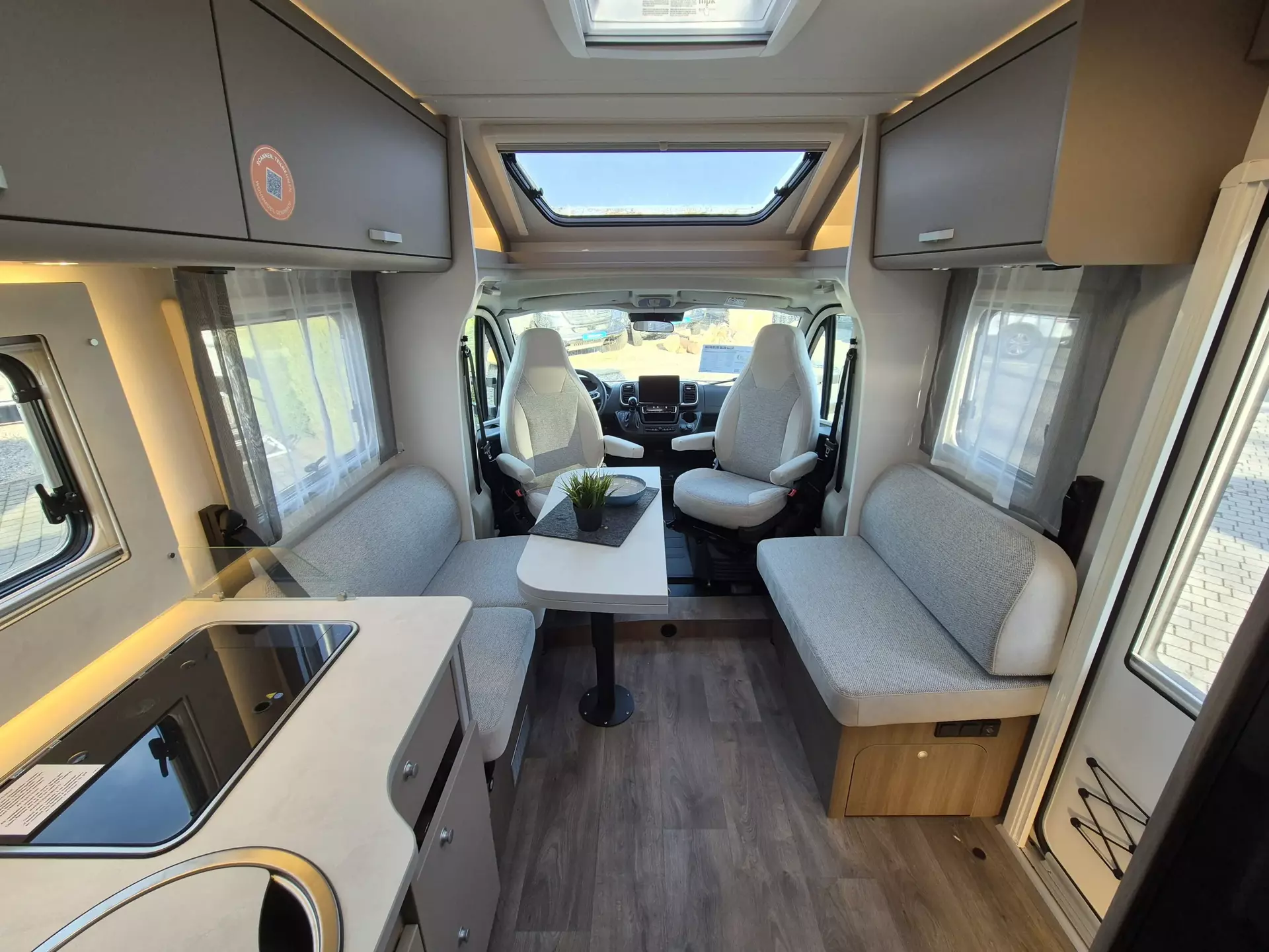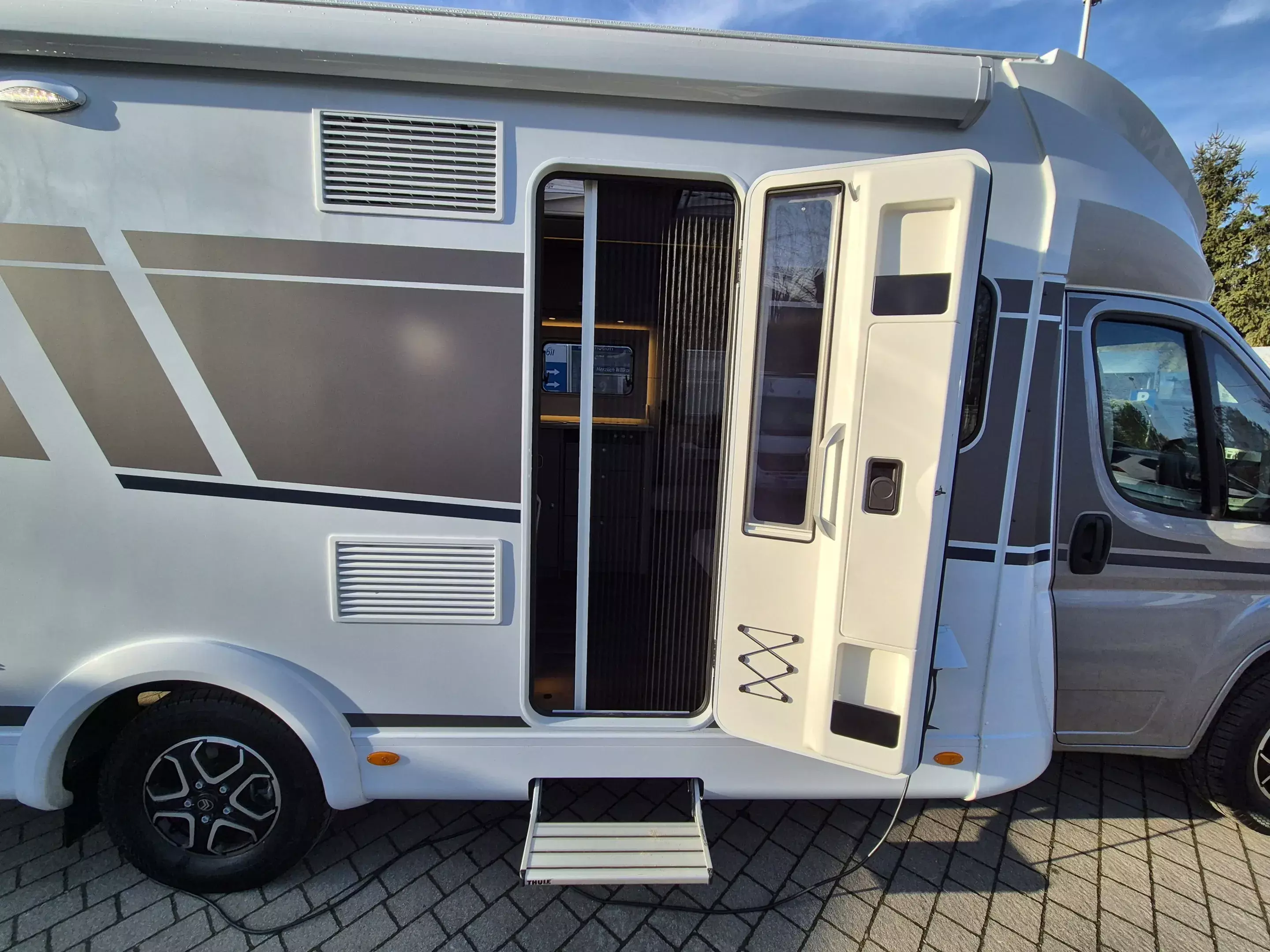 - Basic Paket: Panoramadachhaube 70 x 50 cm; Klarglasdachhaube 40 x 40 cm; Fliegengittertür (einteilig); Komfort-Eingangstür mit Fenster und Verdunkelung; Bridge Light