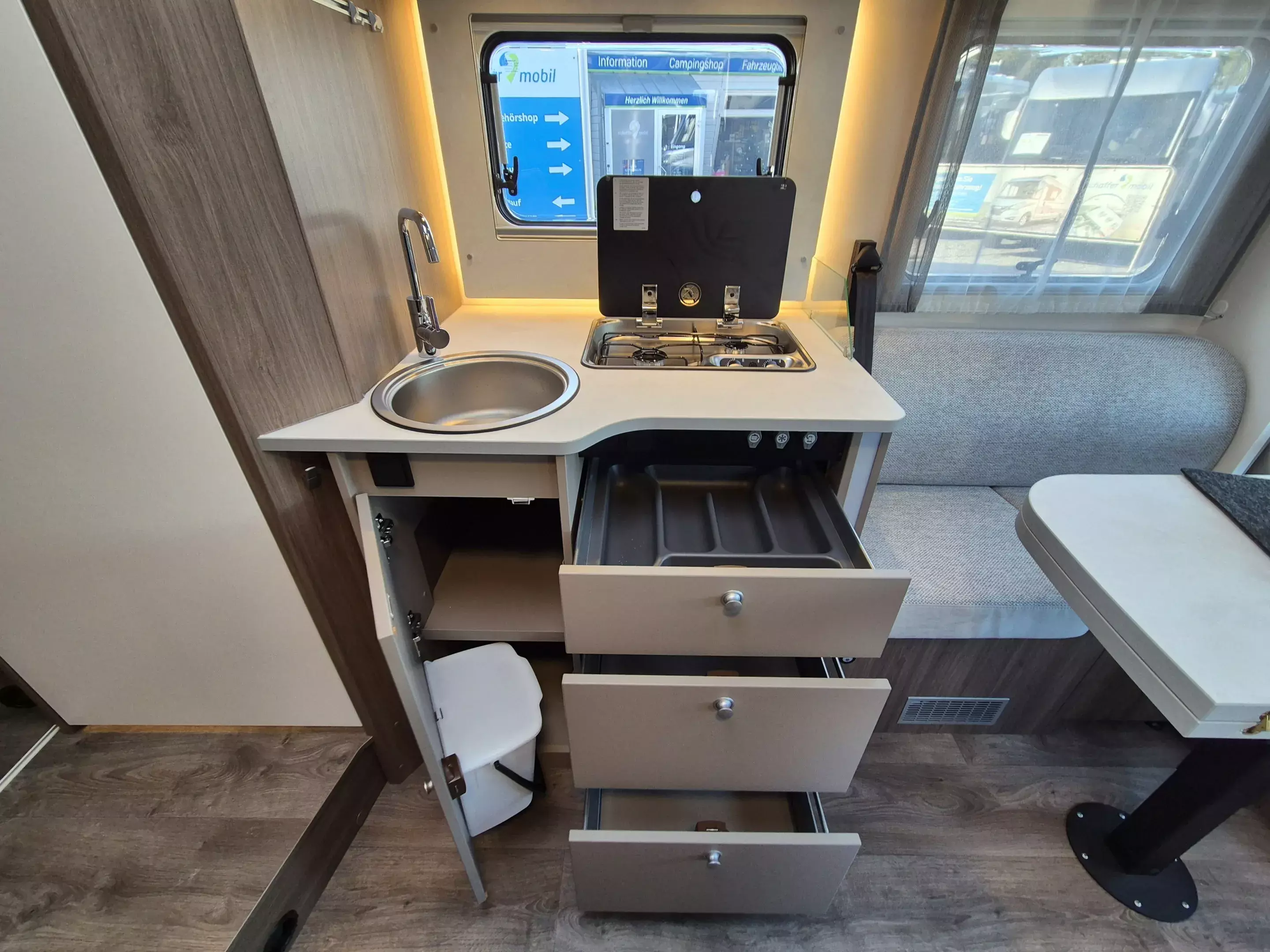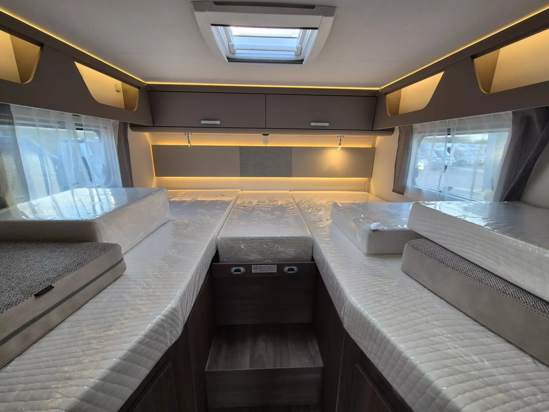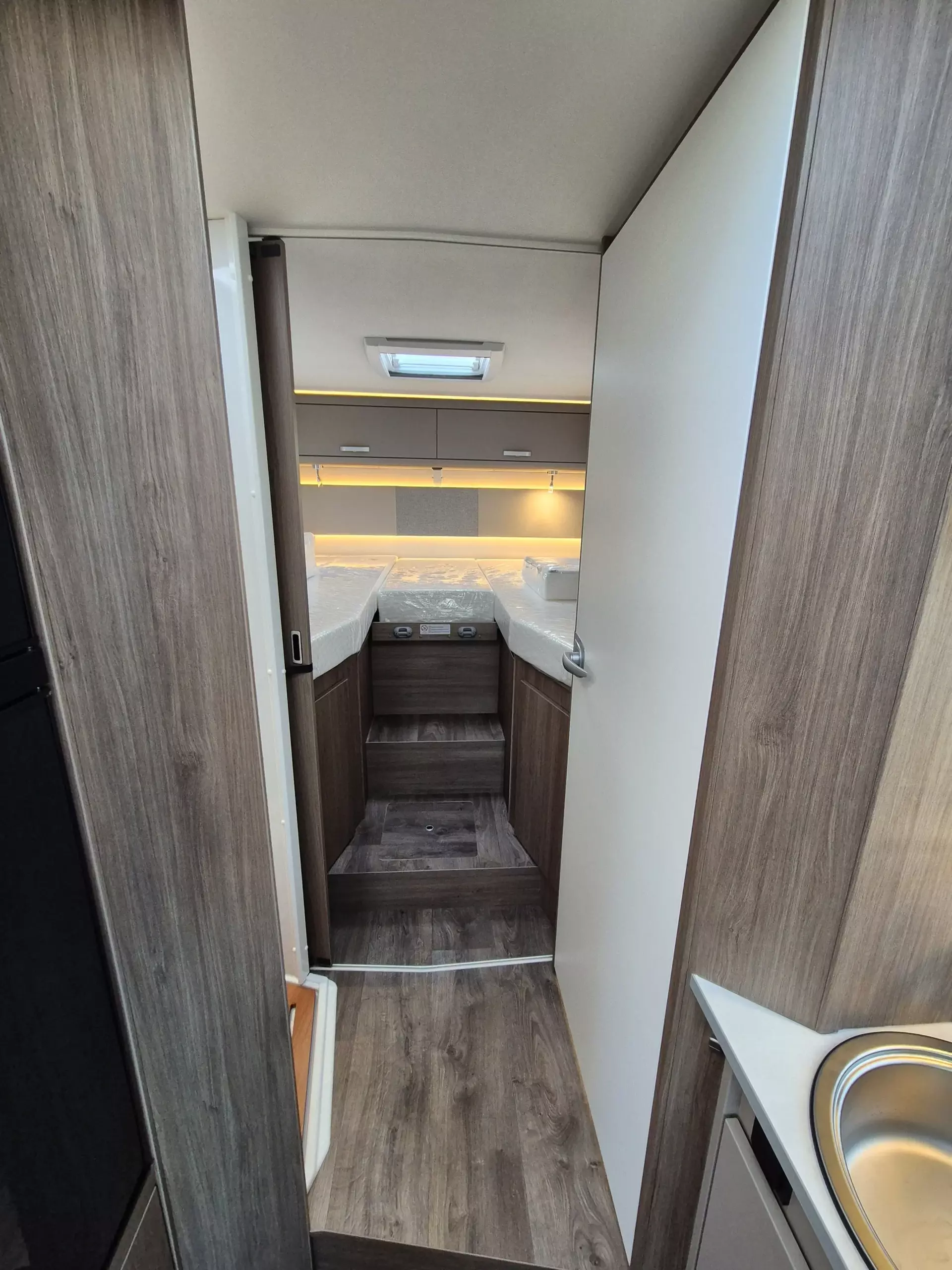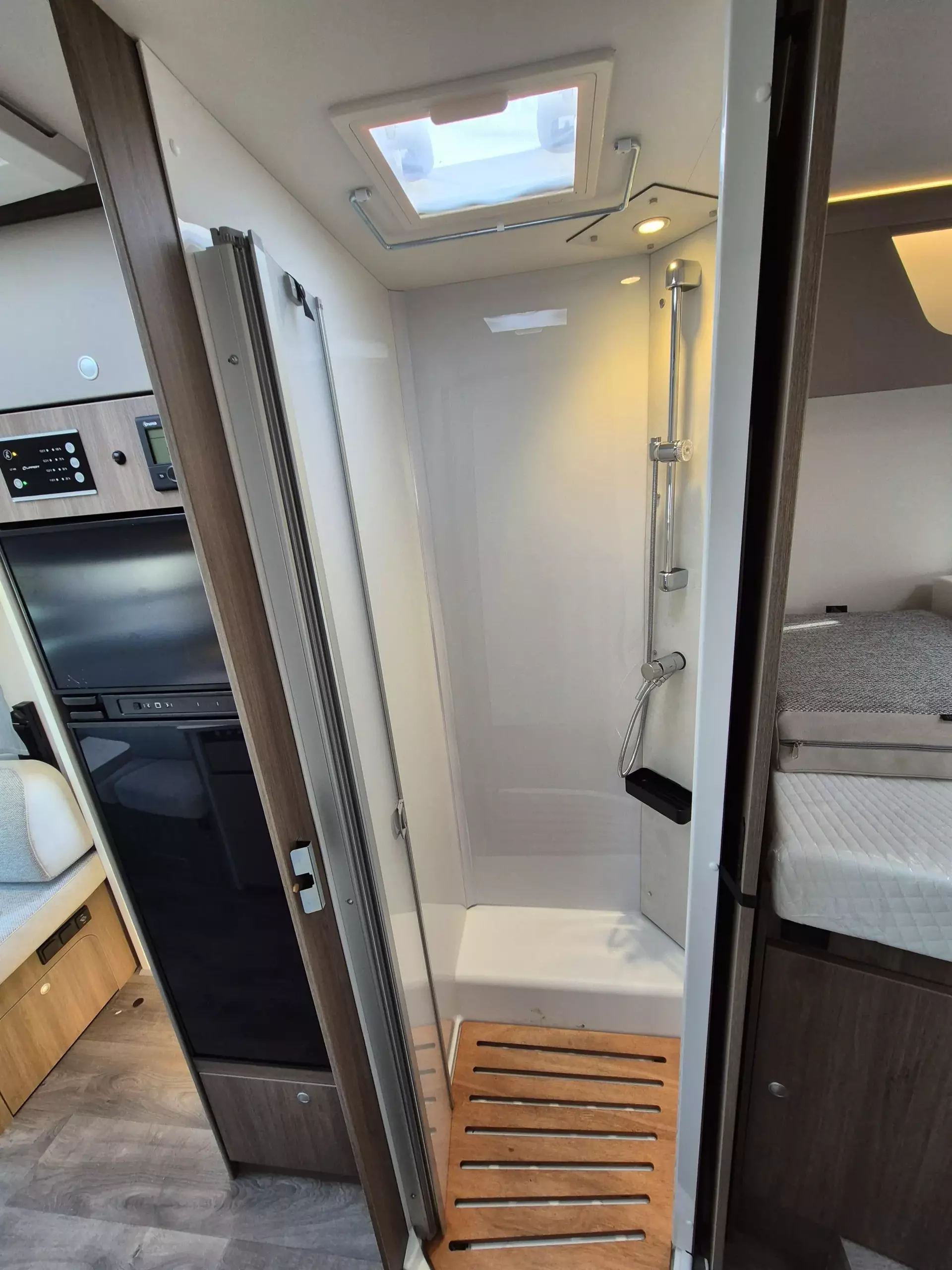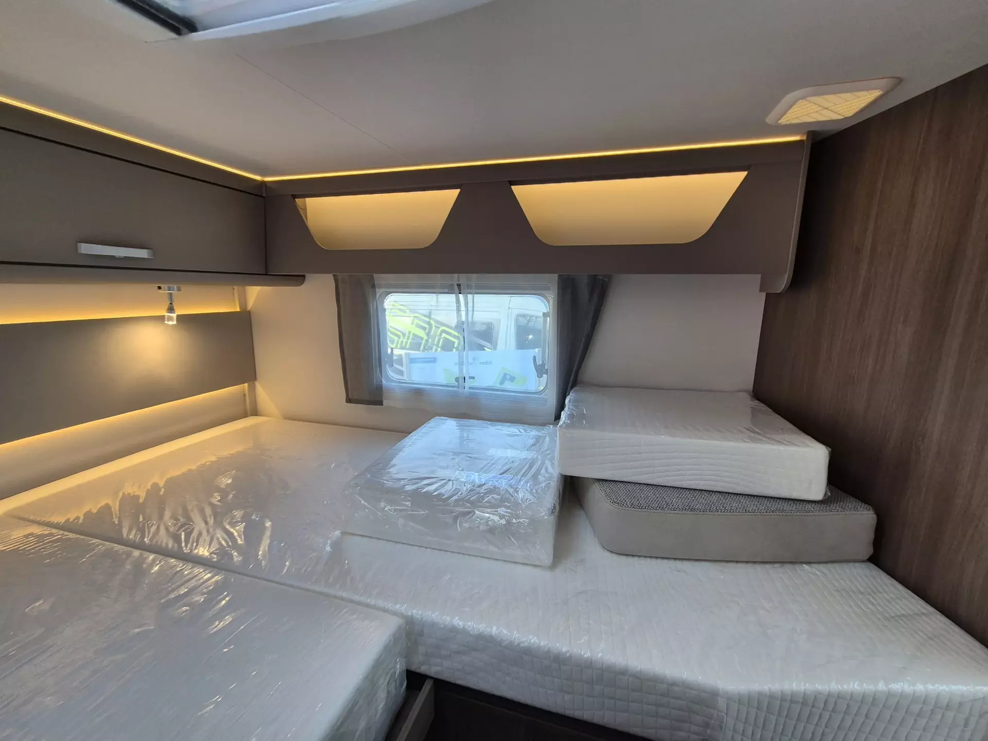 - Basic Paket: Panoramadachhaube 70 x 50 cm; Klarglasdachhaube 40 x 40 cm; Fliegengittertür (einteilig); Komfort-Eingangstür mit Fenster und Verdunkelung; Bridge Light