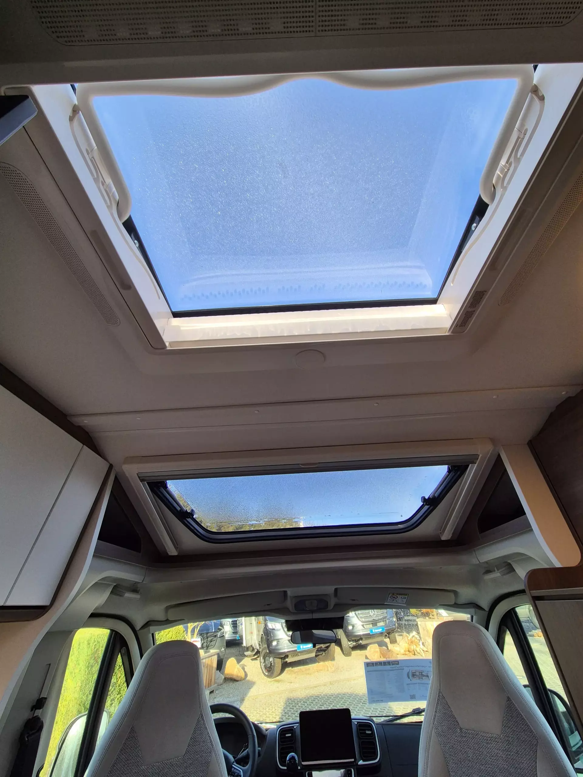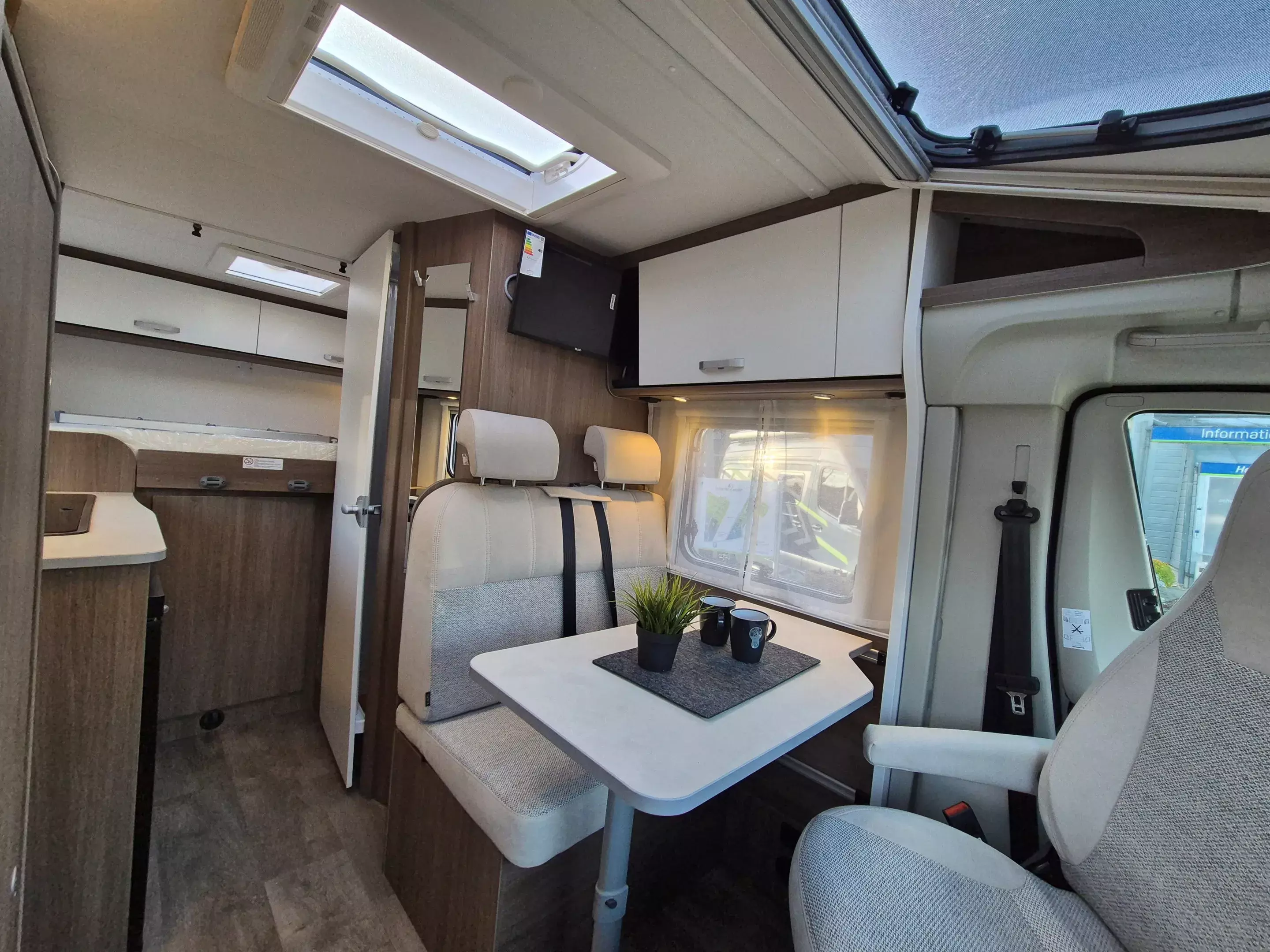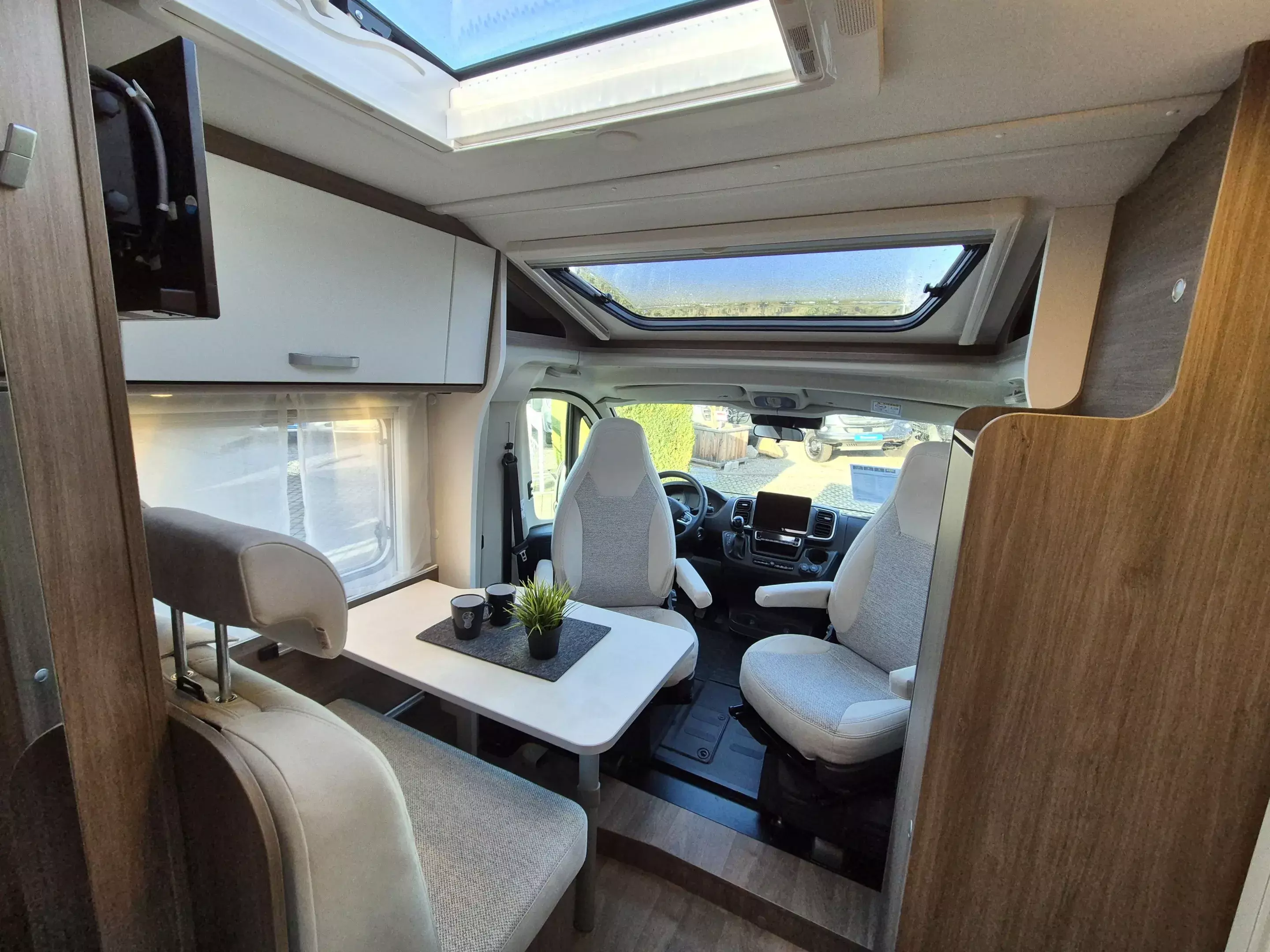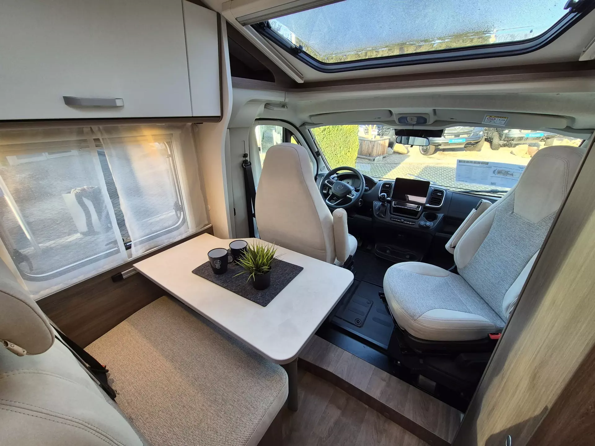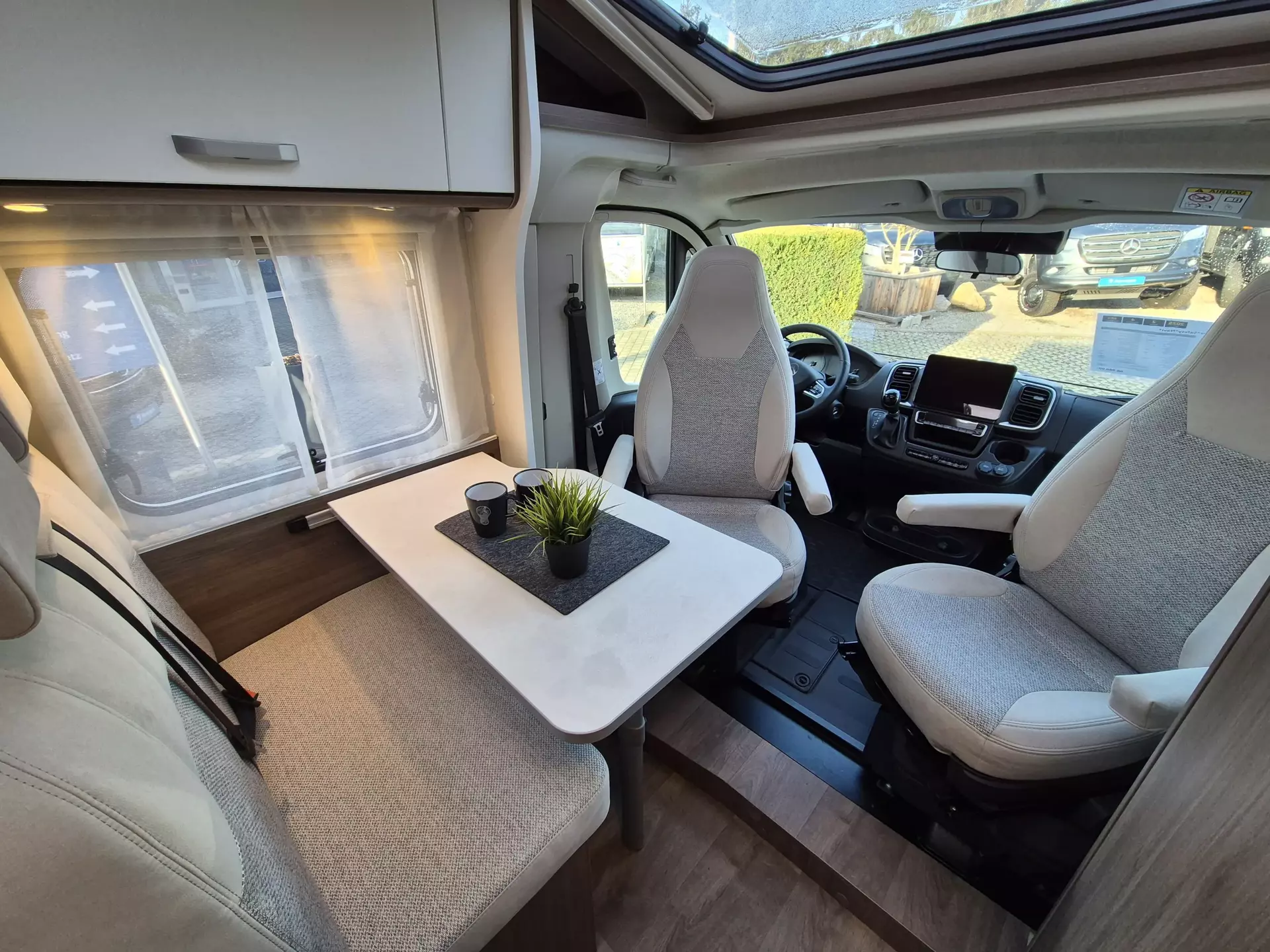 - pro+ Paket: Faltverdunkelung Fahrerhaus; Fenster in Fronthaube; Sonderfarbe Dachstauschrankklappen und Türen in Cosy White; Beklebung pro+; Markise 3,5 m ; Abwassertank isoliert; Zweite Außenstauraumklappe (Größe modellabhängig)
