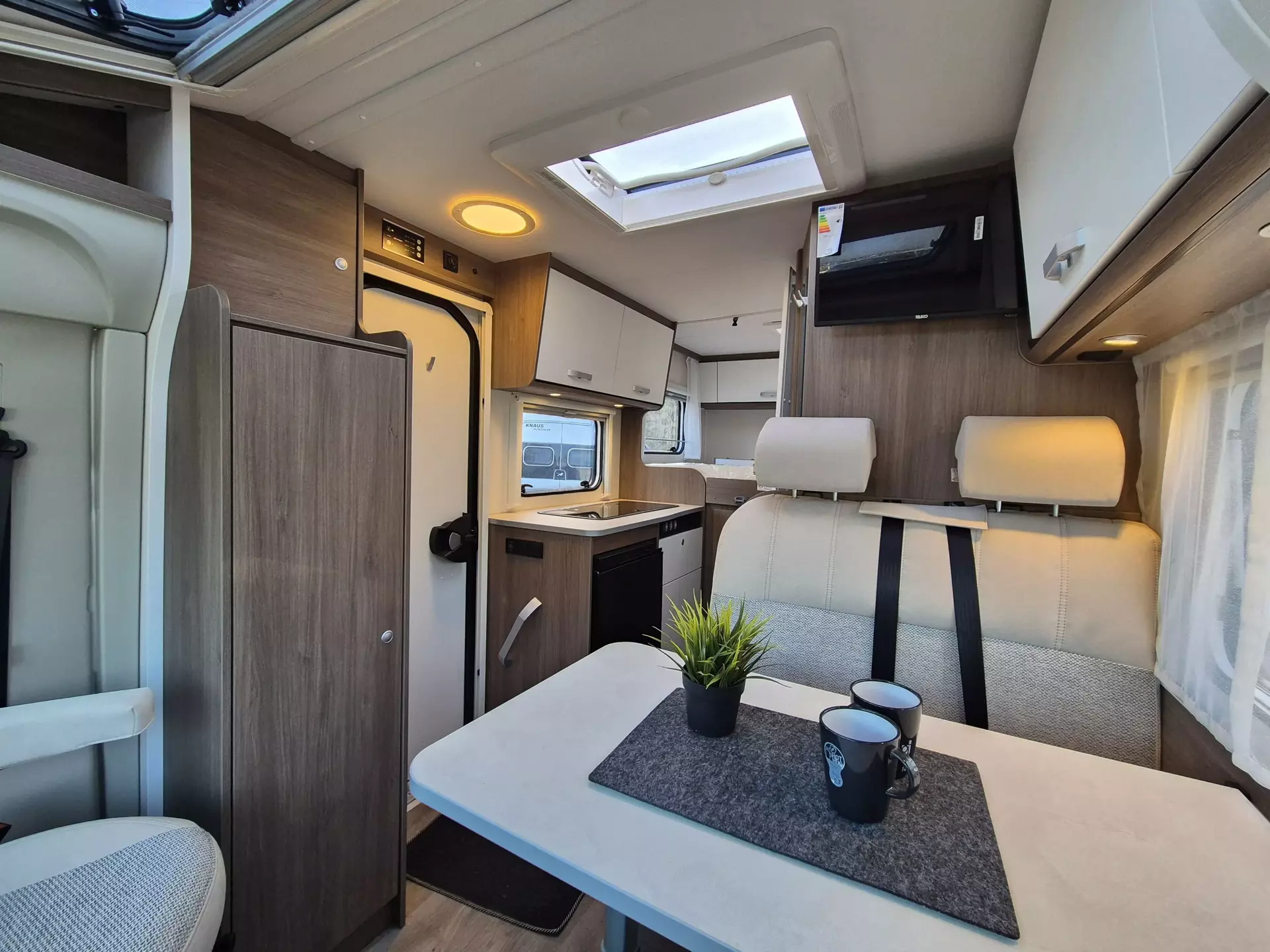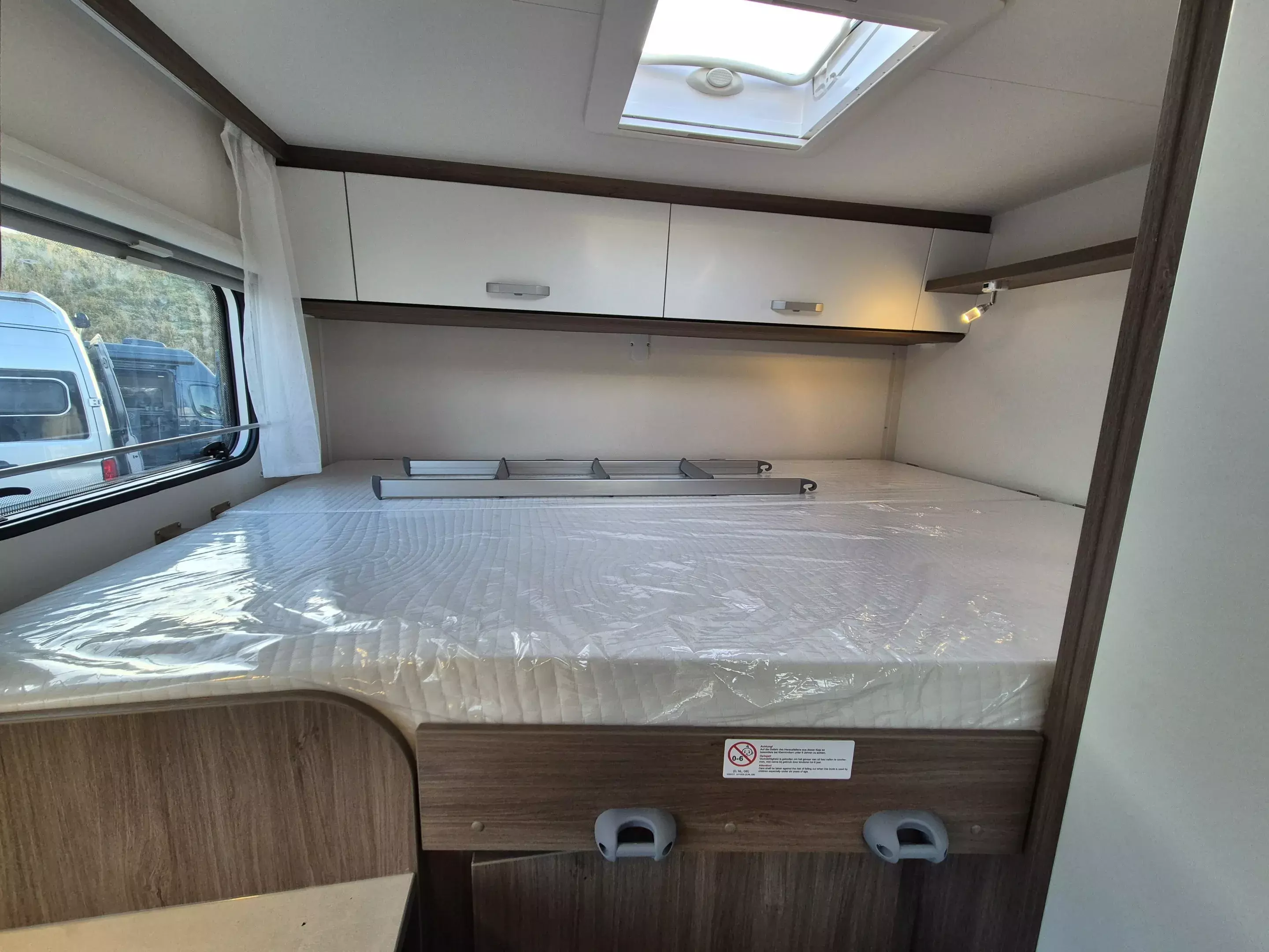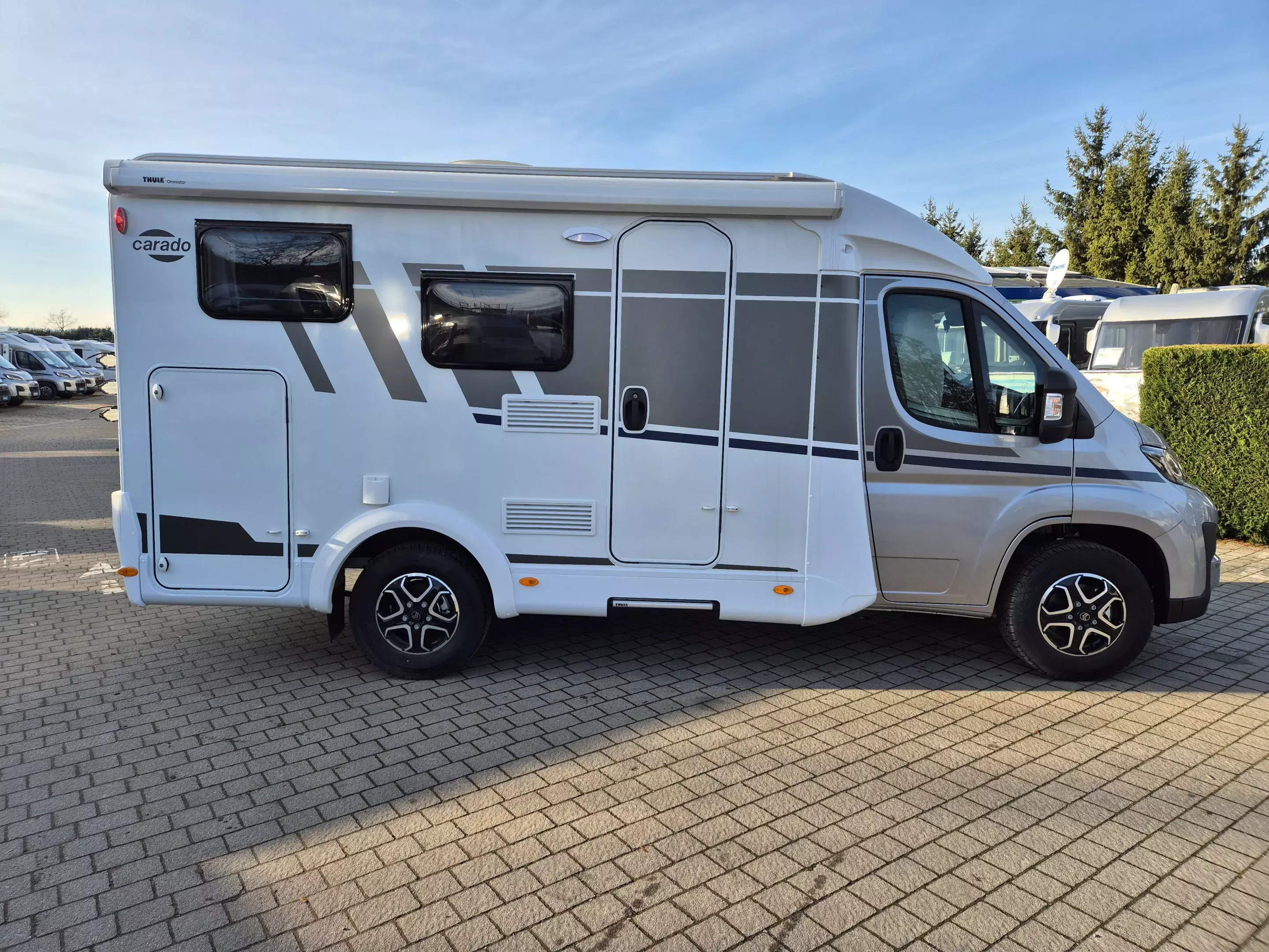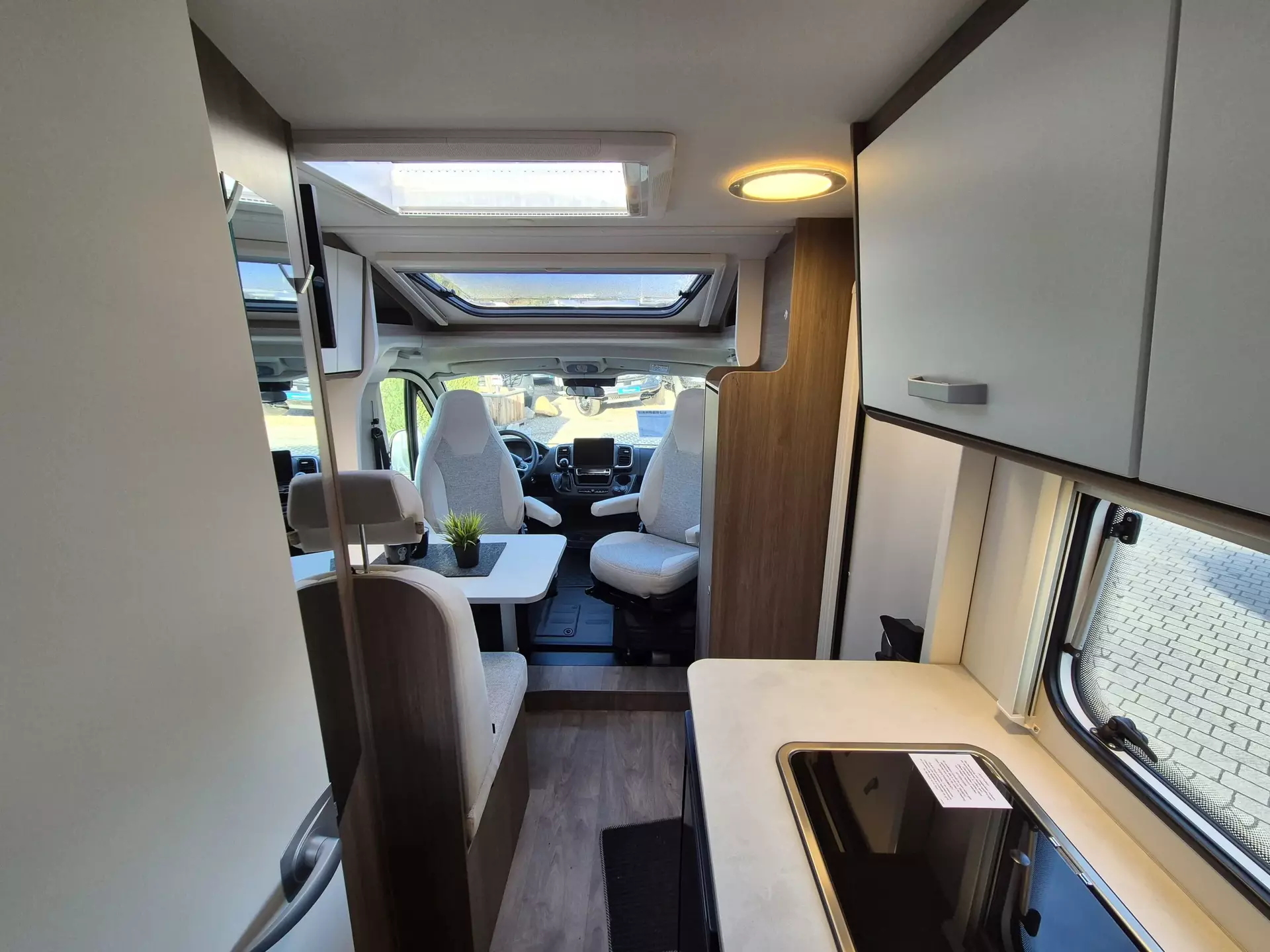 - pro+ Paket: Faltverdunkelung Fahrerhaus; Fenster in Fronthaube; Sonderfarbe Dachstauschrankklappen und Türen in Cosy White; Beklebung pro+; Markise 3,5 m ; Abwassertank isoliert; Zweite Außenstauraumklappe (Größe modellabhängig)
