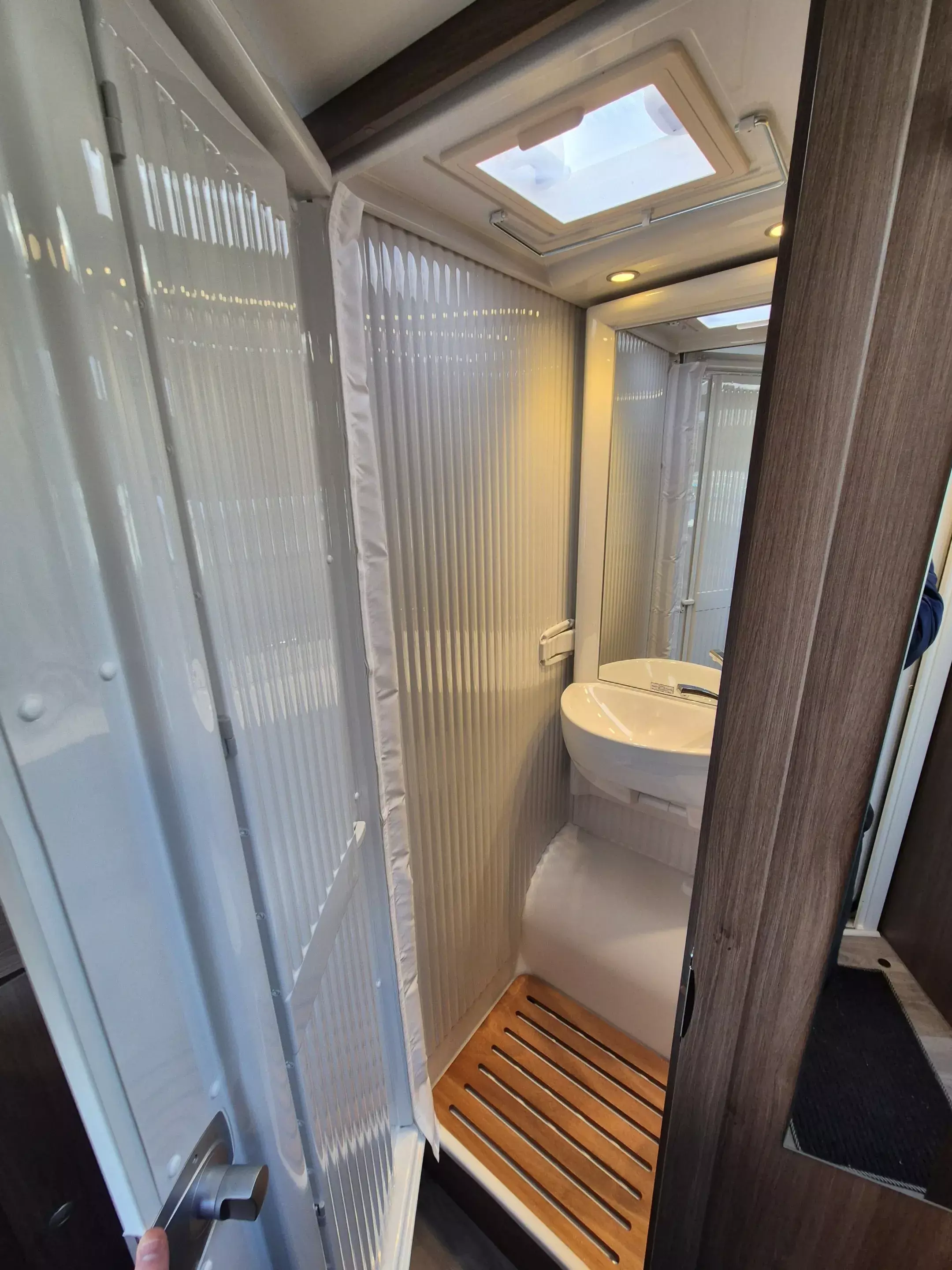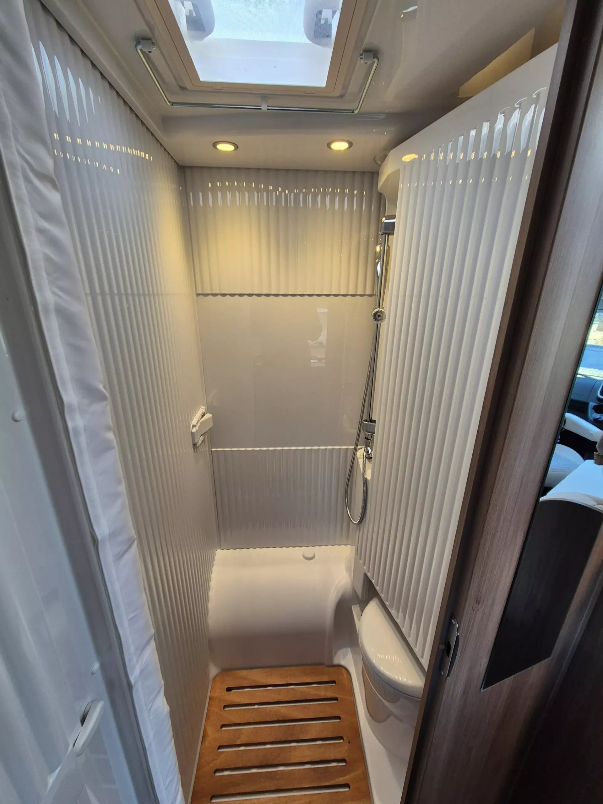 - Basic Paket: Panoramadachhaube 70 x 50 cm; Klarglasdachhaube 40 x 40 cm; Spiegel mit Garderobenhaken; Bridge Light; Fliegengittertür (einteilig)