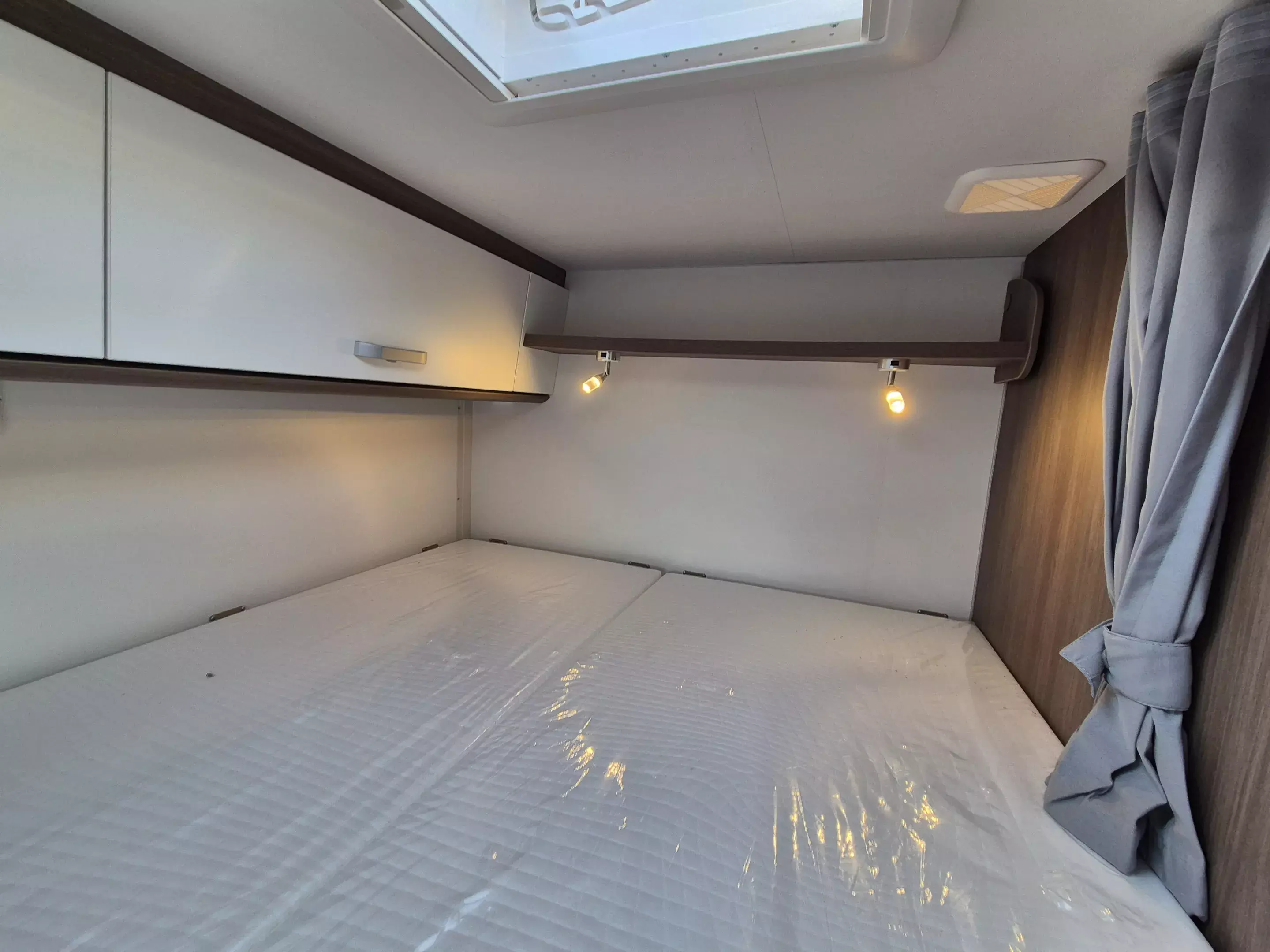 * Im Innenraum sorgt die Wohnwelt „Weiß“ zusammen mit der großen Panoramadachhaube für ein helles, freundliches Raumgefühl. Die Einzelbetten im Heck bieten viel Komfort, während die praktische Heckgarage genug Platz für Campingzubehör oder Fahrräder bietet. Die Seitensitzgruppe und die klar strukturierte Küche machen das Fahrzeug ideal für längere Reisen.