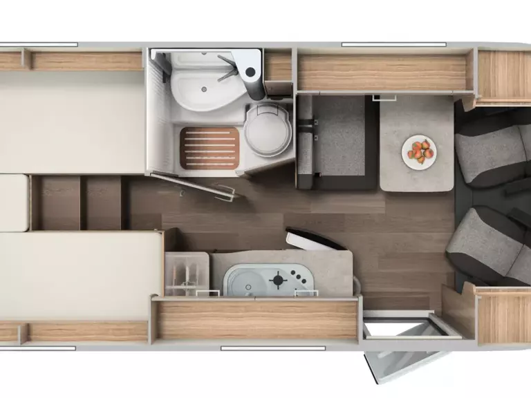 - Basic Paket -Beifahrersitz höhenverstellbar, Panoramadachhaube über Sitzgruppe, Klarglasdachhaube 40 x 40 cm, Duschraumverkleidung, Spiegel mit Garderobenhaken, Captain Chair mit Bezügen, Zusätzliche Steckdose im Dachschrank über dem Küchenblock, Steckdose in der Garage