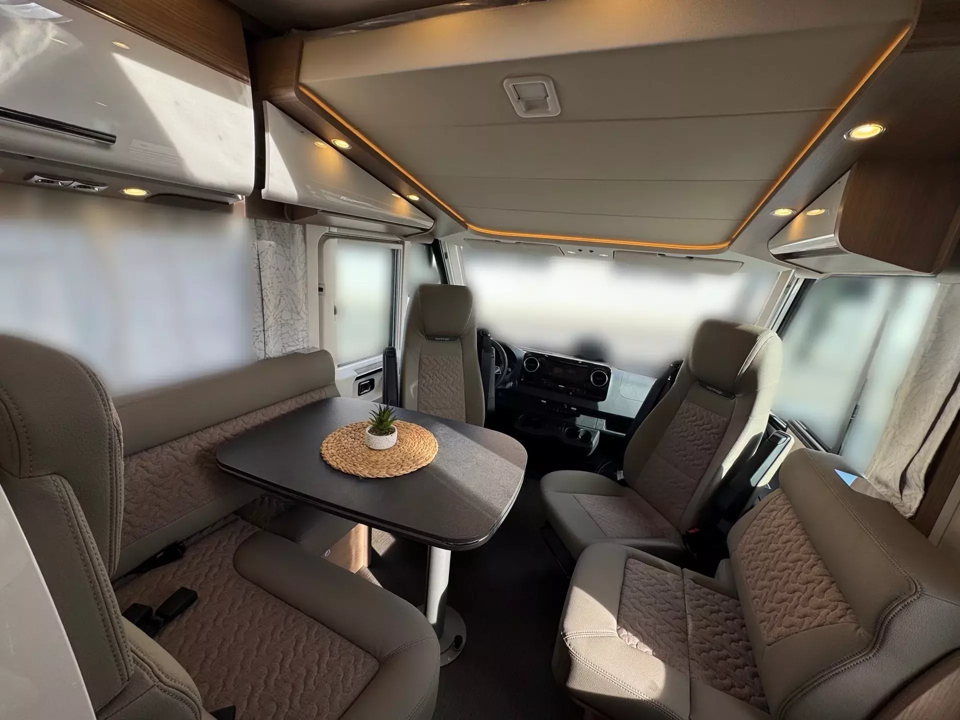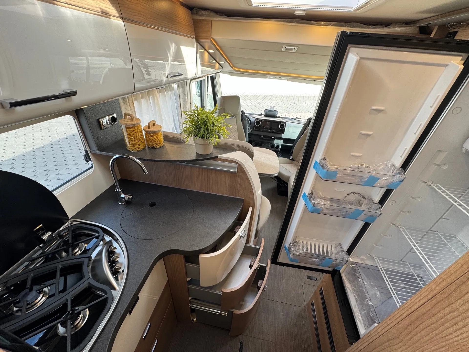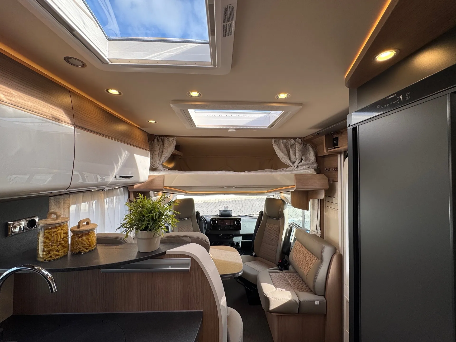 -Basis Plus Paket Mercedes bestehend aus: Vorbereitung Sat-Anlage; USB-Steckdose im Dachstauschrank über Heckbett; Abwasserschlauchset zur komfortablen Entsorgung; Insektenschutzrollo Aufbautüre; Kraftstofftank 92 Liter; Vorbereitung Rückfahrkamera (Einzellinse); Wärmedämmendes Glas mit Bandfilter an der Frontscheibe; Fahrerhausverdunklungssystem Plissee an Front- und Seitenscheiben; Elektrische Feststellbremse; Verkehrszeichenassistent (MERCEDES); Kombiinstrument mit Farbdisplay; Fahrerhaussitze mit Neigungs- und Höhenverstellung (vorn / hinten); Regensensor; Lenkrad mit Höhen- und Neigungsverstellung; Vorbereitung Solaranlage; Vorderachse mit erhöhter Traglast; Radiovorbereitung mit Dachantenne mit DAB+, Lautsprecher (4x), DVB-T2 Empfang; Ladebooster; Mercedes MBUX 10,2" Multimediasystem anstelle Radio/CD/DVD Doppel DIN inkl. Navigation, DAB +, Touchscreen; Große Rollergaragentür auf der Fahrerseite; Vorbereitung Dachhaubenlüfter elektrisch; Multifunktions- und Lederlenkrad mit Höhen- und Neigungsverstellung; Dachkuppel Midi-Heki mit LED-Spots über L-Wohnsitzgruppe; SOG-Toilettenlüftung über Boden