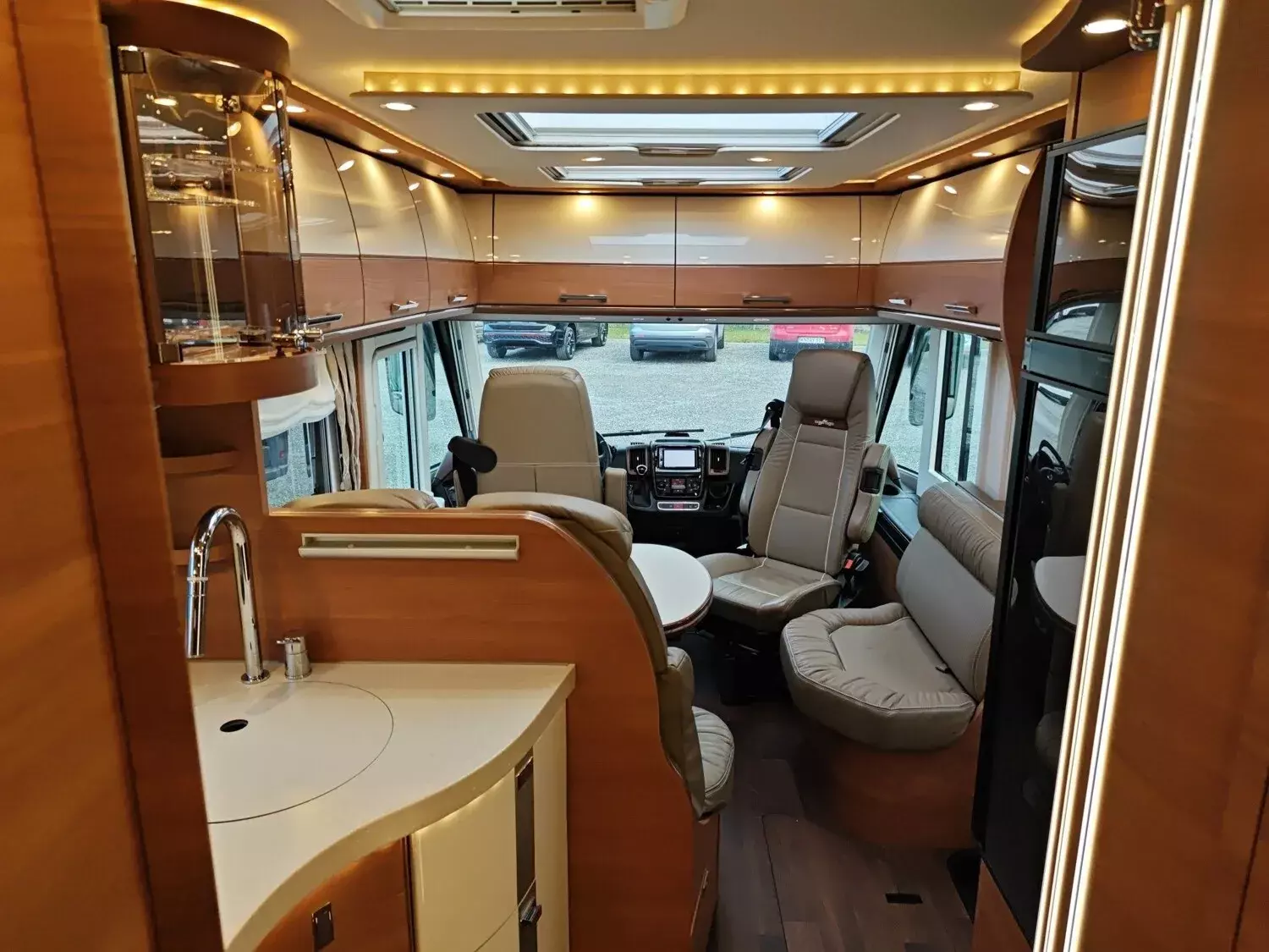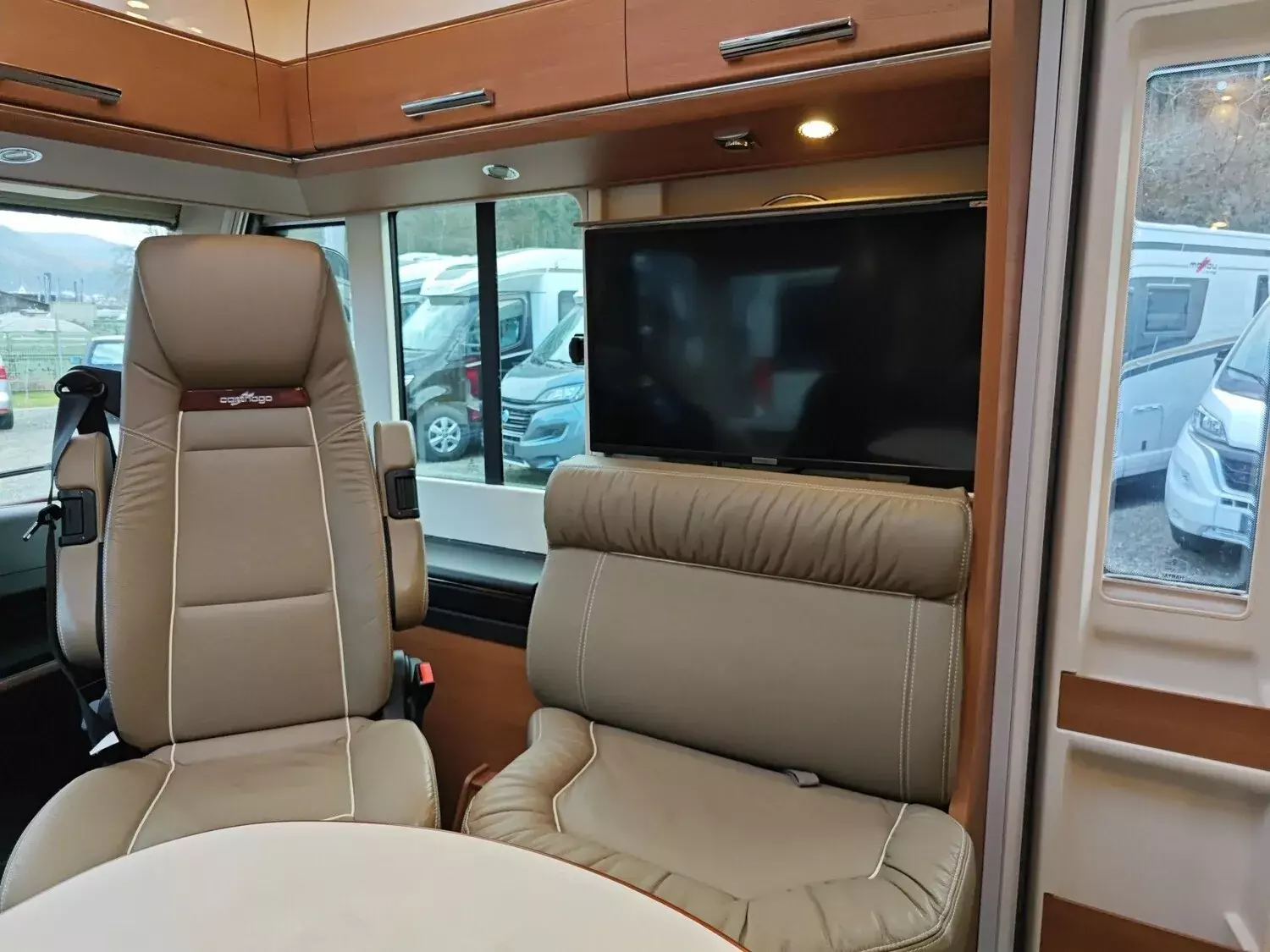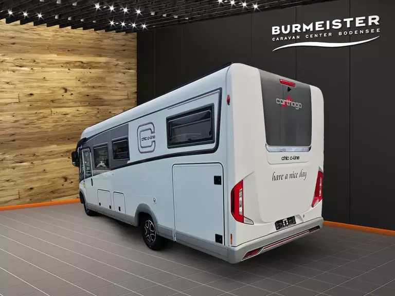 - Super-Paket (Klimaautomatik Fahrerhaus, Tempomat, Ladebooster, Fahrerhaussitze mit Neigungs- und Höhenverstellung (vorn / hinten), Armaturenbrettveredelung mit Edelholzapplikation und Lüftungsgitter in bronze, Kurbel-Heckstützen zur Wankstabilisierung im Stand, Busspiegel "Carthago bestview" mit Einstiegsbeleuchtung, elektrisch verstell- und beheizbar, Zentralverriegelung Fahrerhaustüren und Aufbautür, mit Funktion "coming home", Rollergaragen-Upgrade mit Nadelfilz, Gepäcknetzen, Befestigungssystem, SOG-Toilettenentlüftung über Dachkamin, Truma DuoControl CS, Barschrank mit Gläserhalter und Glas-Set über Küche, USB-Steckdose im Dachstauschrank über Heckbett, Vorbereitung Solaranlage, Vorbereitung Sat-Anlage, Vorbereitung Rückfahrkamera (Einzellinse), Radio / DVD Doppel DIN DAB+, Touchscreen, Radiovorb., Dachantenne, Lautsprecher (4x), Rückfahrkamerasystem mit Einzellinse, inkl. 7" Farbmonitor seitlich im Armaturenbrett)