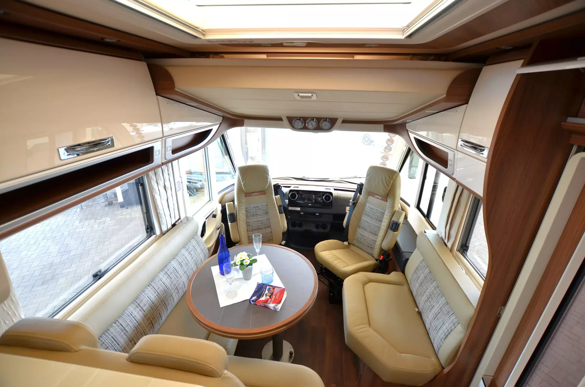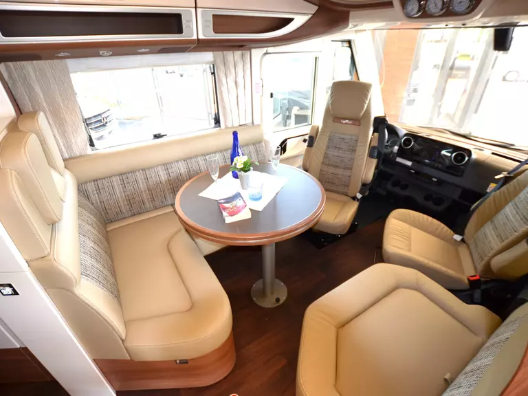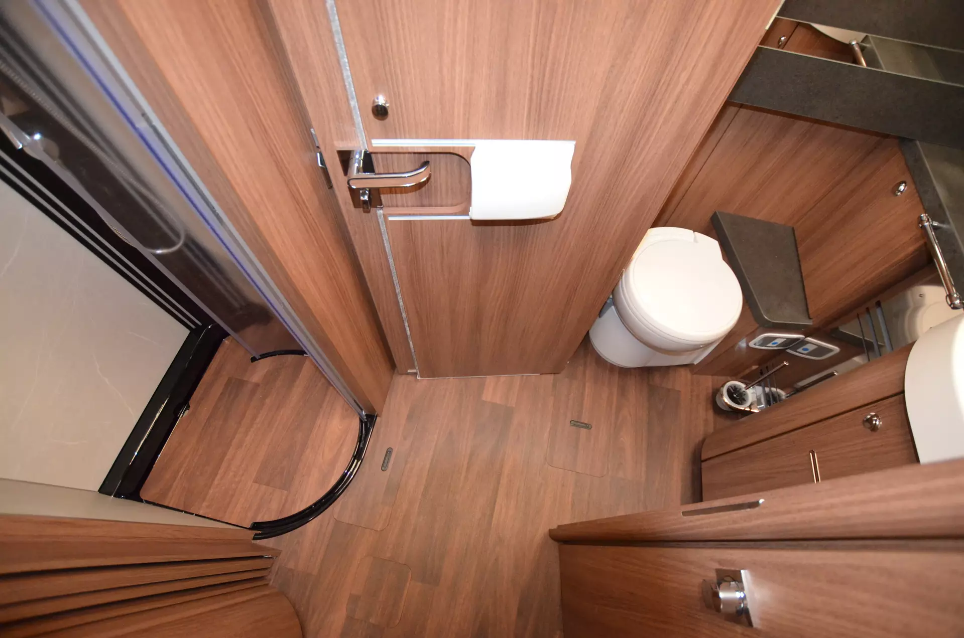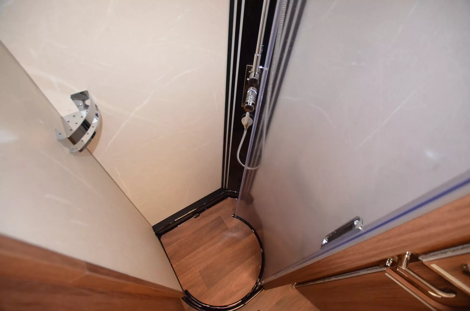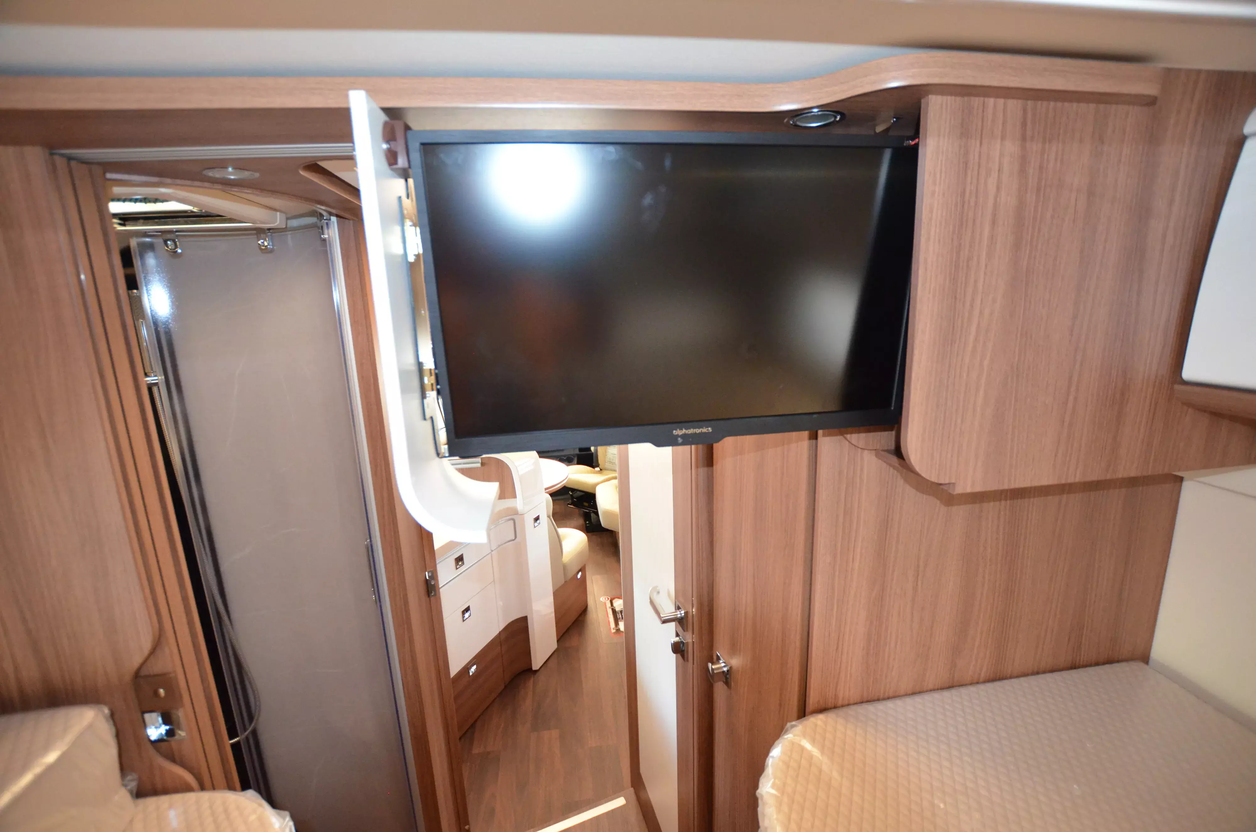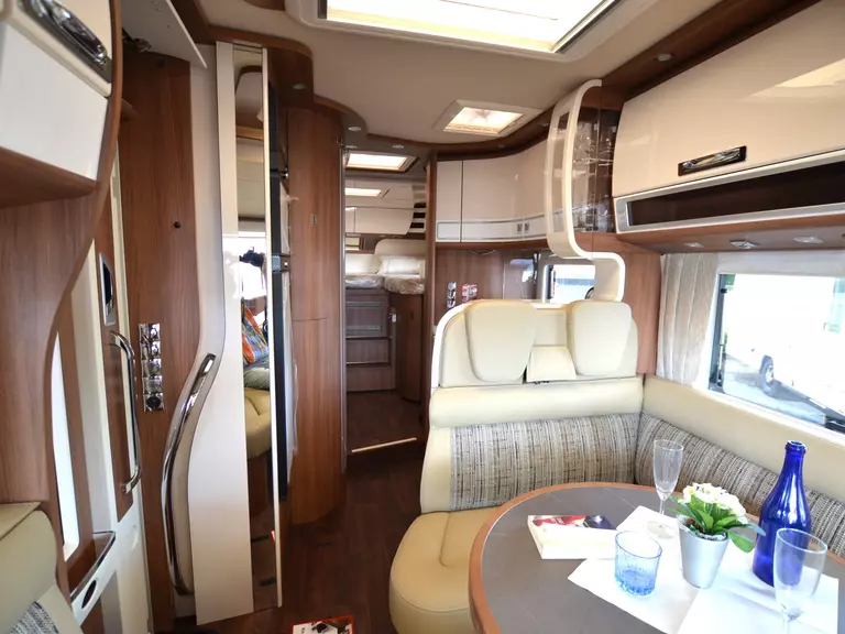 Hochwertiges, gut ausgestattetes Doppelachse Reisemobil mit Mercedes Automatik, separater Dusche, hohem Kleiderschrank, ALDE Warmwasserheizung und Einzelbetten.