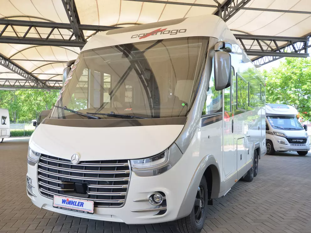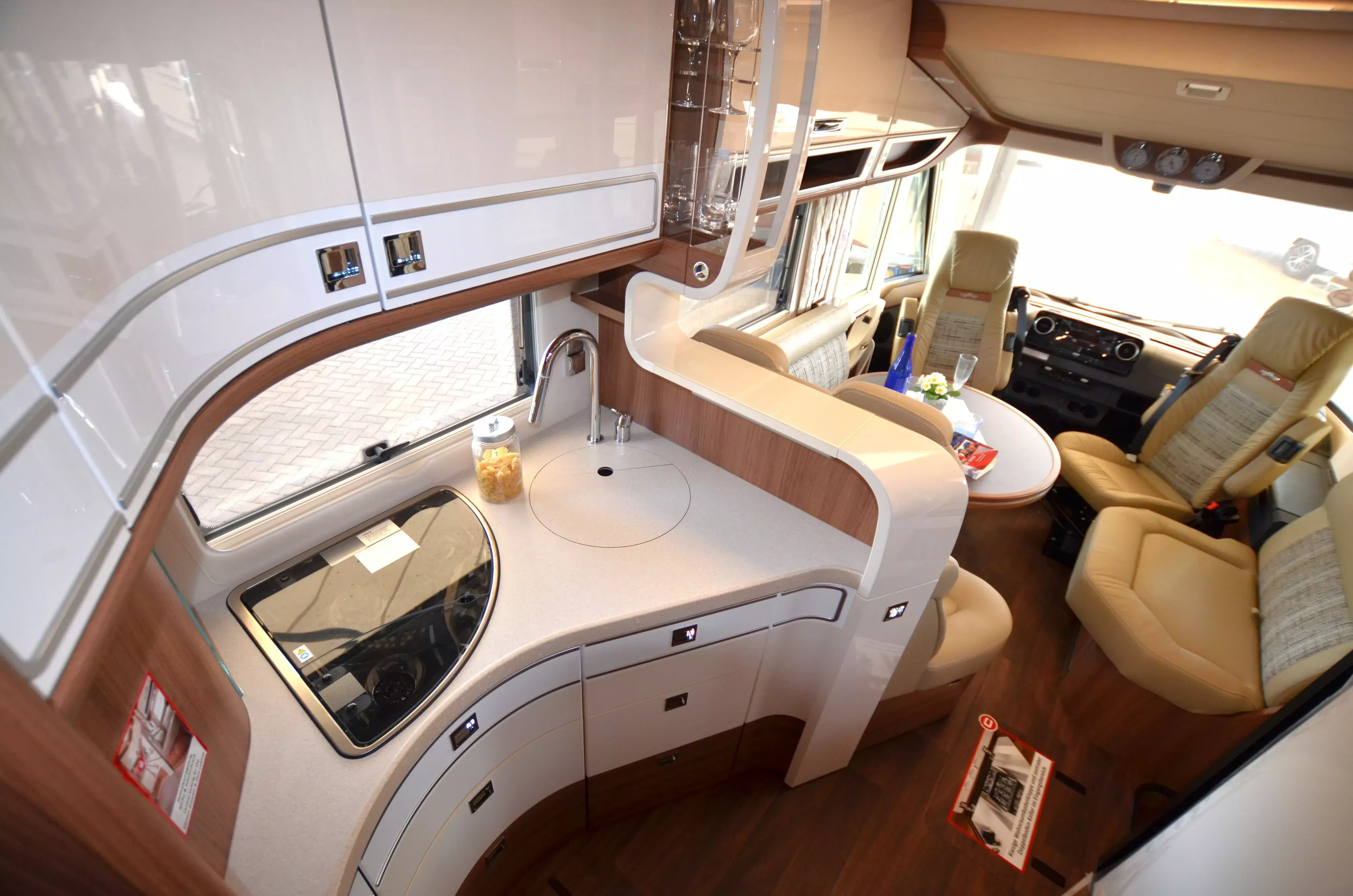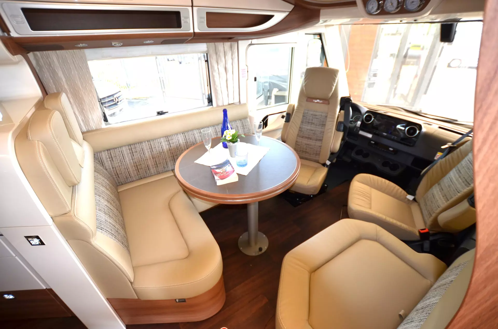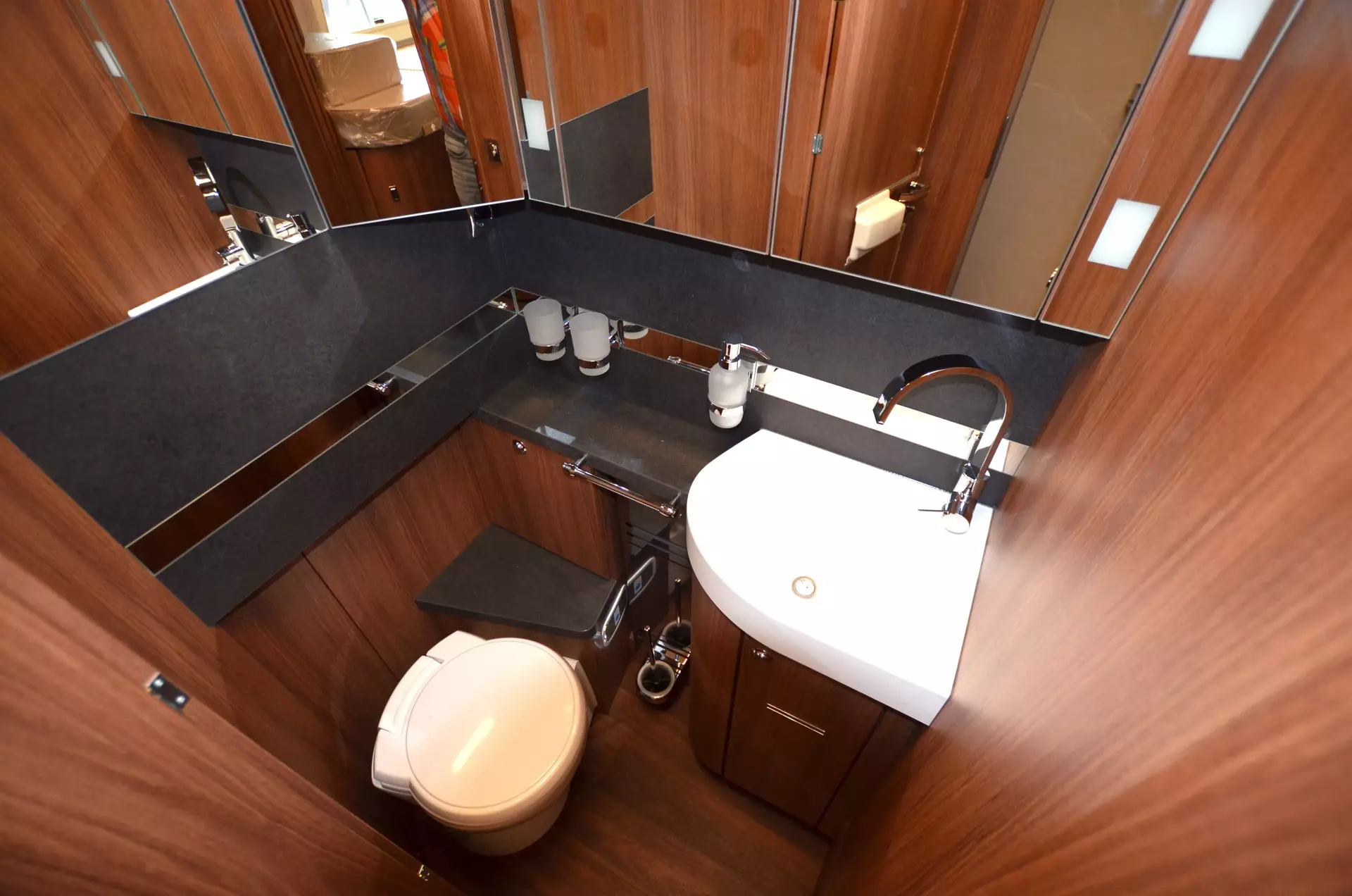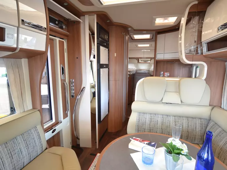 Hochwertiges, gut ausgestattetes Doppelachse Reisemobil mit Mercedes Automatik, separater Dusche, hohem Kleiderschrank, ALDE Warmwasserheizung und Einzelbetten.