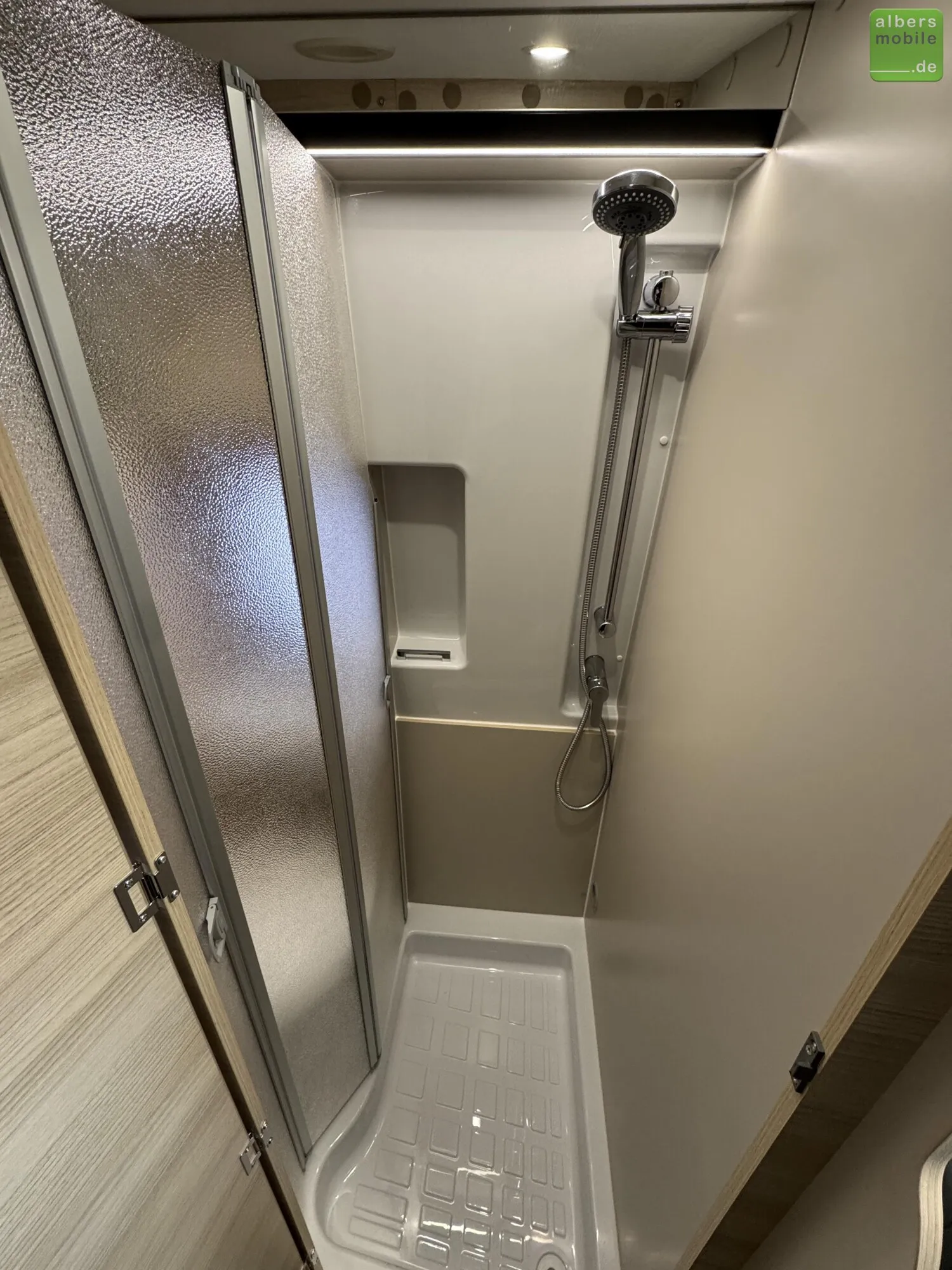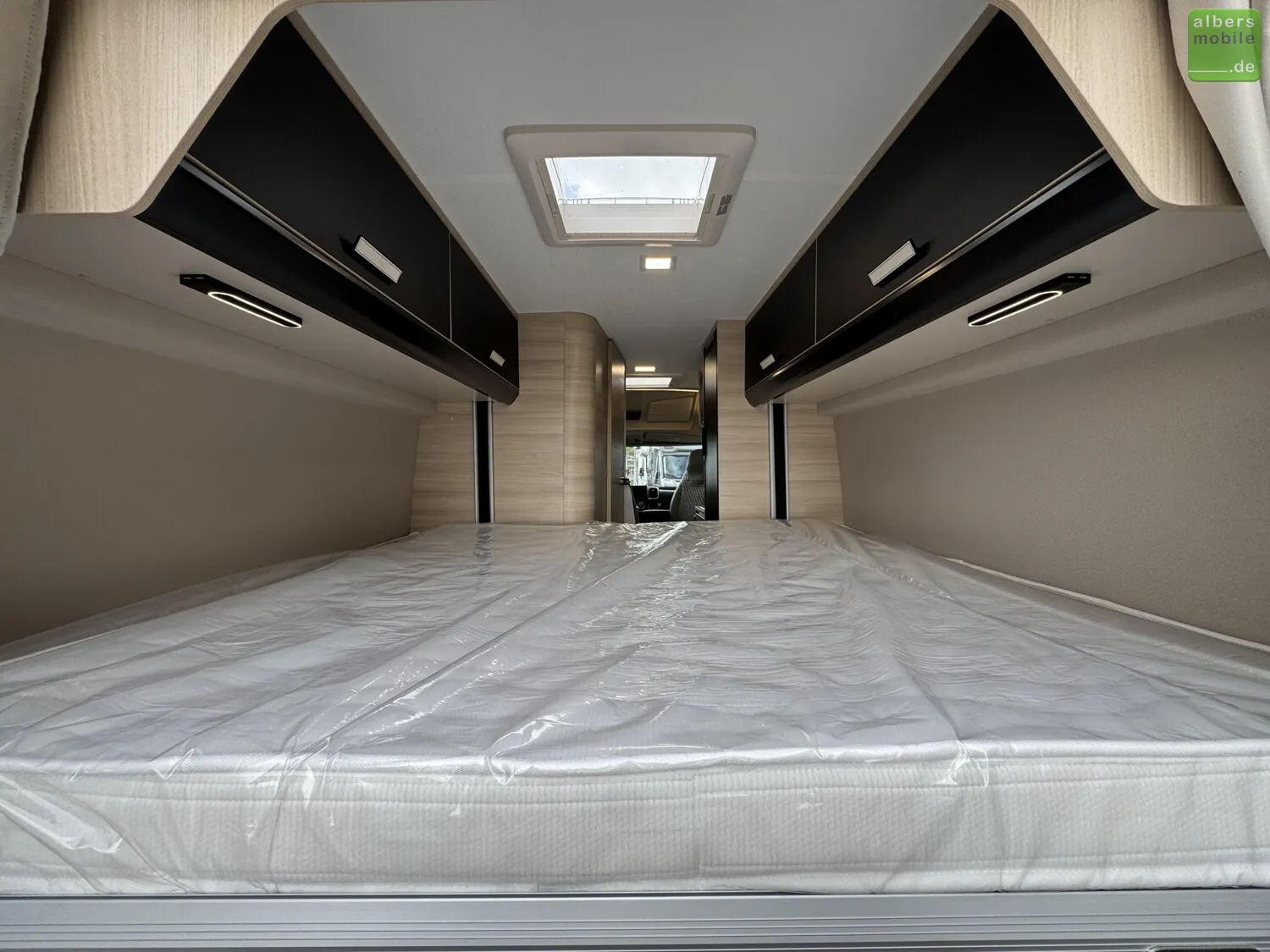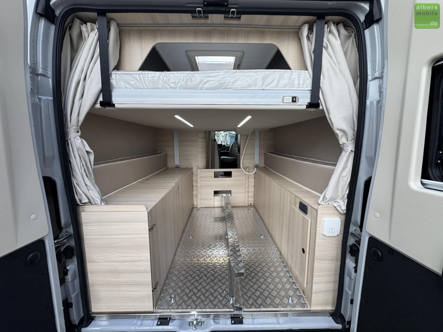 Bislang musste man bei einem Kastenwagen immer zwischen Garage und Bett wählen. Der V210 verfügt jedoch über eine echte Garage (für zwei Fahrräder) sowie ein echtes XXL-Bett. Das Geheimnis? Ein elektrisches Hubbett (über der Garage), welches bei nicht genutzter Garage auch ohne Leiter zugänglich ist