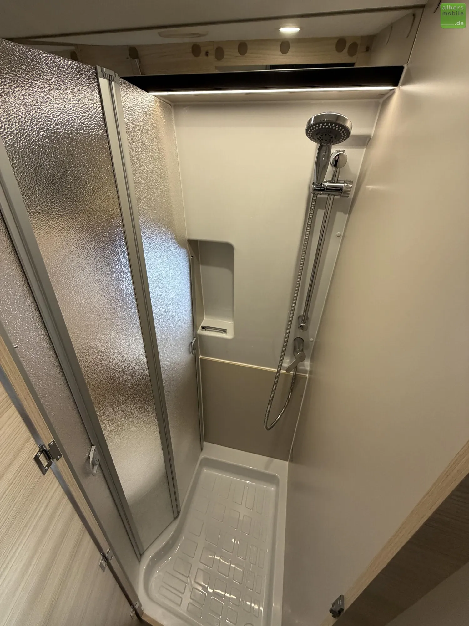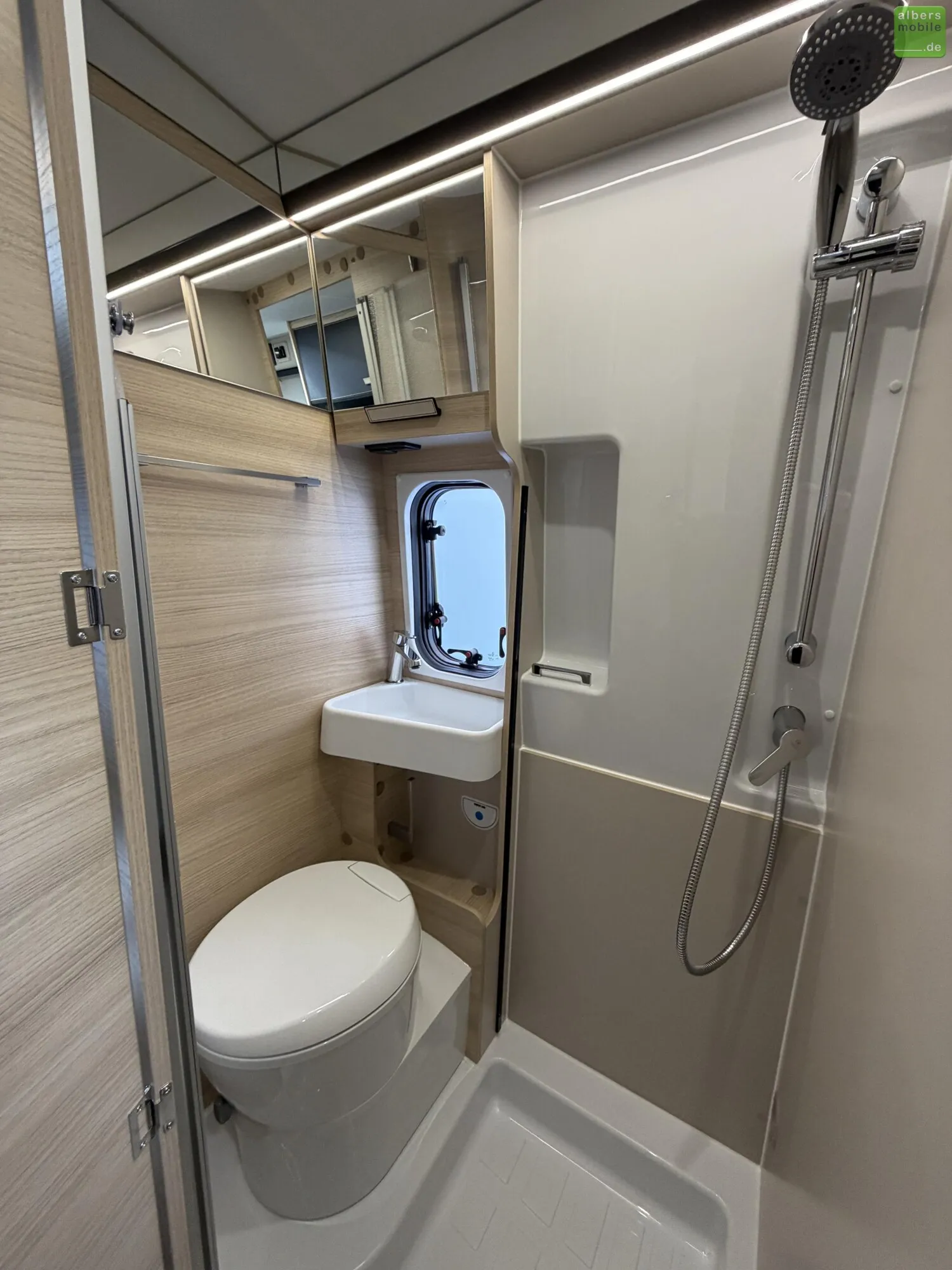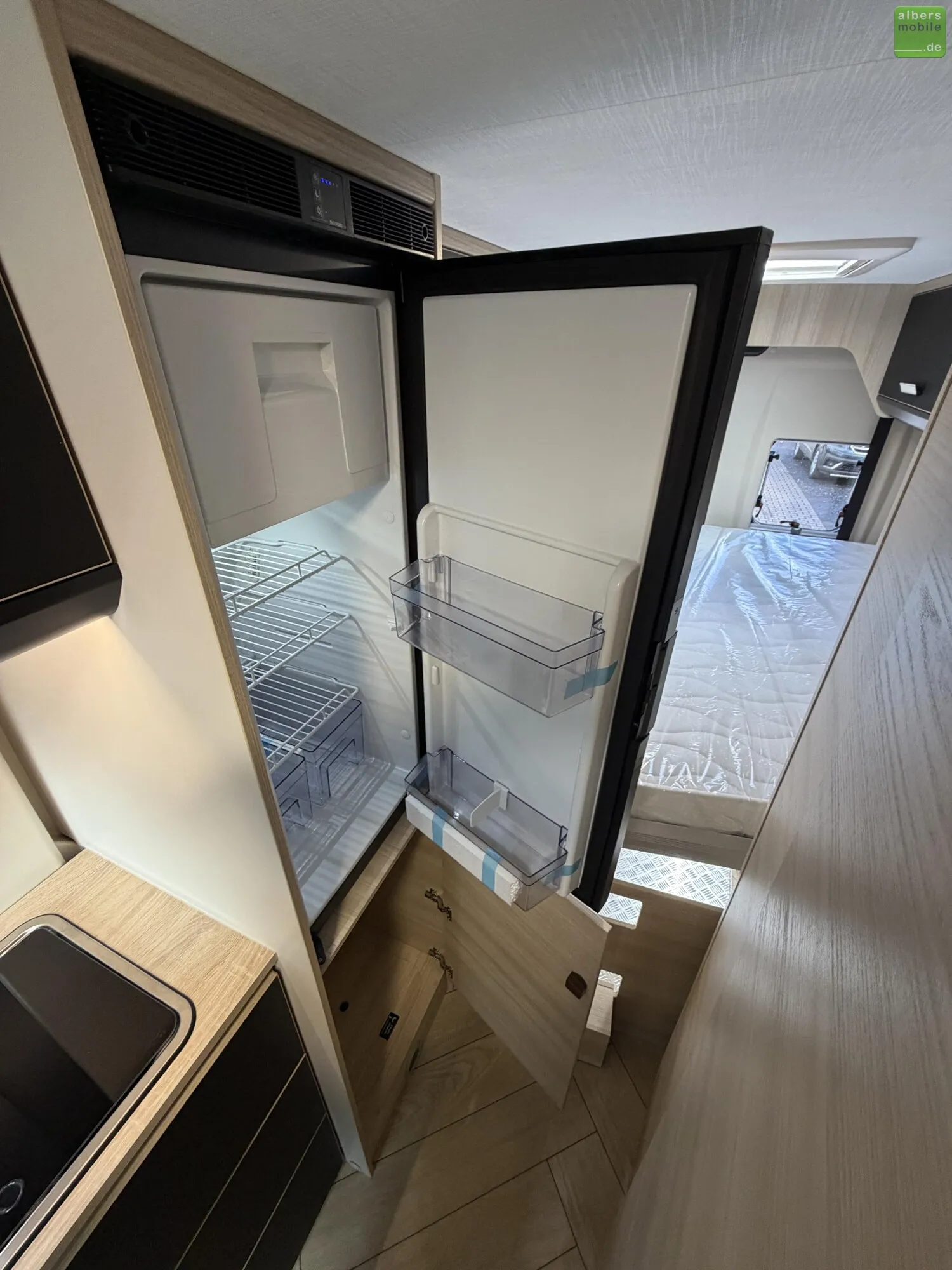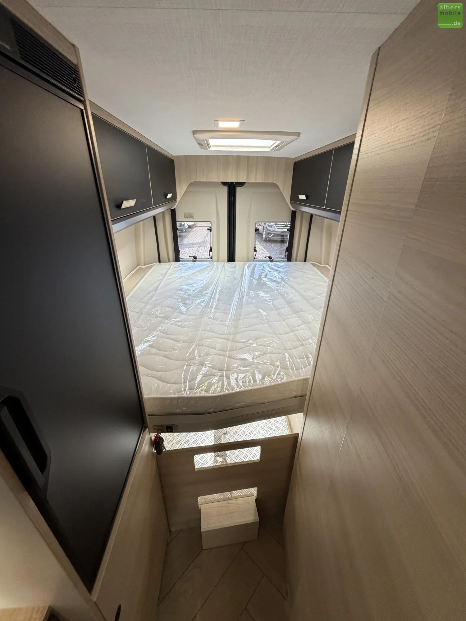 Bislang musste man bei einem Kastenwagen immer zwischen Garage und Bett wählen. Der V210 verfügt jedoch über eine echte Garage (für zwei Fahrräder) sowie ein echtes XXL-Bett. Das Geheimnis? Ein elektrisches Hubbett (über der Garage), welches bei nicht genutzter Garage auch ohne Leiter zugänglich ist