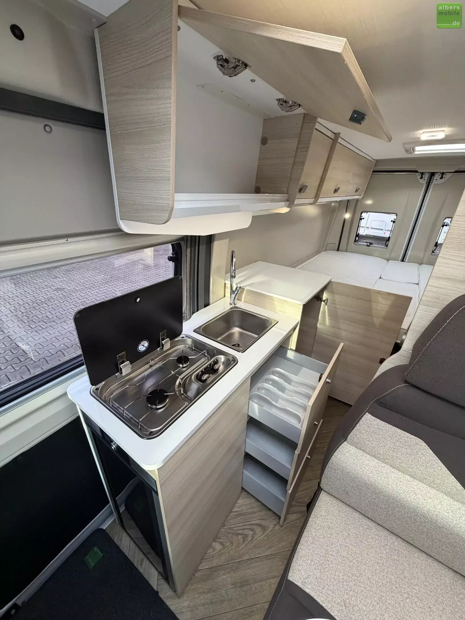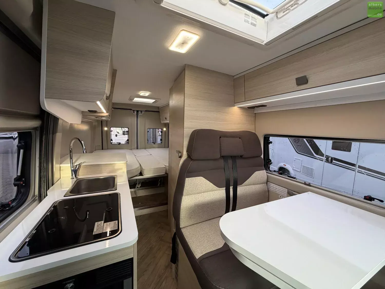 Mit dem V 217 haben Sie 2 große Einzelbetten in einem Van mit nur 6,36 m. Die praktischen Ablagen sowie der Doppelboden unter dem Bett zum Verstauen von Tisch und Stühlen werden Ihnen gefallen. Ideal für ein Paar, das ganz unauffällig überallhin reisen möchte.