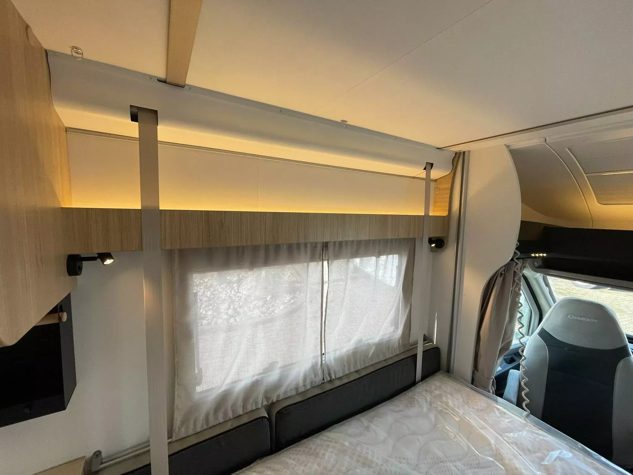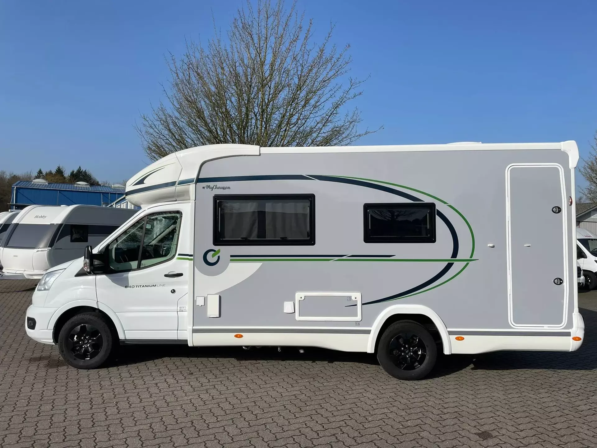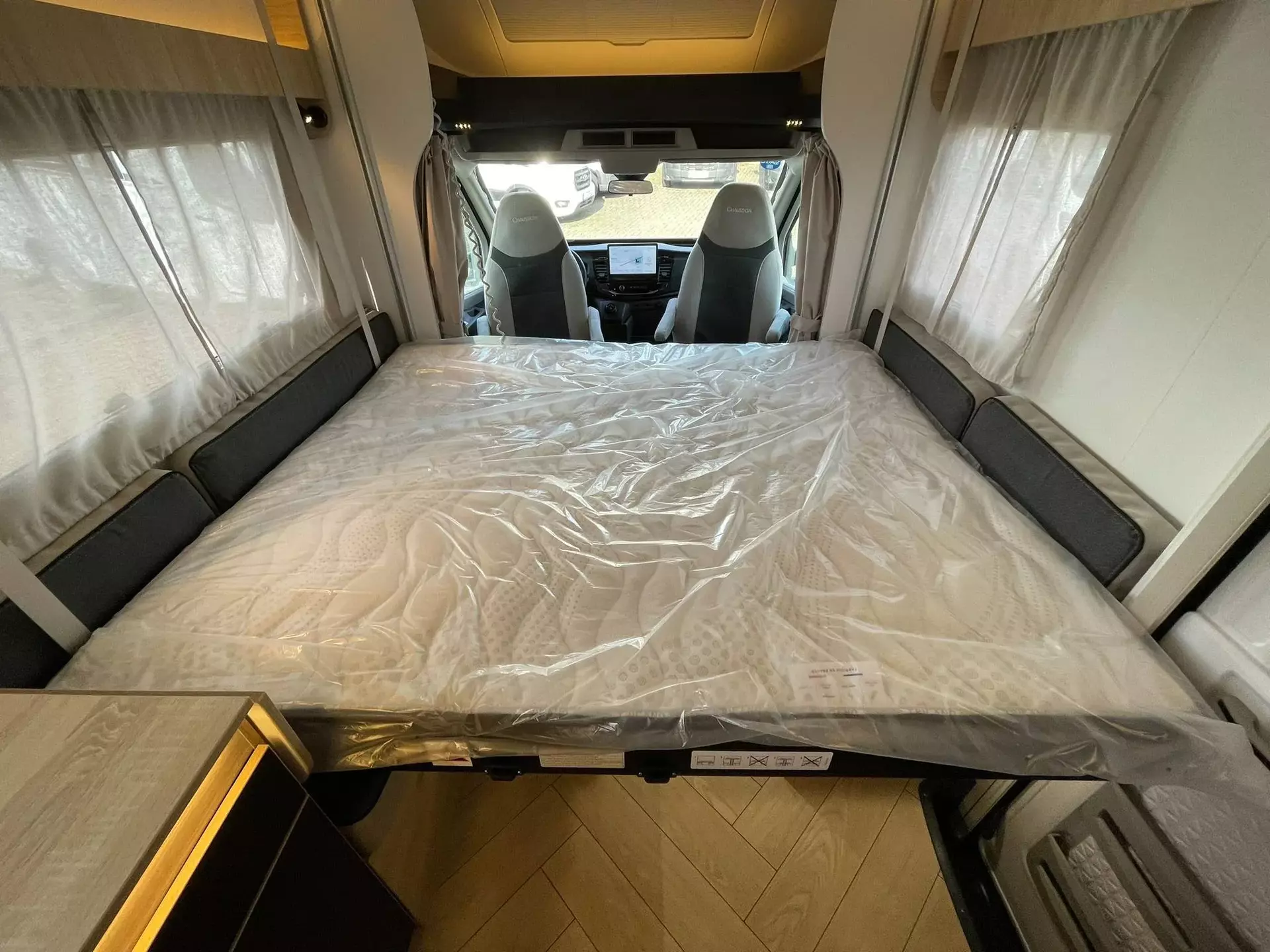 - TITANIUM LINE FORD (2): Panorama-Dachfenster im Fahrerhaus; Panorama-Dachhaube (oder 2 Dachhauben); Schonbezüge für Fahrerhaussitze; Stoßstange in Wagenfarbe lackiert; TV-Vorbereitung; Technibox; Tempomat + Geschwindigkeitsbegrenzer; Trennvorhänge Fahrerhaus/Innenraum; USB-Anschluss/USB-C; Vorbereitung Solarpanel; Vorverkabelung Rückfahrkamera; Weißes Fahrgestell; Isofix; Aufbau-Tür mit Fenster; Kopfteil des Bettes