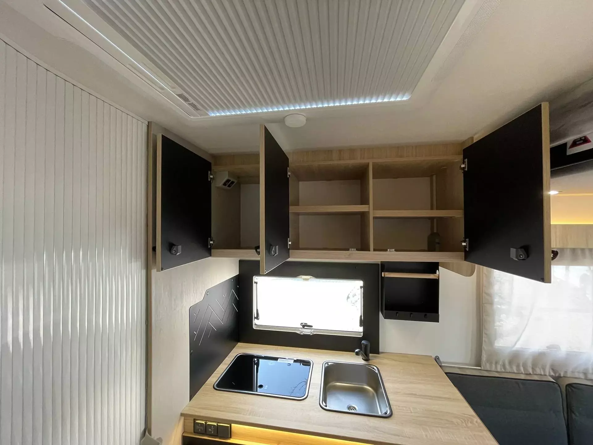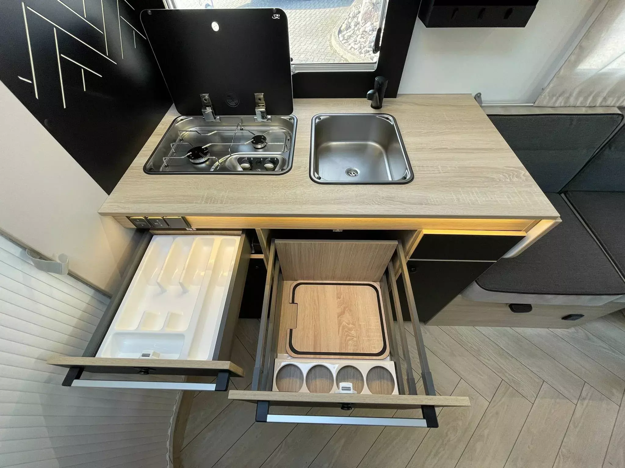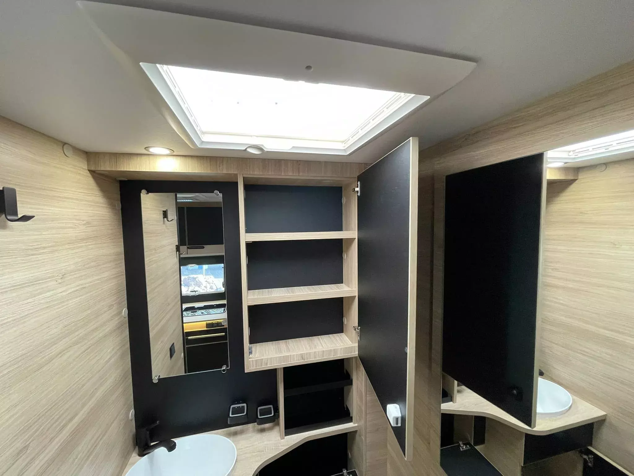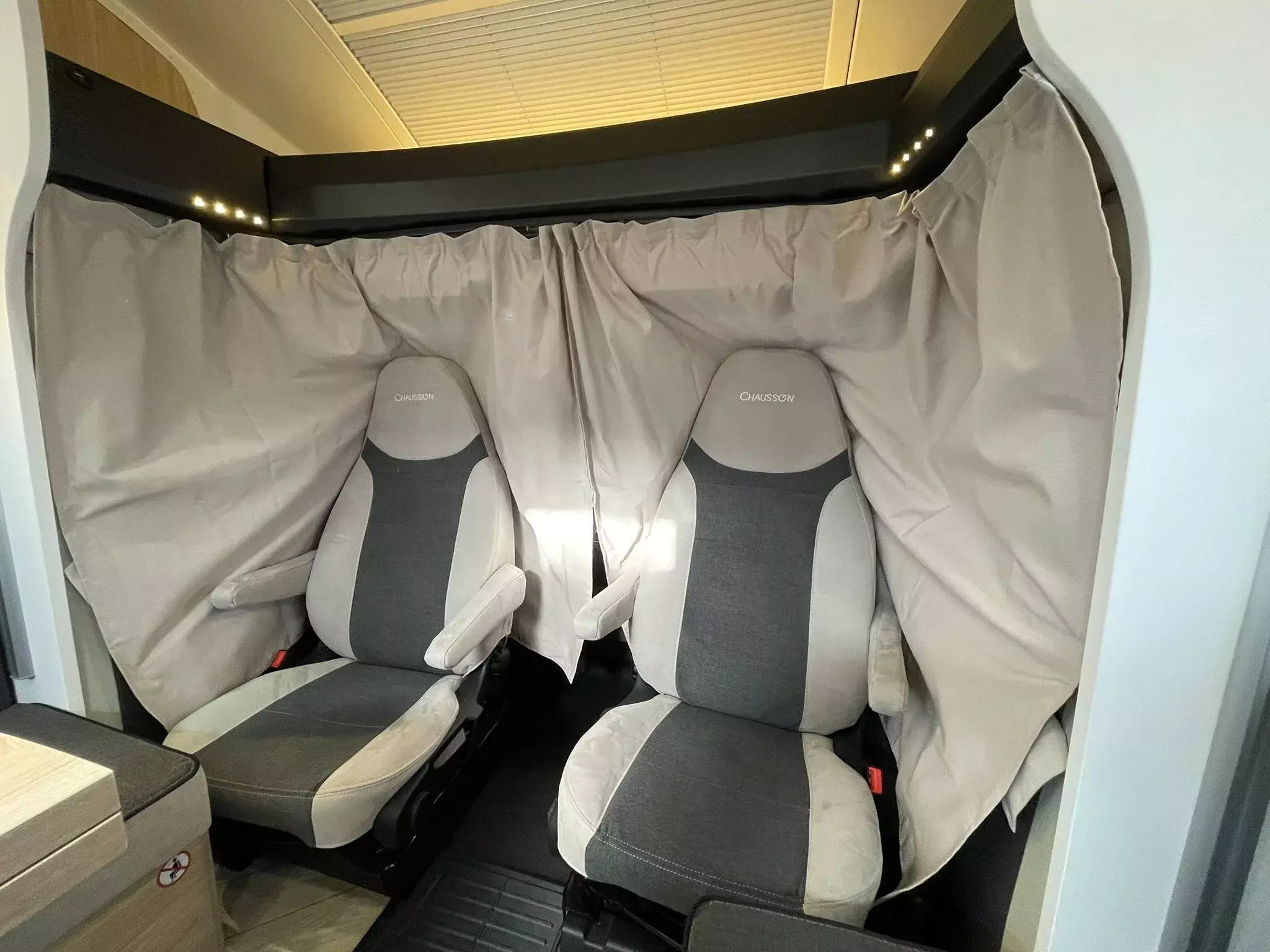 - TITANIUM LINE FORD (2): Panorama-Dachfenster im Fahrerhaus; Panorama-Dachhaube (oder 2 Dachhauben); Schonbezüge für Fahrerhaussitze; Stoßstange in Wagenfarbe lackiert; TV-Vorbereitung; Technibox; Tempomat + Geschwindigkeitsbegrenzer; Trennvorhänge Fahrerhaus/Innenraum; USB-Anschluss/USB-C; Vorbereitung Solarpanel; Vorverkabelung Rückfahrkamera; Weißes Fahrgestell; Isofix; Aufbau-Tür mit Fenster; Kopfteil des Bettes